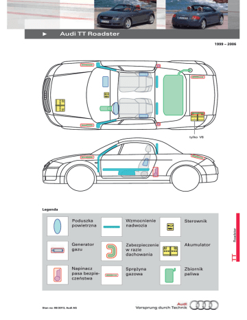 • Audi TT Roadster 1999 – 2006 tylko V6 Wzmocnienie nadwozia Sterownik Generator gazu Zabezpieczenie w razie dachowania Akumulator Napinacz pasa bezpieczeństwa Sprężyna gazowa Zbiornik paliwa Stan na: 08/2013, Audi AG TT Poduszka powietrzna Roadster Legenda