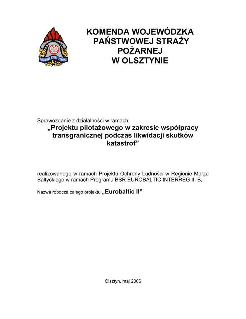 KOMENDA WOJEWÓDZKA PAŃSTWOWEJ STRAŻY POŻARNEJ W OLSZTYNIE Sprawozdanie z działalności w ramach: „Projektu pilotażowego w zakresie współpracy transgranicznej podczas likwidacji skutków katastrof” realizowanego w ramach Projektu Ochrony Ludności w Regionie Morza Bałtyckiego w ramach Programu BSR EUROBALTIC INTERREG III B, Nazwa robocza całego projektu „Eurobaltic II” Olsztyn, maj 2006 Zarządzeniem nr 25/05 Warmińsko-Mazurskiego Komendanta Wojewódzkiego Państwowej Straży Pożarnej powołano zespół do spraw koordynacji oraz zespół roboczy do spraw realizacji projektu pilotażowego. W skład zespołów wchodzą: I. Zespół do spraw koordynacji projektu: 1. bryg. Mariusz Mierzejewski – przewodniczący, Zastępca WarmińskoMazurskiego Komendanta Wojewódzkiego Państwowej Straży Pożarnej, 2. st. kpt. Stanisław Wasiłowski – członek, Naczelnik Wydziału Operacyjnego KW PSP w Olsztynie, 3. st. kpt. Zbigniew Łupina – członek, Naczelnik Wydziału Kwatermistrzowskiego KW PSP w Olsztynie, 4. kpt. Stefania Bogorodź – członek, Główny Księgowy KW PSP w Olsztynie. II. Zespół do spraw realizacji projektu: 1. st. kpt. Michał Kamieniecki – przewodniczący, Zastępca Naczelnika Wydziału Operacyjnego KW PSP w Olsztynie, 2. kpt. Przemysław Lech – członek, Młodszy Specjalista w Wydziale Operacyjnym KW PSP w Olsztynie, 3. mł. kpt. Szymon Kokot – członek, Młodszy Specjalista w Wydziale Organizacji i Nadzoru KW PSP w Olsztynie, 4. Ewa Kozakiewicz – członek, Zastępca Głównego Księgowego KW PSP w Olsztynie, 5. str. Anna Zmitrowicz – członek, Stażystka w Wydziale Kwatermistrzowskim KW PSP w Olsztynie. Kontakt z członkami zespołów: tel.: 089 522 95 00, fax.: 089 522 95 05, E-Mail: [email protected], [email protected], [email protected], [email protected]. Rozpoczęciem prac w ramach projektu była seria spotkań Zastępcy WarmińskoMazurskiego Komendanta PSP, bryg. Mariusza Mierzejewskiego z przedstawicielami krajowych służb, instytucji oraz firm, które planowano zaprosić do udziału w projekcie. Następnie odbyło się kilka spotkań roboczych zespołów powołanych ww. Zarządzeniem w KW PSP w Olsztynie. Ponadto przeprowadzono dwa istotne spotkania międzynarodowe partnerów projektu oraz uczestniczono spotkaniu „Kick-off” w Szkole Głównej Służby Pożarniczej. W lutym miała miejsce wizyta delegacji służb ratowniczych z Obwodu Kaliningradzkiego Federacji Rosyjskiej oraz Republiki Litwy (Region Kłajpedy) w Olsztynie. W dniach 28.02-01.03.2006 odbyły się dwa spotkania robocze partnerów projektu pilotażowego (w Olsztynie oraz w Elblągu), w czasie których omówiono kwestie związane z rozpoczęciem realizacji projektu oraz jego dalszym przebiegiem a także dokonano wstępnego zapoznania uczestników spotkania z organizacją systemu ochrony ludności w każdym z państw biorących udział w „Projekcie pilotażowym...”. W drugim spotkaniu uczestniczyli również przedstawiciele KM PSP w Elblągu, KP PSP w Braniewie oraz Urzędu Miasta w Braniewie. Następnie, w dniu 2.03.2006 delegacje wraz z przedstawicielami KW PSP w Olsztynie udały się do Warszawy w celu uczestniczenia w spotkaniu „Kick-off”. Kolejnym zaplanowanym etapem współpracy była realizacja warsztatówćwiczeń sztabowych w dniach 19-21.04.2006 r. w Kadynach k. Tolkmicka. W warsztatach, oprócz Partnerów Projektu, udział brali przedstawiciele: KG PSP, KW PSP w Gdańsku, KM PSP w Elblągu, KP PSP w Braniewie, KP PSP w Nowym Dworze Gdańskim, P.U. OIKOS Sp. z. o. o., Morskiej Służby Poszukiwania i Ratownictwa, Warmińsko-Mazurskiego Oddziału Straży Granicznej w Kętrzynie, Morskiego Oddziału Straży Granicznej w Gdańsku oraz Izby Celnej w Olsztynie. W drugim dniu warsztatów lokalne media (telewizja oraz radio) przeprowadziły serię wywiadów z przedstawicielami służb i instytucji zaangażowanych w realizację projektu. Warsztaty zaowocowały szeroką wymianą informacji oraz doświadczeń oraz przyczyniły się do ustalenia scenariusza międzynarodowych ćwiczeń i przebiegu międzynarodowego seminarium, których to realizację zaplanowano na wrzesień br. (IREN 2006). Omówiono i rozwiązano niektóre trudności związane z alarmowym przekraczaniem granicy oraz udziałem sił i środków spoza PSP w ćwiczeniach IREN 2006. Zaproszono do współpracy firmę OIKOS sp. z. o. o., która posiada wieloletnie doświadczenie w dziedzinie ochrony środowiska naturalnego oraz w tworzeniu analiz zagrożeń i ekspertyz powypadkowych. Jako ekspert zewnętrzny, firma uczestniczyć będzie w opracowaniu materiałów związanych z realizacją ćwiczeń. Również obecność przedstawicieli władz lokalnych pozwoli na pobudzenie samorządów do współdziałania ze służbami ratowniczymi w ramach ćwiczeń oraz prawdziwych zdarzeń w przyszłości. Lista uczestników ważniejszych spotkań: I. Wizyta delegacji służb ratowniczych, 28.02-01.03.2006 r.: Aleksander A. Borsuchenko – Rosja Andrey V. Shemiakin – Rosja, Dimitriy G. Rabushok – Rosja, Julita Morkunaite – Litwa, Algimantas Kloviskis – Litwa, Kastytis Gedminas – Litwa, Mariusz Mierzejewski – Polska, Przemysław Lech – Polska, Szymon Kokot – Polska. II. Warsztaty – ćwiczenia sztabowe, 19-21.02.2006 r.: Józef Zajączkiewicz - Warmińsko-Mazurski Komendant Wojewódzki PSP, Mariusz Mierzejewski - Zastępca Warmińsko-Mazurskiego Komendanta Wojewódzkiego PSP, Stanisław Wasiłowski - Naczelnik Wydziału Operacyjnego KW PSP w Olsztynie, Michał Kamieniecki -Zastępca Naczelnika Wydziału Operacyjnego KW PSP w Olsztynie, Przemysław Lech - Młodszy Specjalista w Wydziale Operacyjnym KW PSP w Olsztynie, Szymon Kokot - Młodszy Specjalista w Wydziale Organizacji i Nadzoru KW PSP w Olsztynie, Aleksander A. Borsuchenko - koordynator ds. współpracy międzynarodowej, Główny Urząd Ministerstwa Federacji Rosyjskiej do spraw Obrony Cywilnej, Sytuacji Nadzwyczajnych oraz Likwidacji Klęs