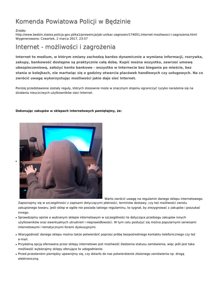 Komenda Powiatowa Policji w Będzinie Źródło: http://www.bedzin.slaska.policja.gov.pl/ka1/prewencja/jak-unikac-zagrozen/174051,Internet-mozliwosci-i-zagrozenia.html Wygenerowano: Czwartek, 2 marca 2017, 23:57 Internet - możliwości i zagrożenia Internet to medium, w którym zmiany zachodzą bardzo dynamicznie a wymiana informacji, rozrywka, zakupy, bankowość dostępne są praktycznie całą dobę. Kupić można wszystko, zawrzeć umowę ubezpieczeniową, założyć konto bankowe - wszystko w Internecie bez biegania po mieście, bez stania w kolejkach, nie martwiąc się o godziny otwarcia placówek handlowych czy usługowych. Na co zwrócić uwagę wykorzystując możliwości jakie daje sieć Internet. Poniżej przedstawione zostały reguły, których stosownie może w znacznym stopniu ograniczyć ryzyko narażenia się na działania nieuczciwych użytkowników sieci Internet. Dokonując zakupów w sklepach internetowych pamiętajmy, że: ● Warto zwrócić uwagę na regulamin danego sklepu internetowego. Zapoznajmy się w szczególności z zapisami dotyczącymi płatności, terminów dostawy, czy też możliwości zwrotu zakupionego towaru. Jeśli sklep w ogóle nie posiada takiego regulaminu, to sygnał, by zrezygnować z zakupów i poszukać innego. ● Sprawdzajmy opinie o wybranym sklepie internetowym w szczególności te dotyczące przebiegu zakupów innych użytkowników oraz ewentualnych utrudnień i nieprawidłowości. W tym celu posłużyć się można popularnymi serwisami internetowymi i tematycznymi forami dyskusyjnymi. ● Wiarygodność danego sklepu można także potwierdzić poprzez próbę bezpośredniego kontaktu telefonicznego czy też e-mail. ● Przydatną opcją oferowana przez sklepy internetowe jest możliwość śledzenia statusu zamówienia, więc jeśli jest taka możliwość wybierajmy sklepy oferujące to udogodnienie. ● Przed przesłaniem pieniędzy upewnijmy się, czy dotarło do nas potwierdzenie złożonego zamówienia np. drogą elektroniczną. Kiedy korzystamy z aukcji internetowych: ● Zawsze przed transakcją zapoznajmy się z komentarzami danego użytkownika portalu aukcyjnego oraz pamiętajmy, że sama ilość pozytywnych komentarzy nie jest jedynym wyznacznikiem uczciwości danego internauty. ● Pamiętajmy również o tym, że podobnie jak w świecie rzeczywistym w internecie nie ma tzw. „okazji”, nikt nam nie sprzeda samochodu czy roweru za połowę jego wartości skoro może otrzymać dużo wyższą cenę za oferowany towar. Dlatego też, nie wysyłajmy zaliczek czy przedpłat na konta osób, które takie okazje nam oferują. Zbyt niska cena też może sugerować ryzyko oszustwa. ● Na fakt, iż bierzemy udział w aukcji nieuczciwego sprzedawcy, może wskazywać też sam jej opis i załączone do niej zdjęcia, jeżeli nie są one wykonane przez sprzedającego, a pochodzą np. ze strony producenta danego przedmiotu lub aukcji innego użytkownika, może to świadczyć, iż sprzedający nie jest w posiadaniu wystawianego na sprzedaż towaru. ● Powinniśmy także zachować szczególną ostrożność, jeśli interesujący nas przedmiot oferowany jest na aukcji opisanej „łamaną polszczyzną” lub bez polskich znaków. ● Jeśli w trakcie trwania danej aukcji pojawią się jakiekolwiek wątpliwości co do uczciwości sprzedającego zastanówmy się nad rezygnacją z udziału w tej aukcji i ewentualnym odstąpieniem od transakcji. ● Wystrzegajmy się także finalizacji danej transakcji przez tzw. „zakup poza aukcją”, zachęceni przez sprzedającego niższą ceną danego towaru. W przypadku oszustwa, późniejsze dochodzenie swoich roszczeń, jak i postępowanie dowodowe w takiej sytuacji jest bardziej utrudnione. ● Przed dokonaniem zapłaty skontaktujmy się ze sprzedającym – im więcej informacji o sobie udostępnia (np. adres i telefon) tym mniejsze ryzyko dla nas jako kupujących. ● Opcję „przedpłaty na konto” wybierajmy tylko wtedy kiedy finalizujemy transakcję u doświadczonych i pozytywnie opiniowanych sprzedawców. ● Jeśli istnieje taka możliwość, wybierajmy funkcję depozytową portalu aukcyjnego i unikajmy transakcji z osobami, które nie chcą się zgodzić na taką formę płatności. ● Jeżeli wybraliśmy przesyłkę za zaliczeniem pocztowym – otwórzmy paczkę przy pracowniku poczty lub kurierze, w przypadku ujawnienia oszustwa, należy spisać protokół i złożyć zawiadomienie na Policji. ● Jeśli po aukcji zakończonej sprzedażą okaże się, że kupujący pochodzi z zagranicy, nie wysyłajmy towaru, dopóki pieniądze nie zostaną zaksięgowane na naszym koncie bankowym. Bardzo ostrożnie traktujmy informacje od kupującego zapewniającego nas o tym, że pieniądze zostały przelane, jednak z różnych przyczyn chwilowo wstrzymano ich zaksięgowanie, na co potwierdzeniem mają być przedstawiane przez kontrahenta, zazwyczaj spreparowane, dowody wpłat (najczęściej są to dokument w formacie *.pdf). ● Nie logujmy się na swoje konto w serwisie aukcyjnym z obcego komputera (np. w kafejce internetowej, u znajomego itp.), gdyż nie mamy pewności, że na danym komputerze nie jest uruchomione oprogramowanie do pozyskiwania informacji, które to powinny być znane tylko nam lub nawet czy jest na nim zainstalowany program antywirusowy z aktualnymi bazami złośliwego oprogramowania. ● Nie przekazujmy żadnych danych w odpowiedzi na zapytania od rzekomych administratorów serwisów aukcyjnego, są to preparowane przez oszustów e-maile służące przejęciu naszego konta użytkownika. Zasady bezpiecznego korzystania z bankowości elektronicznej: ● Pamiętajmy, żaden bank nigdy nie wysyła do swoich klientów pytań dotyczących haseł lub innych poufnych danych ani próśb o ich aktualizację. ● Sprawdźmy na stronie banku jakie zabezpieczenia stosowane są w serwisie internetowym. Przy każdym logowaniu bezwzględnie stosujmy się do zasad bezpieczeństwa tam opublikowan