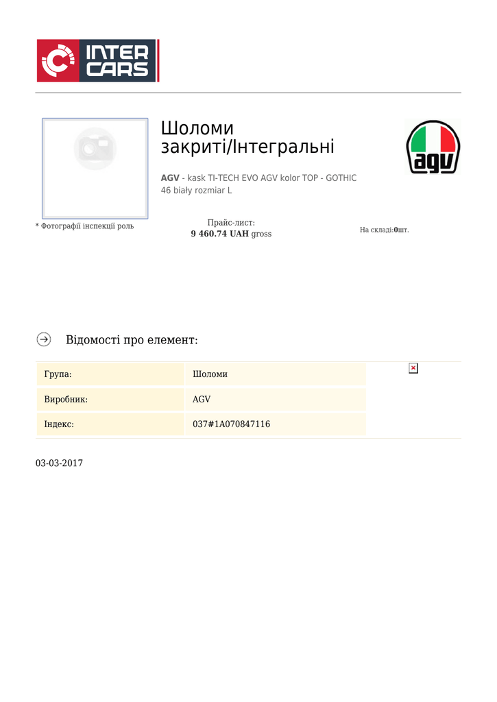 Шоломи закриті/Інтегральні AGV - kask TI-TECH EVO AGV kolor TOP - GOTHIC 46 biały rozmiar L * Фотографії інспекції роль Прайс-лист: 9 460.74 UAH gross Відомості про елемент: Група: Шоломи Виробник: AGV Індекс: 037#1A070847116 03-03-2017 На складі:0шт.