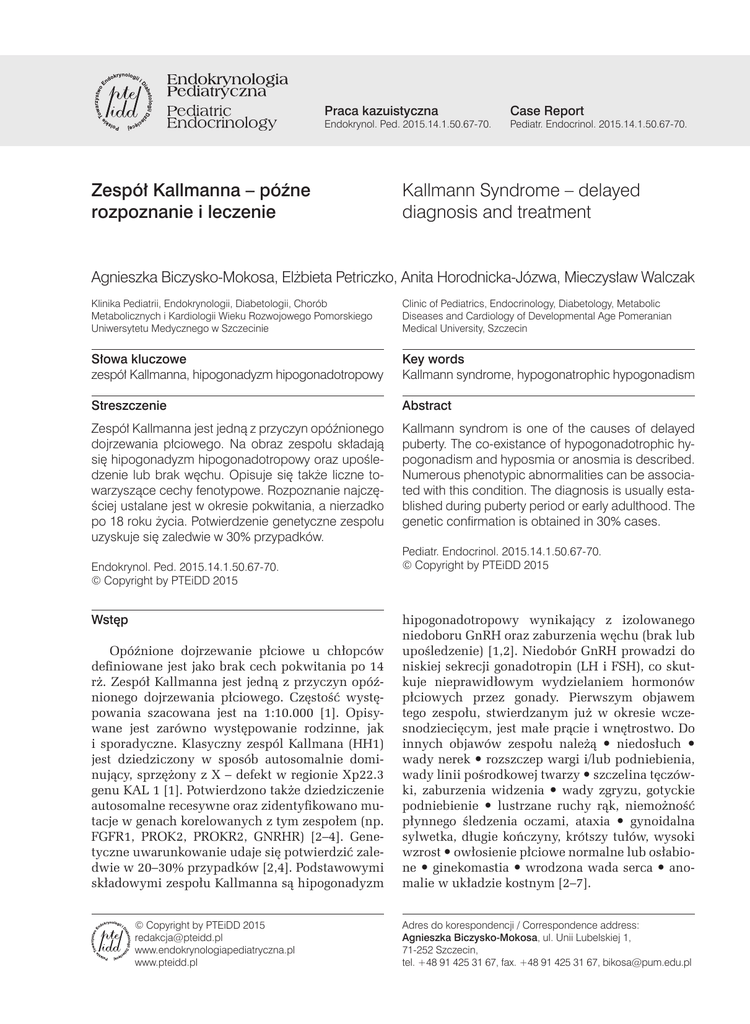 Praca kazuistyczna Endokrynol. Ped. 2015.14.1.50.67-70. Zespół Kallmanna – późne rozpoznanie i leczenie Case Report Pediatr. Endocrinol. 2015.14.1.50.67-70. Kallmann Syndrome – delayed diagnosis and treatment Agnieszka Biczysko-Mokosa, Elżbieta Petriczko, Anita Horodnicka-Józwa, Mieczysław Walczak Klinika Pediatrii, Endokrynologii, Diabetologii, Chorób Metabolicznych i Kardiologii Wieku Rozwojowego Pomorskiego Uniwersytetu Medycznego w Szczecinie Clinic of Pediatrics, Endocrinology, Diabetology, Metabolic Diseases and Cardiology of Developmental Age Pomeranian Medical University, Szczecin Słowa kluczowe zespół Kallmanna, hipogonadyzm hipogonadotropowy Key words Kallmann syndrome, hypogonatrophic hypogonadism Streszczenie Abstract Zespół Kallmanna jest jedną z przyczyn opóźnionego dojrzewania płciowego. Na obraz zespołu składają się hipogonadyzm hipogonadotropowy oraz upośledzenie lub brak węchu. Opisuje się także liczne towarzyszące cechy fenotypowe. Rozpoznanie najczęściej ustalane jest w okresie pokwitania, a nierzadko po 18 roku życia. Potwierdzenie genetyczne zespołu uzyskuje się zaledwie w 30% przypadków. Kallmann syndrom is one of the causes of delayed puberty. The co-existance of hypogonadotrophic hypogonadism and hyposmia or anosmia is described. Numerous phenotypic abnormalities can be associated with this condition. The diagnosis is usually established during puberty period or early adulthood. The genetic confirmation is obtained in 30% cases. Endokrynol. Ped. 2015.14.1.50.67-70. © Copyright by PTEiDD 2015 Wstęp Opóźnione dojrzewanie płciowe u chłopców definiowane jest jako brak cech pokwitania po 14 rż. Zespół Kallmanna jest jedną z przyczyn opóźnionego dojrzewania płciowego. Częstość występowania szacowana jest na 1:10.000 [1]. Opisywane jest zarówno występowanie rodzinne, jak i sporadyczne. Klasyczny zespól Kallmana (HH1) jest dziedziczony w sposób autosomalnie dominujący, sprzężony z X – defekt w regionie Xp22.3 genu KAL 1 [1]. Potwierdzono także dziedziczenie autosomalne recesywne oraz zidentyfikowano mutacje w genach korelowanych z tym zespołem (np. FGFR1, PROK2, PROKR2, GNRHR) [2–4]. Genetyczne uwarunkowanie udaje się potwierdzić zaledwie w 20–30% przypadków [2,4]. Podstawowymi składowymi zespołu Kallmanna są hipogonadyzm © Copyright by PTEiDD 2015 [email protected] www.endokrynologiapediatryczna.pl www.pteidd.pl Pediatr. Endocrinol. 2015.14.1.50.67-70. © Copyright by PTEiDD 2015 hipogonadotropowy wynikający z izolowanego niedoboru GnRH oraz zaburzenia węchu (brak lub upośledzenie) [1,2]. Niedobór GnRH prowadzi do niskiej sekrecji gonadotropin (LH i FSH), co skutkuje nieprawidłowym wydzielaniem hormonów płciowych przez gonady. Pierwszym objawem tego zespołu, stwierdzanym już w okresie wczesnodziecięcym, jest małe prącie i wnętrostwo. Do innych objawów zespołu należą niedosłuch wady nerek rozszczep wargi i/lub podniebienia, wady linii pośrodkowej twarzy szczelina tęczówki, zaburzenia widzenia wady zgryzu, gotyckie podniebienie lustrzane ruchy rąk, niemożność płynnego śledzenia oczami, ataxia gynoidalna sylwetka, długie kończyny, krótszy tułów, wysoki wzrost owłosienie płciowe normalne lub osłabione ginekomastia wrodzona wada serca anomalie w układzie kostnym [2–7]. Adres do korespondencji / Correspondence address: Agnieszka Biczysko-Mokosa, ul. Unii Lubelskiej 1, 71-252 Szczecin, tel. +48 91 425 31 67, fax. +48 91 425 31 67, [email protected] Opis przypadku Chłopiec 17,5-letni został przyjęty do Kliniki z powodu opóźnionego dojrzewania płciowego. Pochodzi z ciąży IV, porodu III, urodzony o czasie, z masą ciała 2650 g, długością 57 cm, Apgar 10. Rozwój psychoruchowy w 1rż prawidłowy. W 4 rż uraz głowy bez utraty przytomności, złamanie kończyny górnej prawej. W 6 rż stwierdzono brak jąder w mosznie, wykonano orchidopeksję lewostronną, stwierdzono hypoplazję lewego jądra. Przeprowadzono także operację przepukliny pachwinowej po prawej stronie. W tym okresie u dziecka rozpoznano ADHD. Chłopiec został objęty opieką psychologiczno-logopedyczną. W kolejnych latach był kontrolowany przez lekarza rodzinnego. Od 16 rż pojawiły się drobne zmiany trądzikowe na nosie oraz owłosienie pachowe i łonowe bez innych objawów pokwitania. Poza skargami na opóźnione pokwitanie chłopiec zgłaszał obniżoną samoocenę z powodu różnic w budowie ciała w stosunku do rówieśników. Do tej pory poważnie nie chorował. Wywiad rodzinny obciążony: stan po operacji wędrujących jąder u ojca chłopca, choroby układu krążenia u dziadków. Przy przyjęciu stan dobry, kontakt logiczny, wysoki tembr głosu. Wysokość ciała 3–10 centyl, masa ciała <3 centyla. Zaburzone proporcje ciała (długie kończyny, krótszy tułów). Sylwetka gynoidalna. Na skórze (obustronnie) pooperacyjne blizny w okolicy pachwinowej. Tkanka podskórna miernie rozwinięta – większa depozycja w obrębie brzucha i bioder; zaznaczona steatomastia. Gałki oczne osadzone prawidłowo. Źrenice równe, okrągłe, średniej wielkości, z prawidłową reakcją na światło. Podniebienie gotyckie. Klatka piersiowa asymetryczna. Narządy płciowe typu męskiego: mikropenis (2,5 cm), hipoplastyczna moszna, przedpokwitaniowe jądra (lewe 1 ml, prawe 1,5 ml), jądro prawe sprowadzalne z kanału pachwinowego. Skąpe owłosienie łonowe i pachowe (Ax II Pb II). Napięcie mięśniowe prawidłowe, siła mięśniowa prawidłowa, symetrycz- na. Układ kostny prawidłowy, zwiększony odstęp pomiędzy palcami stóp. Badanie nerwów czaszkowych: chłopiec nie czuje zapachów – dopytywany podaje, że „od zawsze” (poza aromatem mięty), zauważalny dyskretny oczopląs poziomy przy położeniach skrajnych oraz skokowe podążanie wzrokiem za przedmiotem w kierunku góra-dół. Poza tym w badaniu neurologicznym bez zmian. W diagnostyce różnicowej brano pod uwagę konstytuc