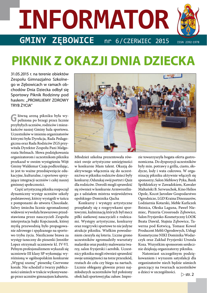 iNfORMATOR GMINY ZĘBOWICE nr 6/czerwiec 2015 ISSN 2392-1978 PIKNIK Z OKAZJI DNIA DZIECKA 31.05.2015 r. na terenie obiektów Zespołu Gimnazjalno Szkolnego w Zębowicach w ramach obchodów Dnia Dziecka odbył się Sportowy Piknik Rodzinny pod hasłem: ,,PROMUJEMY ZDROWY TRYB ŻYCIA’’ G łówną areną pikniku była wypełniona po brzegi przez licznie przybyłych uczniów, rodziców i mieszkańców naszej Gminy hala sportowa. Uczestników w imieniu organizatorów którymi była Dyrekcja, Rada Pedagogiczna oraz Rada Rodziców ZGS przywitała Dyrektor Zespołu Pani Małgorzata Stelmach. Słowa podziękowania organizatorom i uczestnikom pikniku przekazał w swoim wystąpieniu Wójt Gminy Waldemar Czaja podkreślając, że jest to ważne przedsięwzięcie edukacyjne, kulturalne, i sportowe sprzyjające integracji uczniów i całej naszej gminnej społeczności. Część artystyczną pikniku rozpoczął dynamiczny występ uczniów szkoły podstawowej, którzy wystąpili w tańcu z pomponami do utworu Chocolade. Salwy śmiechu licznie zgromadzonej widowni wywołała brawurowo przedstawiona przez nauczycieli Zespołu interpretacja bajki Kopciuszek, której myślą przewodnią było propagowanie zdrowego i spędzanego na sportowo trybu życia. Niezliczone brawa za występ taneczny do piosenki Jennifer Lopez otrzymali uczniowie kl. IV-VI. Pełnym profesjonalizmem wykazali się uczniowie III klasy SP wykonując wyróżnioną w ogólnopolskim konkursie „Wygraj szansę” piosenkę Czerwone korale. Nie schodził z twarzy publiczności uśmiech w trakcie wykonywanego przez uczniów gimnazjum kabaretu. Młodzież szkolna prezentowała również swoje artystyczne umiejętności w konkursie Mam talent. Okazją do aktywnego włączenia się do uczestnictwa w pikniku rodziców dzieci były konkursy; Odszukaj swój portret i Quiz dla rodziców. Dorośli mogli sprawdzić się również w konkursie Armwrestlingu z udziałem mistrza województwa opolskiego-Dominika Qacha Konkursy i występy artystyczne przeplatały się z rozgrywkami sportowymi, kulminacją których był mecz piłki siatkowej nauczycieli z rodzicami. Występy artystyczne, konkursy oraz rozgrywki sportowe to nie jedyne atrakcje pikniku. Wielkim powodzeniem cieszyła się loteria. Liczne grono uczestników zgromadziły warsztaty malarskie oraz punkty malowania twarzy, salon fryzjerski i aerobik. Uczestnicy pikniku mogli również sprawdzić swoje umiejętności na torze przeszkód, rzutach do celu czy biegu na nartach. Licznie oblegany głownie przez najmłodszych uczestników był położony obok hali sportowej plac zabaw. Impre- zie towarzyszyła bogata oferta gastronomiczna. Do dyspozycji uczestników były min. potrawy z grilla, ciasto, słodycze, lody i wata cukrowa. W organizację pikniku aktywnie włączyli się sponsorzy; Salon Meblowy Pyka, Bank Spółdzielczy w Zawadzkiem, Kawaler Maltański B. Serwuschok, Kino Helios Opole, Kocot Jarosław Gospodarstwo Ogrodnicze, LGD Kraina Dinozaurów, Lodziarnia Kotarski, Meble Karliczek Bzinica, Oleska Laguna, Paweł Niemiec, Pizzeria Crossroads Zębowice, Salon Fryzjersko-Kosmetyczny LOOK Beata Dawid, Stajnia Zębowice, Tawerna pod Kotwicą, Tomasz Kowol Producent Mebli Ogrodowych, Usługi Kosmetyczne NIKI Dominika Wodarczyk oraz Zakład Fryzjerski Urszula Koza. Wszystkim sponsorom serdecznie dziękują organizatorzy pikniku. Natomiast szczególnym podziękowaniem i wyrazem satysfakcji dla organizatorów niech będzie uśmiech goszczący na twarzach uczestników a dzieci w szczególności. str. 2 str. 1 2 PIKNIK Z OKAZJI DNIA DZIECKA iNfORMATOR GMINY ZĘBOWICE OBCHODY DNIA STRAŻAKA w ZĘBOWICACH 2 maja br. uroczyście obchodzono Dzień Strażaka w naszej Gminie. Uroczystości rozpoczęły się kilkanaście minut przed godziną dziesiątą na placu przed remizą OSP w Zębowicach. Na uroczystość przybyło wraz ze sztandarami kilkudziesięciu odświętnie ubranych w galowe mundury strażaków ochotników z OSP Zębowice, Knieja, i Kadłub Wolny, którzy reprezentowali liczącą ponad 300 członków grupę strażaków ochotników. Następnie strażacy zwartą kolumną pod dowództwem Komendanta Gminnego OSP druha Mariana Janika przemaszerowali do kościoła parafialnego na uroczystą Mszę św. W kolumnie maszerowali również niosąc figurę patrona strażaków św. Floriana członkowie młodzieżowych drużyn strażackich. Podczas Mszy św. proboszcz parafii ksiądz Paweł Zając dziękował strażakom za ich codzienną niełatwą i pełną wyrzeczeń służbę i pracę, za ich odwagę i poświęcenie. Życzył również strażakom zdrowia i zawsze szczęśliwego powrotu z akcji. Po Mszy strażacy przemaszerowali na plac przed remizą OSP gdzie meldunek o gotowości strażaków do dalszej części obchodów strażackiego święta złożył Prezesowi Zarządu Gminnego OSP wójtowi Waldemarowi Czai Komendant Gminny OSP druh Marian Janik W swoim wystąpieniu Wójt dziękował strażakom za ich poświęcenie w wykonywaniu niełatwych obowiązków związanych z ratowaniem mienia i życia ludzkiego oraz ich zaangażowanie w życie codzienne gminy poprzez uczestnictwo min. w przedsięwzięciach kulturalnych i sportowych organizowanych przez gminę. Wójt podkreślał również potrzebę stałego pogłębiania znajomości sprzętu, dbania o niego i utrzymywania go w ciągłej sprawności bojowej, czemu służyć powinny systematyczne treningi. Uroczystości zakończył wspólny poczęstunek w przygotowanie, którego aktywnie włączyły się żony strażaków ochotników z Przewodniczącą Rady Gminy Panią Gabrielą Buczek na czele. Wspólny poczęstunek był okazją nie tylko do składania życzeń, ale również okazją do dyskusji na temat zadań, jakie stoją przed strażakami w najbliższym okresie czasu. Oprócz podstawowego zadania, jakim jest ratowanie mienia i życia ludzkiego mówiono o przygotowaniach do obchodów 140 rocznicy powstania OSP w Radawiu, poruszano sprawę gminnych zawod