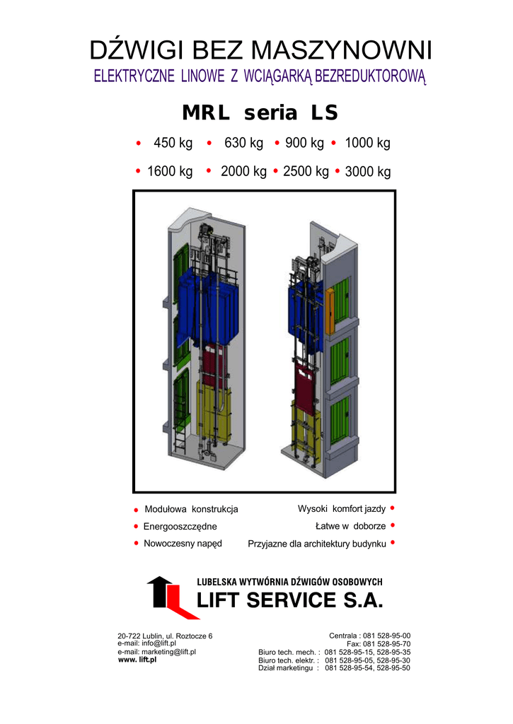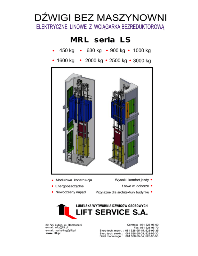 ` DZWIGI BEZ MASZYNOWNI ELEKTRYCZNE LINOWE Z WCIĄGARKĄ BEZREDUKTOROWĄ MRL seria LS 450 kg 630 kg 900 kg 1000 kg 1600 kg 2000 kg 2500 kg 3000 kg Modułowa konstrukcja Energooszczędne Nowoczesny napęd Wysoki komfort jazdy Łatwe w doborze Przyjazne dla architektury budynku 120 20-722 Lublin, ul. Roztocze 6 e-mail: [email protected] e-mail: [email protected] www. lift.pl Centrala : 081 528-95-00 Fax: 081 528-95-70 Biuro tech. mech. : 081 528-95-15, 528-95-35 Biuro tech. elektr. : 081 528-95-05, 528-95-30 Dział marketingu : 081 528-95-54, 528-95-50 Budowa dźwigów bez maszynowni MRL seria LS Wciągarka Ogranicznik Belka nośna Drzwi kabinowe Balustrada Kabina Liny nośne Rama Szafa sterowa Chwytacze Prowadnica Kaseta wezwań Kabel zwisowy Wspornik prowadnic Przeciwwaga Osłona przeciwwagi Drabinka do podszybia Zderzak Obciążka ogranicznika 120 Drzwi przystankowe Program produkcji dźwigów bez maszynowni MRL seria LS Max. 16 przystanków Nr k abina p rę d k o ś ć / u d ź w i g p ro j . V Q/n Sk Gk dr z w i Hk Dk Sd Hd szyb typ Ss 1400 m/s kg/ilość osób mm mm mm szt. mm mm B 01 1 450/6 900 1300 2150 1 750 2000 AT mm B 02 B 03 B 04 B 05 B 06 B 07 B 08 B 09 B 10 B 11 B 12 B 13 B 14 B 15 B 16 B 17 B 18 B 19 B 20 B 21 B 22 B 23 B 24 B 25 1 630/8 1100 1400 2150 1 900 2000 1 630/8 1100 1400 2150 2 900 2000 1 630/8 1100 1400 2200 2 900 1 900/12 1400 1500 2150 1 900 1 900/12 1400 1500 2150 2 1 1000/13 1100 2100 2150 1 1000/13 1100 2100 2150 1 1000/13 1100 2100 1 1600/21 1400 1 1600/21 1400 1 1600/21 1 1600/21 1 ty p Gs P mm mm uw agi N polecane instalacje mm 1670/1700* 1150/1400** 3400 B045AA AT min1650/1700* 1750/1800* 1150/1400** 3400 B063AA budynki m i eszkal ne nowe AT min1650/1700* 1930 1150/1400** 3400 B063AB budynki m i eszkal ne nowe , kab. przel otowa 2000 AT 1780 1930 1200/1400** 3500 B063AP budynki publ i czne i m i eszkal ne, bi ura, 2000 AC 2000 1800 1150/1400** 3400 B090AA budynki publ i czne , bi ura 900 2000 AC 2000 1870 1150/1400** 3400 B090AB budynki publ i czne , bi ura, kab. przel otowa 1 800 2000 AT min1650/1700* 2400 1150/1400** 3400 B100AA budynki i stni ej ace m i eszk. (m ebl owe ) wąski próg 1 900 2000 AT min1650/1700* 2450 1150/1400** 3400 B100AA budynki m i eszkal ne nowe 2150 2 900 2000 AT min1650/1700* 2630 1150/1400** 3400 B100AB budynki m i eszkal ne nowe , kabi na przel otowa 2400 2150 1 1100 2000 AT 2300 2750 1350/1400** 3500 B160AA szpi tal e i stni ej ące 2400 2150 2 1100 2000 AT 2300 2950 1350/1400** 3500 B160AB szpi tal e i stni ej ące , kabi na przel otowa 1400 2400 2200 1 1300 2100 AT 2300 2750 1250/1400** 3600 B160AA szpi tal e nowe 1400 2400 2200 2 1300 2100 AT 2300 2930 1250/1400** 3600 B160AB szpi tal e nowe 2000/26 1500 2700 2300 1 1300 2200 AT 2450 3050 1400 4000 B200AA szpi tal e nowe 1 2000/26 1500 2700 2300 2 1300 2200 AT 2450 3230 1400 4000 B200AB szpi tal e nowe , kab. przel otowa 1 2500/33 1800 2700 2400 1 2000 2300 AC 3100 3100 1400 4300 B250AA towarowy/hi perm arket 1 2500/33 1800 2700 2400 2 2000 2300 AC 3100 3100 1400 4300 B250AB towarowy/hi perm arket, kab. przel otowa 1,6 630/8 1100 1400 2150 1 900 2000 AT min1650/1700* 1750 1500 3600 B063FA nowe budynki m i eszk. i publ i czne ,bi ura , 1,6 630/8 1100 1400 2150 2 900 2000 AT min1650/1700* 1950 1500 3600 B063FB nowe budynki m i eszk. i publ . ,bi ura ,kab. przel ot. 1,6 900/12 1400 1500 2150 1 900 2000 AC 2000 1800 1500 3600 B090FA nowe budynki m i eszk. i publ i czne ,bi ura , 1,6 900/12 1400 1500 2150 2 900 2000 AC 2000 1870 1500 3600 B090FB nowe budynki m i eszk. i publ i czne ,bi ura, kab. przel ot. 1,6 1000/13 1100 2100 2150 1 900 2000 AT min1650/1700* 2450 1500 3600 B100FA 1,6 1000/13 1100 2100 2150 2 900 2000 AT min1650/1700* 2630 1500 3600 B100FB nowe budynki m i eszk. i publ i czne ,bi ura, kab. przel ot. 1 3000/40 2000 2700 2400 1 2000 2300 AC 3300 3100 1400 4300 B300AA towarowy/hi perm arket 1 3000/40 2000 2700 2400 2 2000 2300 AC 3300 3230 1400 4300 B300AB towarowy/hi perm arket, kab. przel otowa do 3000 budynki i stni ej ące m i eszk., oraz nowe BXX do 1,75 OG1 Szczegóły wykonania s zybu ( dźwig nieprzelotowy) przy z astosowaniu drzwi przystankowych ognioodpornych - rysunek różnicowy do projektów podstawowych OG2 Szczegóły wykonania s zybu (dźwig przelotowy) przy z astosowaniu drzwi przystankowych ognioodpornych - rysunek różnicowy do projektów podstawowych dź w ig, k tór y z apr ojek tujem y dla C iebie w g. indy w idualny c h uz godnień Dźwig nieprzelotowy Legenda : Hk Hd Hd Hd A P P Hp Hp Hk N N Dźwig przelotowy A nowe budynki m i eszk. i publ i czne ,bi ura , * - wymiary zalecane przy projektowaniu ** - zalecane wymiary podszybia przy Hp>40 m Hp - wysokość podnoszenia Sk - szerokość kabiny Gk - głębokość kabiny Hk - wysokość kabiny Dk - ilość drzwi w kabinie Sd - szerokość drzwi Hd - wysokość drzwi AT - drzwi teleskopowe AC - drzwi centralne Ss - szerokość szybu Gs - głębokość szybu P - podszybie N - nadszybie B24 i B25 projekty pilotażowe ,max Hp=17 m Uwagi: Gk Gs Ss Sd Ss Sd Sk Sd Gs Sk A - A Gk 120 1. Odbicia lustrzane dopuszczalne 2. Przy zastosowaniu drzwi szybowych o odporności ogniowej należy wprowadzić korekty do wykonania szybu patrz: projekt OG1 i OG2 3. Szczegółowe wytyczne budowlane patrz nr projektu w katalogu “Dźwigi bez maszynowni” na stronie www.lift.pl 4. Podana wysokość nadszybia dla założonej wysokości kabiny 5. Inne konfiguracje dźwigu są możliwe po indywidalnych Uzgodnienach z biurem technicznym Linia zasilająca 5 -cio przewodowa ZASILANIE DŹWIGU max max 2,0 m Linia telefoniczna 2 -żyłowa z zapasem 2 m max 1. Minimalne natężenie oświetlenia winno wynosić: - min. 50 luxów w całym szybie - min. 200 luxów w nadszybiu 2. Rozmieszczenie punktów świetlnych : - max. 0,5 m od dna podszybia - max. 0,5 m od stropu nadszybia - max. 2,0 pomiędzy kolejnymi punktami 3. W podszybiu należy zainstalować gniazdo zasilające 230V 2P+PE 2,0 m Z pionu administracyjnego budynku 3x2,5 