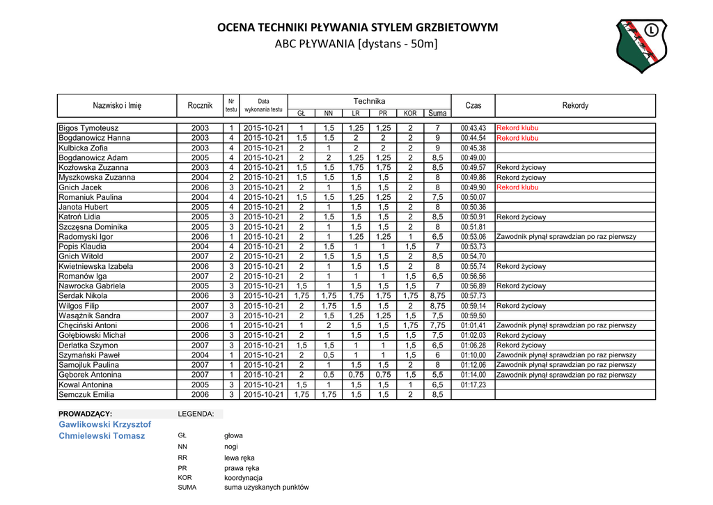 OCENA TECHNIKI PŁYWANIA STYLEM GRZBIETOWYM ABC PŁYWANIA [dystans - 50m] Nazwisko i Imię Bigos Tymoteusz Bogdanowicz Hanna Kulbicka Zofia Bogdanowicz Adam Kozłowska Zuzanna Myszkowska Zuzanna Gnich Jacek Romaniuk Paulina Janota Hubert Katroń Lidia Szczęsna Dominika Radomyski Igor Popis Klaudia Gnich Witold Kwietniewska Izabela Romanów Iga Nawrocka Gabriela Serdak Nikola Wilgos Filip Wasążnik Sandra Chęciński Antoni Gołębiowski Michał Derlatka Szymon Szymański Paweł Samojluk Paulina Gęborek Antonina Kowal Antonina Semczuk Emilia Rocznik Nr testu Data wykonania testu 2003 2003 2003 2005 2003 2004 2006 2004 2005 2005 2005 2006 2004 2007 2006 2007 2005 2006 2007 2007 2006 2006 2007 2004 2007 2007 2005 2006 1 4 4 4 4 2 3 4 4 3 3 1 4 2 3 2 3 3 3 3 1 3 3 1 1 1 3 3 2015-10-21 2015-10-21 2015-10-21 2015-10-21 2015-10-21 2015-10-21 2015-10-21 2015-10-21 2015-10-21 2015-10-21 2015-10-21 2015-10-21 2015-10-21 2015-10-21 2015-10-21 2015-10-21 2015-10-21 2015-10-21 2015-10-21 2015-10-21 2015-10-21 2015-10-21 2015-10-21 2015-10-21 2015-10-21 2015-10-21 2015-10-21 2015-10-21 Technika GŁ NN LR PR KOR Suma 1 1,5 2 2 1,5 1,5 2 1,5 2 2 2 2 2 2 2 2 1,5 1,75 2 2 1 2 1,5 2 2 2 1,5 1,75 1,5 1,5 1 2 1,5 1,5 1 1,5 1 1,5 1 1 1,5 1,5 1 1 1 1,75 1,75 1,5 2 1 1,5 0,5 1 0,5 1 1,75 1,25 2 2 1,25 1,75 1,5 1,5 1,25 1,5 1,5 1,5 1,25 1 1,5 1,5 1 1,5 1,75 1,5 1,25 1,5 1,5 1 1 1,5 0,75 1,5 1,5 1,25 2 2 1,25 1,75 1,5 1,5 1,25 1,5 1,5 1,5 1,25 1 1,5 1,5 1 1,5 1,75 1,5 1,25 1,5 1,5 1 1 1,5 0,75 1,5 1,5 2 2 2 2 2 2 2 2 2 2 2 1 1,5 2 2 1,5 1,5 1,75 2 1,5 1,75 1,5 1,5 1,5 2 1,5 1 2 7 9 9 8,5 8,5 8 8 7,5 8 8,5 8 6,5 7 8,5 8 6,5 7 8,75 8,75 7,5 7,75 7,5 6,5 6 8 5,5 6,5 8,5 PROWADZĄCY: LEGENDA: Gawlikowski Krzysztof Chmielewski Tomasz GŁ głowa NN nogi RR lewa ręka prawa ręka koordynacja suma uzyskanych punktów PR KOR SUMA Czas 00:43,43 00:44,54 00:45,38 00:49,00 00:49,57 00:49,86 00:49,90 00:50,07 00:50,36 00:50,91 00:51,81 00:53,06 00:53,73 00:54,70 00:55,74 00:56,56 00:56,89 00:57,73 00:59,14 00:59,50 01:01,41 01:02,03 01:06,28 01:10,00 01:12,06 01:14,00 01:17,23 Rekordy Rekord klubu Rekord klubu Rekord życiowy Rekord życiowy Rekord klubu Rekord życiowy Zawodnik płynął sprawdzian po raz pierwszy Rekord życiowy Rekord życiowy Rekord życiowy Zawodnik płynął sprawdzian po raz pierwszy Rekord życiowy Rekord życiowy Zawodnik płynął sprawdzian po raz pierwszy Zawodnik płynął sprawdzian po raz pierwszy Zawodnik płynął sprawdzian po raz pierwszy