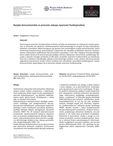 The Wroclaw School of Banking Research Journal ISSN 1643-7772 I eISSN 2392-1153 Vol. 15 I No. 3 ĞƐnjLJƚLJEĂƵŬŽǁĞtLJǏƐnjĞũ^njŬŽųLJ ĂŶŬŽǁĞũǁĞtƌŽĐųĂǁŝƵ ISSN 1643-7772 I eISSN 2392-1153 R. 15 I Nr 3 ZLJnjLJŬŽŬŽŶƐƵŵĞŶĐŬŝĞǁƉƌŽĐĞƐŝĞnjĂŬƵƉƵǏLJǁŶŽƑĐŝĨƵŶŬĐũŽŶĂůŶĞũ ƵƚŽƌ͗DĂŐĚĂůĞŶĂKůĞũŶŝĐnjĂŬ ďƐƚƌĂŬƚ <ŽŶƐƵŵƉĐũĂǏLJǁŶŽƑĐŝĨƵŶŬĐũŽŶĂůŶĞũǁWŽůƐĐĞŽĚŬŝůŬƵůĂƚƉŽnjŽƐƚĂũĞŶĂƌĞůĂƚLJǁŶŝĞŶŝƐŬŝŵƉŽnjŝŽͲ ŵŝĞǁƐƚŽƐƵŶŬƵĚŽƉŽnjŝŽŵƵnjĂŝŶƚĞƌĞƐŽǁĂŶŝĂŽďƐĞƌǁŽǁĂŶĞŐŽǁŬƌĂũĂĐŚƵƌŽƉLJĂĐŚŽĚŶŝĞũ͘ /ƐƚŽƚŶLJŵĐnjLJŶŶŝŬŝĞŵĚĞƚĞƌŵŝŶƵũČĐLJŵũĞũƉŽnjŝŽŵũĞƐƚƉŽƐƚƌnjĞŐĂŶĞƌLJnjLJŬŽŬŽŶƐƵŵĞŶĐŬŝĞ͕ŬƚſƌĞ ƐŬƵƚĞĐnjŶŝĞƉŽǁƐƚƌnjLJŵƵũĞƉŽƚĞŶĐũĂůŶLJĐŚŶĂďLJǁĐſǁĚŽnjĂŬƵƉſǁƉƌŽĚƵŬƚſǁǏLJǁŶŽƑĐŝĨƵŶŬĐũŽͲ ŶĂůŶĞũ͘KĚĐnjƵǁĂŶĞǁČƚƉůŝǁŽƑĐŝŬŽŶƐƵŵĞŶƚſǁǁLJǁŽųƵũČƵŶŝĐŚƐƚĂŶŶĂƉŝħĐŝĂĞŵŽĐũŽŶĂůŶĞŐŽ͕ ŬƚſƌLJĐnjħƐƚŽƐŬƵƚĞĐnjŶŝĞƉŽǁƐƚƌnjLJŵƵũĞƉŽĚũħƚĞnjĂŵŝĂƌLJnjĂŬƵƉŽǁĞ͘<ŽŶƐƵŵĞŶƚ͕ƉŽĚĞũŵƵũČĐĚĞͲ ĐLJnjũħŽnjĂŬƵƉŝĞŶŽǁĞŐŽƉƌŽĚƵŬƚƵ;ĂĚůĂǁŝĞůƵƉƌŽĚƵŬƚLJǏLJǁŶŽƑĐŝĨƵŶŬĐũŽŶĂůŶĞũƐČŶŽǁŽƑĐŝČͿ͕ ůŝĐnjLJƐŝħnjƌLJnjLJŬŝĞŵŶŝĞƵĚĂŶĞŐŽnjĂŬƵƉƵ;ĐnjLJůŝƉŽƐƚƌnjĞŐĂƌLJnjLJŬŽͿ͕ĂƚLJŵƐĂŵLJŵŽĚĐnjƵǁĂƉĞǁŶĞ njĂŐƌŽǏĞŶŝĞƉŽŶŝĞƐŝĞŶŝĂƐƚƌĂƚLJ͘ĞůĞŵĂƌƚLJŬƵųƵũĞƐƚŽŬƌĞƑůĞŶŝĞĐnjLJŶŶŝŬſǁŬƐnjƚĂųƚƵũČĐLJĐŚƌLJnjLJŬŽ ŬŽŶƐƵŵĞŶĐŬŝĞƵũĂǁŶŝĂũČĐĞƐŝħǁƉƌŽĐĞƐŝĞnjĂŬƵƉƵǏLJǁŶŽƑĐŝĨƵŶŬĐũŽŶĂůŶĞũ͘ ^ųŽǁĂ ŬůƵĐnjŽǁĞ͗ ƌLJnjLJŬŽ ŬŽŶƐƵŵĞŶĐŬŝĞ͕ ǏLJǁͲ ŶŽƑđĨƵŶŬĐũŽŶĂůŶĂ͕njĂĐŚŽǁĂŶŝĂŬŽŶƐƵŵĞŶƚſǁ :>͗ϭϬ͕ϭϮ ,ŝƐƚŽƌŝĂ͗ŽƚƌnjLJŵĂŶŽ/sŬǁĂƌƚĂųϮϬϭϰ͕ƉŽƉƌĂǁŝŽͲ ŶŽϭϬ͘Ϭϯ͘ϮϬϭϱ͕njĂĂŬĐĞƉƚŽǁĂŶŽϭϬ͘Ϭϰ͘ϮϬϭϱ tƐƚħƉ njǁLJďŽƌĞŵƉƌŽĚƵŬƚƵůƵďƵƐųƵŐŝ͕ĂƚĂŬǏĞŵŝĞũƐĐĂ ŝ ĐnjĂƐƵ njĂŬƵƉƵ͖ ĐŽ ǁ ƉĞƌŵĂŶĞŶƚŶŝĞ njŵŝĞŶŝĂũČͲ ĐLJŵƐŝħŽƚŽĐnjĞŶŝƵũĞƐƚĐŽƌĂnjƚƌƵĚŶŝĞũƐnjĞ͘tũħnjLJͲ ŬƵƉŽůƐŬŝŵƉŽƚŽĐnjŶLJŵƉŽũħĐŝĞƌLJnjLJŬĂŬŽũĂƌnjŽŶĞ ũĞƐƚŶĂũĐnjħƑĐŝĞũnjďƌĂŬŝĞŵƉĞǁŶŽƑĐŝĚŽƉŽŵLJƑůͲ ŶĞŐŽ njĂŬŽŷĐnjĞŶŝĂ ƉŽĚũħƚĞŐŽ ƉƌnjĞĚƐŝħǁnjŝħĐŝĂ͘ ^ųŽǁŽͣƌLJnjLJŬŽǁĂđ͟ǁ^ųŽǁŶŝŬƵũħnjLJŬĂƉŽůƐŬŝĞŐŽ WtEŽŬƌĞƑůĂŶĞũĞƐƚŵŝĂŶĞŵͣŵŽǏůŝǁŽƑĐŝ͕ƉƌĂǁͲ ĚŽƉŽĚŽďŝĞŷƐƚǁĂ͕ ǏĞ ĐŽƑ Ɛŝħ ŶŝĞ ƵĚĂ͕ ƉƌnjĞĚƐŝħͲ ǁnjŝħĐŝĂ͕ ŬƚſƌĞŐŽ ǁLJŶŝŬ ũĞƐƚ ŶŝĞnjŶĂŶLJ͕ ŶŝĞƉĞǁͲ ŶLJ͕ ƉƌŽďůĞŵĂƚLJĐnjŶLJ͟ ;^ųŽǁŶŝŬ ũħnjLJŬĂ ƉŽůƐŬŝĞŐŽ WtEͿ͘ ZLJnjLJŬŽ ǁLJŶŝŬĂ nj ĨĂŬƚƵ ƉŽĚĞũŵŽǁĂŶŝĂ ĚĞĐLJnjũŝĚŽƚLJĐnjČĐLJĐŚƉƌnjLJƐnjųŽƑĐŝ͕ďŽǁŝĞŵŬŽŶƐƵͲ ŵĞŶƚ͕ƉŽĚĞũŵƵũČĐŽŬƌĞƑůŽŶĞĚnjŝĂųĂŶŝĞ͕ŶŝĞũĞƐƚ ƉĞǁŝĞŶ ;ŝ ŶŝĞ ŵŽǏĞ ďLJđͿ ƉƌnjLJƐnjųLJĐŚ ƌĞnjƵůƚĂƚſǁ͘ njŝĂųĂŶŝĞ ǁ ǁĂƌƵŶŬĂĐŚ ƌLJnjLJŬĂ nj ƵǁĂŐŝ ŶĂ ŶŝĞͲ njŶĂŶČ ƉƌnjLJƐnjųŽƑđ ŽnjŶĂĐnjĂ ƉŽĚĞũŵŽǁĂŶŝĞ ĚĞĐLJͲ njũŝ ǁ ƐLJƚƵĂĐũŝ ďƌĂŬƵ ǁLJĐnjĞƌƉƵũČĐLJĐŚ ŝŶĨŽƌŵĂĐũŝ͕ njĂƚĞŵŽƐŝČŐŶŝħĐŝĞĐĞůƵũĞƐƚŵŽǏůŝǁĞ͕ĂůĞŶŝĞũĞƐƚ ƉĞǁŶĞ;DĂĐŝĞũĞǁƐŬŝϮϬϭϬ͗ϯϳͿ͖ƐŬƵƚŬƵũĞƚŽǁLJͲ ƐƚČƉŝĞŶŝĞŵ ƐƚĂŶƵ ŶŝĞƉĞǁŶŽƑĐŝ ;dĂƌĂŶŬŽ ϮϬϬϱ͗ ϭϮϯͿ͘ ĂĐŚŽǁĂŶŝĂnjĂŬƵƉŽǁĞŬŽŶƐƵŵĞŶƚſǁŽďĞũŵƵũČ ƐƉſũŶČ ĐĂųŽƑđ ƌĞĂŬĐũŝ njǁŝČnjĂŶLJĐŚ nj ĚŽŬŽŶLJǁĂͲ ŶŝĞŵǁLJďŽƌſǁ͕ŬƚſƌĞŵĂũČŶĂĐĞůƵnjĂƐƉŽŬŽũĞŶŝĞ ƉŽƚƌnjĞď ŝŶĚLJǁŝĚƵĂůŶLJĐŚ ŝ ƐČ ĞĨĞŬƚĞŵ ŽĚĚnjŝĂųLJͲ ǁĂŶŝĂ ǁŝĞůƵ ĚĞƚĞƌŵŝŶĂŶƚ ĚnjŝĂųĂũČĐLJĐŚ nj ƌſǏŶČ ƐŝųČŝǁƌſǏŶLJĐŚŬŝĞƌƵŶŬĂĐŚ͘ EĂũǁĂǏŶŝĞũƐnjLJŵŬŽŵƉŽŶĞŶƚĞŵŬĂǏĚĞŐŽnjĂĐŚŽͲ ǁĂŶŝĂ ůƵĚnjŬŝĞŐŽ ũĞƐƚ ƉŽĚĞũŵŽǁĂŶŝĞ ĚĞĐLJnjũŝ͘ ĞĐLJnjũĂũĞƐƚƑǁŝĂĚŽŵLJŵ͕ŶŝĞůŽƐŽǁLJŵǁLJďŽƌĞŵ ũĞĚŶĞŐŽnjǁŝĞůƵŵŽǏůŝǁLJĐŚƐƉŽƐŽďſǁĚnjŝĂųĂŶŝĂ͕ ǁĞĚųƵŐ ŬƚſƌĞŐŽ ďħĚnjŝĞ ƉŽƐƚħƉŽǁĂų ĚĞĐLJĚĞŶƚ ;<ƌĂŵĞƌ ϭϵϵϰ͗ ϳϱͿ͘ t ŶĂƵŬĂĐŚ ĞŬŽŶŽŵŝĐnjŶLJĐŚ ƉƌnjĞǁĂǏŶŝĞ njĂŝŶƚĞƌĞƐŽǁĂŶŝĞ ďĂĚĂĐnjLJ ƐŬƵƉŝŽŶĞ ũĞƐƚŶĂƉƌŽĐĞƐŝĞƉŽĚĞũŵŽǁĂŶŝĂĚĞĐLJnjũŝnjĂŬƵƉŽͲ ǁLJĐŚ͕ĐnjLJůŝƉŽƐƚĂŶŽǁŝĞŶŝĂŬŽŶƐƵŵĞŶƚĂŽƉŽĚũħͲ ĐŝƵŽŬƌĞƑůŽŶĞŐŽĚnjŝĂųĂŶŝĂ;ŶƉ͘njĂŬƵƉƵƉƌŽĚƵŬƚƵ ůƵďƵƐųƵŐŝͿ;'ĂũĞǁƐŬŝϭϵϵϯ͗ϭϯͿ͘ <ĂǏĚĂĚĞĐLJnjũĂƉŽĚĞũŵŽǁĂŶĂƉƌnjĞnjŬŽŶƐƵŵĞŶƚĂ ũĞƐƚ ŽďĂƌĐnjŽŶĂ ƉĞǁŶLJŵ ƌLJnjLJŬŝĞŵ͘ <ŽŶƐƵŵĞŶƚ ŶŝĞƵƐƚĂŶŶŝĞŵƵƐŝƉŽĚĞũŵŽǁĂđĚĞĐLJnjũĞnjǁŝČnjĂŶĞ DŐƌŝŶǏ͘DĂŐĚĂůĞŶĂKůĞũŶŝĐnjĂŬ tLJǏƐnjĂ^njŬŽųĂĂŶŬŽǁĂǁWŽnjŶĂŶŝƵ ŵĂŐĚĂůĞŶĂ͘ŽůĞũŶŝĐnjĂŬΛǁƐď͘ƉŽnjŶĂŶ͘Ɖů The Wroclaw School of Banking Research Journal I ISSN 1643-7772 I eISSN 2392-1153 I Vol. 15 I No. 3 dĂďĞůĂϭ͘ZŽĚnjĂũĞƌLJnjLJŬĂ ZŽĚnjĂũƌLJnjLJŬĂ tČƚƉůŝǁŽƑĐŝƚŽǁĂƌnjLJƐnjČĐĞŬŽŶƐƵŵĞŶƚŽǁŝƉƌnjLJǁLJďŽƌnjĞƉƌŽĚƵŬƚƵǏLJǁŶŽ