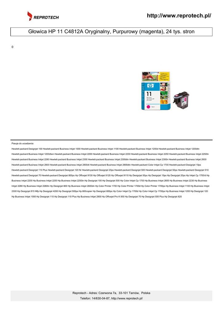 http://www.reprotech.pl/ Głowica HP 11 C4812A Oryginalny, Purpurowy (magenta), 24 tys. stron 0 Pasuje do urzadzenia: Hewlett-packard Designjet 100 Hewlett-packard Business Inkjet 1000 Hewlett-packard Business Inkjet 1100 Hewlett-packard Business Inkjet 1200d Hewlett-packard Business Inkjet 1200dtn Hewlett-packard Business Inkjet 1200dtwn Hewlett-packard Business Inkjet 2200 Hewlett-packard Business Inkjet 2230 Hewlett-packard Business Inkjet 2250 Hewlett-packard Business Inkjet 2250tn Hewlett-packard Business Inkjet 2280 Hewlett-packard Business Inkjet 2300 Hewlett-packard Business Inkjet 2300dtn Hewlett-packard Business Inkjet 2300n Hewlett-packard Business Inkjet 2600 Hewlett-packard Business Inkjet 2800 Hewlett-packard Business Inkjet 2800dt Hewlett-packard Business Inkjet 2800dtn Hewlett-packard Color Inkjet Cp 1700 Hewlett-packard Designjet 10ps Hewlett-packard Designjet 110 Plus Hewlett-packard Designjet 120 Nr Hewlett-packard Designjet 20ps Hewlett-packard Designjet 500 Hewlett-packard Designjet 50ps Hewlett-packard Designjet 510 Hewlett-packard Designjet 70 Hewlett-packard Designjet 800ps Hp Officejet 9130 Hp Officejet 9120 Hp Officejet 9110 Hp Designjet 50ps Hp Designjet 10ps Hp Designjet 20ps Hp Inkjet Cp 1700/d Hp Business Inkjet 2200 Hp Business Inkjet 2250 Hp Business Inkjet 2250tn Hp Designjet 100 Hp Designjet 500 Hp Color Inkjet Cp 1700 Hp Business Inkjet 2600 Hp Business Inkjet 2230 Hp Business Inkjet 2280 Hp Business Inkjet 2280tn Hp Designjet 800 Hp Business Inkjet 2600dn Hp Color Printer 1700 Hp Color Printer 1700d Hp Color Printer 1700ps Hp Business Inkjet 1100 Hp Business Inkjet 2300 Hp Designjet 815 Mfp Hp Designjet 4200 Hp Designjet 500ps Hp 800copier Hp Designjet 800ps Hp Color Inkjet Cp 1700d Hp Color Inkjet Cp 1700ps Hp Business Inkjet 1200 Hp Designjet 120 Hp Business Inkjet 1000 Hp Designjet 110 Hp Designjet 110 Plus Hp Business Inkjet 2800 Hp Officejet Pro K 850 Hp Designjet 70 Hp Designjet 500 Plus Hp Designjet 820 Reprotech - Adres: Czerwona 7a, 33-101 Tarnów, Polska Telefon: 14/630-04-87, http://www.reprotech.pl/