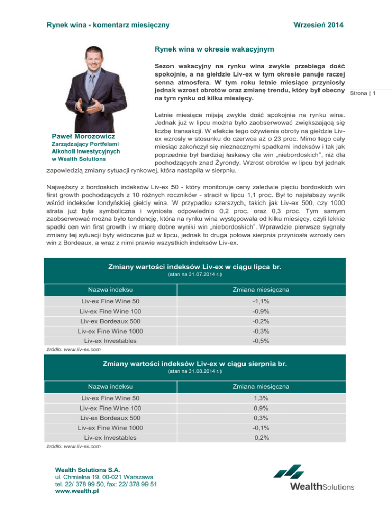 Rynek wina - komentarz miesięczny Wrzesień 2014 Rynek wina w okresie wakacyjnym Sezon wakacyjny na rynku wina zwykle przebiega dość spokojnie, a na giełdzie Liv-ex w tym okresie panuje raczej senna atmosfera. W tym roku letnie miesiące przyniosły jednak wzrost obrotów oraz zmianę trendu, który był obecny Strona | 1 na tym rynku od kilku miesięcy. Letnie miesiące mijają zwykle dość spokojnie na rynku wina. Jednak już w lipcu można było zaobserwować zwiększającą się liczbę transakcji. W efekcie tego ożywienia obroty na giełdzie LivPaweł Morozowicz ex wzrosły w stosunku do czerwca aż o 23 proc. Mimo tego cały Zarządzający Portfelami miesiąc zakończył się nieznacznymi spadkami indeksów i tak jak Alkoholi Inwestycyjnych poprzednie był bardziej łaskawy dla win „niebordoskich”, niż dla w Wealth Solutions pochodzących znad Żyrondy. Wzrost obrotów w lipcu był jednak zapowiedzią zmiany sytuacji rynkowej, która nastąpiła w sierpniu. Najwęższy z bordoskich indeksów Liv-ex 50 - który monitoruje ceny zaledwie pięciu bordoskich win first growth pochodzących z 10 różnych roczników - stracił w lipcu 1,1 proc. Był to najsłabszy wynik wśród indeksów londyńskiej giełdy wina. W przypadku szerszych, takich jak Liv-ex 500, czy 1000 strata już była symboliczna i wyniosła odpowiednio 0,2 proc. oraz 0,3 proc. Tym samym zaobserwować można było tendencję, która na rynku wina występowała od kilku miesięcy, czyli lekkie spadki cen win first growth i w miarę dobre wyniki win „niebordoskich”. Wprawdzie pierwsze sygnały zmiany tej sytuacji były widoczne już w lipcu, jednak to druga połowa sierpnia przyniosła wzrosty cen win z Bordeaux, a wraz z nimi prawie wszystkich indeksów Liv-ex. Zmiany wartości indeksów Liv-ex w ciągu lipca br. (stan na 31.07.2014 r.) Nazwa indeksu Zmiana miesięczna Liv-ex Fine Wine 50 -1,1% Liv-ex Fine Wine 100 -0,9% Liv-ex Bordeaux 500 -0,2% Liv-ex Fine Wine 1000 -0,3% Liv-ex Investables -0,5% źródło: www.liv-ex.com Zmiany wartości indeksów Liv-ex w ciągu sierpnia br. (stan na 31.08.2014 r.) Nazwa indeksu Zmiana miesięczna Liv-ex Fine Wine 50 1,3% Liv-ex Fine Wine 100 0,9% Liv-ex Bordeaux 500 0,3% Liv-ex Fine Wine 1000 -0,1% Liv-ex Investables 0,2% źródło: www.liv-ex.com Wealth Solutions S.A. ul. Chmielna 19, 00-021 Warszawa tel. 22/ 378 99 50, fax: 22/ 378 99 51 www.wealth.pl Rynek wina - komentarz miesięczny Wrzesień 2014 Tym razem największym beneficjentem wzrostów był najwęższy z indeksów. W sierpniu Liv-ex 50 wzrósł o 1,3 proc. W jego ślady poszedł również Liv-ex 100, który zanotował wzrost o 0,9 proc. Co ciekawe wina, które jeszcze w lipcu mogły przynieść stratę, w sierpniu zaoferować mogły spore zyski. Najlepszym przykładem w tym miejscu może być wino Lafite Rothschild, które w ostatnim miesiącu zajęło aż dwie z pięciu pozycji w zestawianiu najszybciej drożejących win na rynku. Warto również dodać, że w lipcu i sierpniu ranking ten został pierwszy raz od wielu miesięcy całkowicie zdominowany Strona | 2 przez wina bordoskie. Rosnące zainteresowanie winami znad Żyrondy przełożyło się oczywiście na wzrost udziału Bordeaux w obrotach giełdy Liv-ex. W lipcu ten udział wynosił zaledwie 76 proc. i był to najniższy poziom od 9 miesięcy. W sierpniu wyniósł już jednak 82 proc. Pozytywnym sygnałem było również to, że liczba transakcji osiągała ponownie poziom 50 proc. ofert sprzedaży. To najwyższy poziom od marca. To bardzo zdrowa proporcja zważywszy na fakt, że wiele win na giełdzie Liv-ex wystawianych jest po zawyżonych i nie przystających do warunków rynkowych cenach. Jeśli obserwowane w lipcu i sierpniu tendencje utrzymają się, to będzie można powiedzieć, że na rynku wina doszło do trwałego odwrócenia trendu, obserwowanego w tym miejscu od wielu miesięcy. Zarówno w lipcu, jak i sierpniu najbardziej „chodliwymi” rocznikami bordoskimi były 2009, 2010 oraz 2011, które odpowiadały za 10-12 proc. obrotów winem z tego regionu. W sierpniu do tego grona dołączyły jeszcze roczniki 2003 oraz 2005, które zgromadziły pod swoimi skrzydłami odpowiednio 11 i 13 proc. rynku wina bordoskiego. Brokerzy sprzedają Bordeaux Ta wyraźna zmiana trendu wynikała ze wzrostu popytu na wielkie Bordeaux na rynkach Azji i Ameryki Północnej. Zjawisko to dostrzegli w pierwszej kolejności brokerzy, którzy w całym pierwszym półroczu 2014 r. notowali wzrost sprzedaży wina bordoskiego na tych rynkach. - Ostatnie ożywienie jest mocno związane z rynkami eksportowymi. Odnotowaliśmy w porównaniu do pierwszego półrocza 2013 ponad 60-procentowy wzrost w handlu z klientami z Azji. Przeważnie na rynkach poza Hong Kongiem - w Chinach i Indonezji. Ten wzrost ilustruje ciekawy trend, który obserwujemy. Osoby wchodzące w świat wielkich win zdecydowanie bardziej wolą zaczynać swoją przygodę od Bordeaux. Widzimy też rosnącą sprzedaż w Stanach Zjednoczonych, na rynku bardziej dojrzałym, jeśli chodzi o wielkie wina. Te zjawiska rozpraszają liczbę dostępnych skrzynek po całym globie, co zwiększa dynamikę handlu. – twierdzi Gary Boom założyciel firmy kupieckiej Bordeaux Index. Dokładne dane Bordeaux Index wskazują na wzrost obrotów tej firmy na rynku azjatyckim w pierwszym półroczu 2014 r. o 61 proc., w porównaniu z analogicznym okresem roku poprzedniego. Na rynku amerykańskim Bordeaux Index odnotowała w tym samym czasie olbrzymi wzrost obrotów, sięgający 305 proc. Taka sytuacja powinna przełożyć się na znaczny wzrost wartości win na rynku wtórnym od początku 2014 r. Należy jednak pamiętać, że po trudnych latach 2011-2013 firmy brokerskie posiadały wysokie stany magazynowe, a wzrost popytu w omawianym okresie mogły zaspokoić bez konieczności skupowania win z rynku. Niewątpliwie jest to jednak dobry prognostyk na nadchodzące miesiące. Noty Parkera W wakacje widoczny był również 