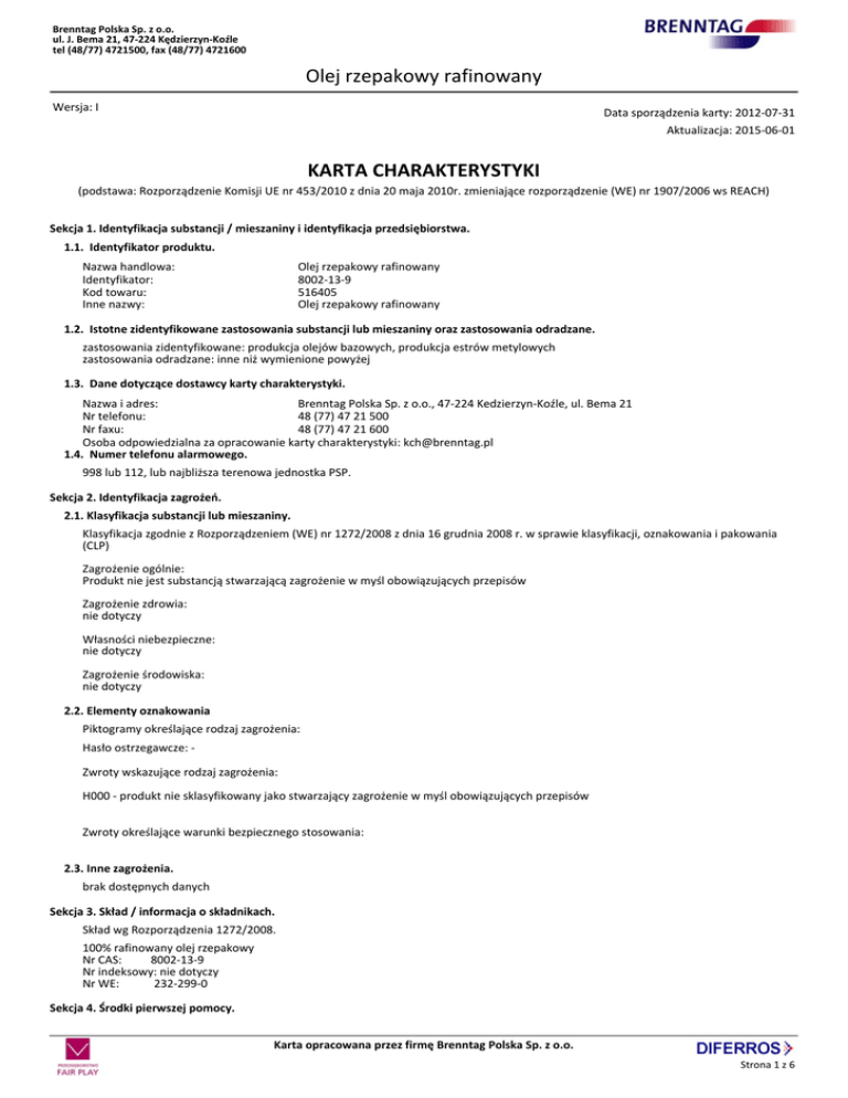 Brenntag Polska Sp. z o.o. ul. J. Bema 21, 47-224 Kędzierzyn-Koźle tel (48/77) 4721500, fax (48/77) 4721600 Olej rzepakowy rafinowany Wersja: I Data sporządzenia karty: 2012-07-31 Aktualizacja: 2015-06-01 KARTA CHARAKTERYSTYKI (podstawa: Rozporządzenie Komisji UE nr 453/2010 z dnia 20 maja 2010r. zmieniające rozporządzenie (WE) nr 1907/2006 ws REACH) Sekcja 1. Identyfikacja substancji / mieszaniny i identyfikacja przedsiębiorstwa. 1.1. Identyfikator produktu. Nazwa handlowa: Identyfikator: Kod towaru: Inne nazwy: Olej rzepakowy rafinowany 8002-13-9 516405 Olej rzepakowy rafinowany 1.2. Istotne zidentyfikowane zastosowania substancji lub mieszaniny oraz zastosowania odradzane. zastosowania zidentyfikowane: produkcja olejów bazowych, produkcja estrów metylowych zastosowania odradzane: inne niż wymienione powyżej 1.3. Dane dotyczące dostawcy karty charakterystyki. Nazwa i adres: Brenntag Polska Sp. z o.o., 47-224 Kedzierzyn-Koźle, ul. Bema 21 Nr telefonu: 48 (77) 47 21 500 Nr faxu: 48 (77) 47 21 600 Osoba odpowiedzialna za opracowanie karty charakterystyki: [email protected] 1.4. Numer telefonu alarmowego. 998 lub 112, lub najbliższa terenowa jednostka PSP. Sekcja 2. Identyfikacja zagrożeń. 2.1. Klasyfikacja substancji lub mieszaniny. Klasyfikacja zgodnie z Rozporządzeniem (WE) nr 1272/2008 z dnia 16 grudnia 2008 r. w sprawie klasyfikacji, oznakowania i pakowania (CLP) Zagrożenie ogólnie: Produkt nie jest substancją stwarzającą zagrożenie w myśl obowiązujących przepisów Zagrożenie zdrowia: nie dotyczy Własności niebezpieczne: nie dotyczy Zagrożenie środowiska: nie dotyczy 2.2. Elementy oznakowania Piktogramy określające rodzaj zagrożenia: Hasło ostrzegawcze: Zwroty wskazujące rodzaj zagrożenia: H000 - produkt nie sklasyfikowany jako stwarzający zagrożenie w myśl obowiązujących przepisów Zwroty określające warunki bezpiecznego stosowania: 2.3. Inne zagrożenia. brak dostępnych danych Sekcja 3. Skład / informacja o składnikach. Skład wg Rozporządzenia 1272/2008. 100% rafinowany olej rzepakowy Nr CAS: 8002-13-9 Nr indeksowy: nie dotyczy Nr WE: 232-299-0 Sekcja 4. Środki pierwszej pomocy. Karta opracowana przez firmę Brenntag Polska Sp. z o.o. Strona 1 z 6 Brenntag Polska Sp. z o.o. ul. J. Bema 21, 47-224 Kędzierzyn-Koźle tel (48/77) 4721500, fax (48/77) 4721600 Olej rzepakowy rafinowany 4.1. Opis środków pierwszej pomocy. Wdychanie: Nie stwarza zagrożenia, brak szczególnych zaleceń Kontakt ze skórą: Nie stwarza zagrożenia, brak szczególnych zaleceń Kontakt z oczami: Nie stwarza zagrożenia, brak szczególnych zaleceń Spożycie: Nie stwarza zagrożenia, brak szczególnych zaleceń 4.2. Najważniejsze ostre i opóźnione objawy oraz skutki narażenia. brak dostępnych danych 4.3. Wskazania dotyczące wszelkiej natychmiastowej pomocy lekarskiej i szczególnego postępowania z poszkodowanym. brak dostępnych danych Sekcja 5. Postępowanie w przypadku pożaru. 5.1. Środki gaśnicze. proszki gaśnicze, dwutlenek węgla Nie stosować wody 5.2. Szczególne zagrożenia związane z substancją lub mieszaniną. brak dostępnych danych 5.3. Informacje dla straży pożarnej. Stosować niezalezny aparat oddechowy, ubranie ochronne Sekcja 6. Postępowanie w przypadku niezamierzonego uwolnienia do środowiska. 6.1. Indywidualne środki ostrożności, wyposażenie ochronne i procedury w sytuacjach awaryjnych. brak dostępnych danych 6.2. Środki ostrożności w zakresie ochrony środowiska. Nie dopuścić do przedostania sie do kanalizacji i wód. 6.3. Metody i materiały zapobiegające rozprzestrzenianiu się skażenia i służące do usuwania skażenia. Rozlewy przysypać materiałem chłonnym (np. piasek, trociny), zebrać do zamykanego pojemnika i przekazać do zniszczenia. 6.4. Odniesienia do innych sekcji. Informacje dotyczące odpowiedniego sprzętu ochrony osobistej podano w sekcji 8. Informacje dotyczące obróbki odpadów podano w sekcji 13. Sekcja 7. Postępowanie z substancjami i mieszaninami oraz ich magazynowanie. 7.1. Środki ostrożności dotyczące bezpiecznego postępowania. Zapewnić skuteczną wentylację. Unikać bezpośredniego kontaktu z produktem. 7.2. Warunki bezpiecznego magazynowania, łącznie z informacjami dotyczącymi wszelkich wzajemnych niezgodności. Przechowywać w oryginalnych opakowaniach w suchym, chłodnym i zaciemnionym pomieszczeniu. Przechowywać w temperaturze < 25°C. 7.3. Szczególne zastosowania końcowe. brak dostępnych danych Sekcja 8. Kontrola narażenia / środki ochrony indywidualnej. 8.1. Parametry dotyczące kontroli. Najwyższe dopuszczalne stężenia: NDS, NDSCh - nie oznaczono (wg Rozporzadzenia MPiPS z dn. 29 listopada 2002 ; Dz.U. Nr 217, poz. 1833 z późniejszymi zmianami) Zalecenia dotyczące procedury monitoringu zawartości składników niebezpiecznych w powietrzu – metodyka pomiarów: -Rozporządzenie Ministra Zdrowia z dnia 20 kwietnia 2005 r. w sprawie badań i pomiarów czynników szkodliwych dla zdrowia w środowisku pracy (Dz.U. Nr 73, poz.645) -PN-89/Z-01001/06. Ochrona czystości powietrza. Nazwy, określenia i jednostki. Terminologia dotycząca badań jakości powietrza na stanowiskach pracy. Karta opracowana przez firmę Brenntag Polska Sp. z o.o. Strona 2 z 6 Brenntag Polska Sp. z o.o. ul. J. Bema 21, 47-224 Kędzierzyn-Koźle tel (48/77) 4721500, fax (48/77) 4721600 Olej rzepakowy rafinowany -PN Z-04008-7:2002. Ochrona czystości powietrza. Pobieranie próbek. Zasady pobierania próbek powietrza w środowisku pracy i interpretacja wyników. -PN-EN-689: 2002. Powietrze na stanowiskach pracy – wytyczne oceny narażenia inhalacyjnego na czynniki chemiczne przez porównanie z wartościami dopuszczalnymi i strategia pomiarowa. Uwaga: Gdy stężenie substancji jest ustalone i znane, doboru środków ochrony indywidualnej należy dokonywać z uwzględnieniem stężenia substancji występującego na danym stanowisku pracy, czasu ekspozycji oraz czynności wykonywanych przez