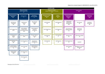 Załącznik do uchwały Zarządu Nr 468/29/III/2016 z dnia 06.04.2016 r. ZARZĄD Wiceprezes Zarządu Dyrektor Techniczny DT Zakład Zarządzania Majątkiem TM Zakład Serwisu TS Wiceprezes Zarządu Dyrektor Ekonomiczno-Finansowy DE Departament Rozwoju Majątku TI Departament Handlu i Marketingu EH Biuro Rozwoju Majątku IBM Dział Windykacji HW Serwis Obiektów Produkcji Wody i Oczyszczania Ścieków SPW Biuro Zarządzania Programem Inwestycyjnym IB Dział Obsługi Klienta HK Dział Oczyszczania Ścieków MOŚ Serwis Sieci Wod-Kan SWK Biuro ds. TerenowoPrawnych IBT Dział Marketingu HM Dział Eksploatacji Sieci Wod-Kan ME Serwis Energetyczny SE Dział Zarządzania Informacją o Majątku MI Serwis Automatyki SA Centralny System Zarządzania CSZ Serwis Mechaniczny SM Dział Rozliczeń Eksploatacji MR Dział Rozliczeń Serwisu SR Dział Produkcji Wody MPW Specjalista ds. Kosztorysowania IK Dział Informatyki EI Główny Księgowy EK G ł ó w n a Prezes Zarządu ND Departament Rozwoju Kapitałowego i Organizacji DDR Departament Technologii DDB iDział Księgowości KK Dział Rozwoju Kapitałowego i Restrukturyzacji RKR Biuro Zarządu BZ Dział Zaopatrzenia EZ Dział Zarządzania Zasobami Ludzkimi RZ Dział Kontroli Wewnętrznej DU Dział Kadr i Płac RK Dział Ochrony Zakładu DZ Dział Administracyjny RA Dział BHP Dział Controllingu EC Dział Finansowy EF Dział Zarządzania Środowiskowego TOS Dział Przetargów RP Specjalista ds. Procesów Biznesowych DP Serwis Transportu ST Obowiązuje od dnia 26.04.2016 r. …………………………………….. …………………………………….. ………..…………………………… Dział Badań Rozwojowych BR