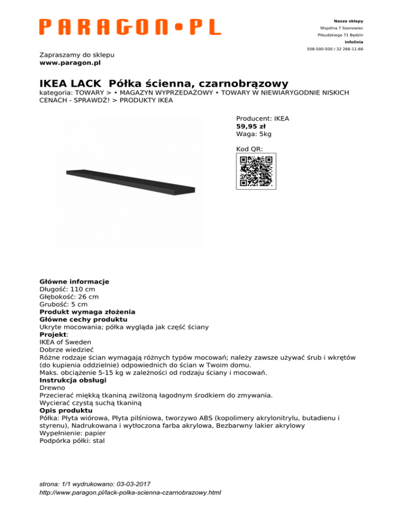 Nasze sklepy Wspólna 7 Sosnowiec Piłsudskiego 71 Będzin Infolinia 508-500-500 / 32 266-11-66 Zapraszamy do sklepu www.paragon.pl IKEA LACK Półka ścienna, czarnobrązowy kategoria: TOWARY > • MAGAZYN WYPRZEDAŻOWY • TOWARY W NIEWIARYGODNIE NISKICH CENACH - SPRAWDŹ! > PRODUKTY IKEA Producent: IKEA 59,95 zł Waga: 5kg Kod QR: Główne informacje Długość: 110 cm Głębokość: 26 cm Grubość: 5 cm Produkt wymaga złożenia Główne cechy produktu Ukryte mocowania; półka wygląda jak część ściany Projekt: IKEA of Sweden Dobrze wiedzieć Różne rodzaje ścian wymagają różnych typów mocowań; należy zawsze używać śrub i wkrętów (do kupienia oddzielnie) odpowiednich do ścian w Twoim domu. Maks. obciążenie 5-15 kg w zależności od rodzaju ściany i mocowań. Instrukcja obsługi Drewno Przecierać miękką tkaniną zwilżoną łagodnym środkiem do zmywania. Wycierać czystą suchą tkaniną Opis produktu Półka: Płyta wiórowa, Płyta pilśniowa, tworzywo ABS (kopolimery akrylonitrylu, butadienu i styrenu), Nadrukowana i wytłoczona farba akrylowa, Bezbarwny lakier akrylowy Wypełnienie: papier Podpórka półki: stal strona: 1/1 wydrukowano: 03-03-2017 http://www.paragon.pl/lack-polka-scienna-czarnobrazowy.html