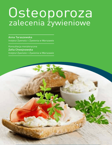 Anna Taraszewska Instytut Żywności i Żywienia w Warszawie Konsultacja merytoryczna Zofia Chwojnowska Instytut Żywności i Żywienia w Warszawie mgr Anna Taraszewska Instytut Żywności i Żywienia w Warszawie Osteoporoza jest chorobą szkieletu, polegającą na zmniejszeniu odporności kości na złamania, które jest spowodowane małą gęstością mineralną kości, pogorszeniem ich jakości. Wiele czynników wpływa na gęstość i masę kości. Czynniki żywieniowe i środowiskowe oddziałujące na niską masę kości to: niedożywienie, mała zawartość wapnia i witaminy D w diecie, ale także duże spożycie białka oraz soli, zmniejszona ekspozycja na światło słoneczne, nadmierne spożycie alkoholu, kawy, palenie tytoniu, siedzący tryb życia czy długotrwałe unieruchomienie z różnych przyczyn. Prawidłowe żywienie jest jednym z czynników, które wpływają na utrzymanie kości w jak najlepszym stanie. Odpowiednia dieta odgrywa rolę zarówno w profilaktyce osteoporozy (sprzyja uzyskaniu kości dobrej jakości), jak również wspomaga jej leczenie. Do żywieniowych czynników powiązanych z osteoporozą należą: Czynniki zwiększające masę kostną (obniżają ryzyko wystąpienia osteoporozy) Czynniki obniżające masę kostną (zwiększają ryzyko wystąpienia osteoporozy) zgodne z zapotrzebowaniem spożycie wapnia, witamin D, C i K nadmiar białka, witaminy A, sodu w diecie odpowiednia proporcja między wapniem a fosforem kofeina obecność izoflawonoidów w diecie alkohol zbyt niska masa ciała (BMI* <18,5) * Body Mass Index (BMI) to wskaźnik wyrażony stosunkiem masy ciała (kg) do wysokości ciała (m2). Norma wskaźnika BMI dla dorosłych mężczyzn i kobiet wynosi od 18,5 do 24,9. 2 Wszystkie wymienione czynniki wpływają na stan kości. Ważne jest więc, aby codzienna dieta dostarczała odpowiednich ilości składników zwiększających masę kostną. Niezbilansowana dieta, palenie tytoniu, nadużywanie alkoholu, nadmierne spożycie kofeiny czy siedzący tryb życia w znacznym stopniu mogą zaburzyć osiągnięcie maksymalnej masy kości, a także wpływać na zwiększenie utraty masy kości w procesie starzenia. Składniki diety ważne w profilaktyce i leczeniu osteoporozy Wapń Wapń to niezbędny składnik mineralny, pełniący w organizmie wiele funkcji. Przede wszystkim jest on podstawowym elementem budującym kości i zęby – ok. 99% wapnia (głównie w postaci fosforanów) wchodzi właśnie w ich skład. Występuje też w płynach ustrojowych i tkankach miękkich, wpływa m.in. na prawidłowe funkcjonowanie mięśni, układu nerwowego, wspomaga regulację ciśnienia tętniczego krwi, odgrywa rolę w procesie krzepnięcia krwi. Wapń jest potrzebny do kształtowania szczytowej masy kostnej – wyznacznika stanu kości oraz ryzyka wystąpienia złamań w późniejszym wieku. Szczytowa masa kostna to maksymalna masa kości, która jest osiągana między 20. a 30. rż., dlatego spożywanie odpowiedniej ilości wapnia z dietą w dzieciństwie i młodości jest niezwykle istotne oraz stanowi ważny element profilaktyki osteoporozy. Aby osiągnąć jak najwyższą szczytową masę kostną w młodym wieku, dodatni bilans wapnia spożywanego codziennie z dietą przez pierwszych 20 lat życia w przypadku młodych mężczyzn powinien wynosić średnio 160 mg/dziennie, a w przypadku kobiet – 130 mg/dziennie. Z dodatnim bilansem wapnia mamy do czynienia wówczas, gdy ilość wapnia dostarczanego do 3 organizmu z jedzeniem jest większa niż ilość wapnia wydalanego z moczem, kałem i potem. Dodatni bilans wapnia sprzyja magazynowaniu tego składnika w organizmie, głównie w kościach. Mężczyźni kumulują w układzie kostnym więcej wapnia (1200 g) niż kobiety (1000 g). Poziom wapnia w organizmie regulują hormony (parathormon i kalcytonina) oraz witamina D, wpływając na: wchłanianie wapnia w jelicie cienkim, wydalanie z moczem oraz tworzenie tkanki kostnej bądź jej degradację. Odpowiednie spożycie wapnia z dietą wpływa nie tylko na prawidłowy wzrost szkieletu, ale także na straty wapnia wynikające z wydalania z moczem, kałem lub potem. Gdy spożycie wapnia jest zbyt niskie lub jego utrata zbyt duża, wówczas – aby utrzymać jego prawidłowy poziom – organizm uruchamia procesy prowadzące do uwalniania wapnia z kości, co powoduje, że kości stają się słabsze, a to sprzyja osteoporozie. Zapotrzebowanie na wapń Zapotrzebowanie jest różne i zależy od płci, wieku, a także stanu fizjologicznego (przedstawiono je w tabeli zbiorczej). Zalecane spożycie wapnia jest najwyższe u młodych osób, ponieważ w tym okresie następuje znaczny wzrost masy kostnej. Wyższe przyjmowanie wapnia poleca się też osobom starszym, gdyż wraz z wiekiem (oraz dodatkowo u kobiet na skutek zmian hormonalnych) zmniejsza się wchłanianie tego składnika mineralnego z przewodu pokarmowego. Źródła wapnia w diecie Najbardziej wartościowe źródła wapnia to mleko i produkty mleczne, zawierające laktozę (cukier mleczny), która zwiększa wchłanianie wapnia. Dodatkowo produkty te charakteryzuje odpowiedni stosunek wapnia do fosforu (1:1). Produkty mleczne odtłuszczone zawierają tyle samo wapnia co pełnotłuste. Osoby źle tolerujące laktozę mogą zastąpić mleko mlecznymi napojami fermentowanymi (jak kefir, jogurt) oraz serami żółtymi (ich spożycie nie powinno być jednak zbyt duże, gdyż zawierają sporo tłuszczu i soli). 4 Tabela 1. Zawartość wapnia w mleku i wybranych produktach mlecznych Produkt (100 g) Mleko 2% tłuszczu Kefir 2% tłuszczu Jogurt naturalny 2% tłuszczu Jogurt owocowy 1,5% tłuszczu Maślanka spożywcza 0,5% tłuszczu Ser gouda tłusty Parmezan Ser brie pełnotłusty Ser typu feta Ser topiony Ser twarogowy półtłusty Serek twarogowy ziarnisty Serek homogenizowany waniliowy Wapń (mg) 120 103 170 134 110 807 1380 600 500 367 94 80 85 Źródło: Kunachowicz H., Nadolna I., Przygoda B., Iwanow K.: Tabele składu 