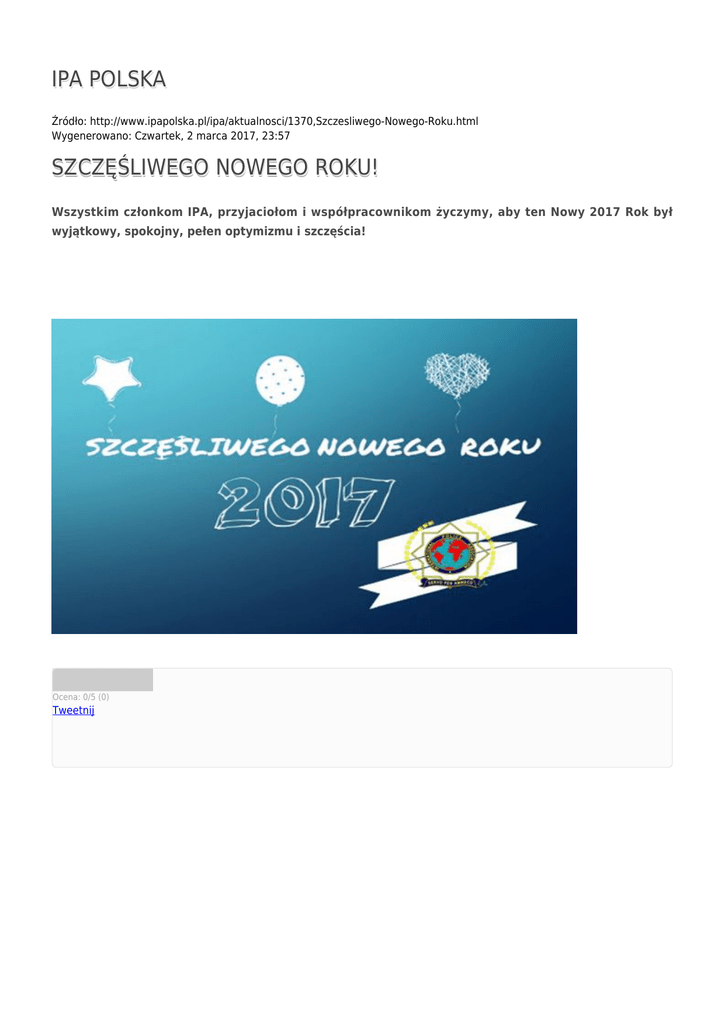IPA POLSKA Źródło: http://www.ipapolska.pl/ipa/aktualnosci/1370,Szczesliwego-Nowego-Roku.html Wygenerowano: Czwartek, 2 marca 2017, 23:57 SZCZĘŚLIWEGO NOWEGO ROKU! Wszystkim członkom IPA, przyjaciołom i współpracownikom życzymy, aby ten Nowy 2017 Rok był wyjątkowy, spokojny, pełen optymizmu i szczęścia! Ocena: 0/5 (0) Tweetnij