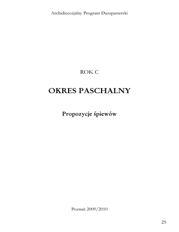 Archidiecezjalny Program Duszpasterski ROK C OKRES PASCHALNY Propozycje śpiewów Poznań 2009/2010 25 26 ROK C OKRES PASCHALNY I Niedziela Wielkanocna W. Wesoły nam dzień dziś nastał D. Otrzyjcie już łzy, płaczący K. Zwycięzca śmierci U. Alleluja, biją dzwony Z. Pan zmartwychwstał i jest z nami (dodatek nutowy) Regina caeli (Wesel się, Królowo miła) II Niedziela Wielkanocna – Niedziela Miłosierdzia Bożego Błogosławieni, którzy nie widzieli, a uwierzyli W. Bądź uwielbiony, miłosierny Boże D. Alleluja, alleluja, O dniu radosny K. Zbliżam się w pokorze U. Wysławiajmy Chrysta Pana; Panie mój, cóż Ci oddać mogę Z. Jezu, ufam Tobie; Miłosierdzie Boże, tryskające (dodatek nutowy) III Niedziela Wielkanocna Trzecie zjawienie się Zmartwychwstałego Apostołom W. Chrystus zmartwychwstał jest; Alleluja, żyje Pan D. Alleluja, biją dzwony; Gdzie jest, o śmierci, twoje zwycięstwo (dodatek nutowy) K. Wesoły nam dzień dziś nastał; Ojciec nam powierzył Słowo U. Alleluja, alleluja, alleluja. Chwalcie Pana, bo dobry Z. Przez twoje święte zmartwychpowstanie; Oto dzień, w którym Pan nasz zmartwychwstał (dodatek nutowy) IV Niedziela Wielkanocna Jezus daje swoim owcom życie wieczne W. O Panie, Tyś moim Pasterzem Ludu kapłański (9. zwrotka) D. Jeden chleb; Dobry Pasterzu, miłosierny Panie (dodatek nutowy) K. Panie, pragnienia ludzkich serc U. Cały świat niech śpiewa tę pieśń Oto dzień, w którym Pan nasz zmartwychwstał Z. Wstał Pan Chrystus z martwych ninie; Chrystus Pan zmartwychwstał, zwycięstwo otrzymał V Niedziela Wielkanocna Przykazanie nowe W. Złóżcie troski żałujący; Gdzie miłość wzajemna D. Przykazanie nowe daję wam K. Skosztujcie i zobaczcie U. Dzięki, o Panie, składamy dzięki; Panie mój, cóż Ci oddać mogę Z. Otrzyjcie już łzy, płaczący Dziś Chrystus Król wiecznej chwały VI Niedziela Wielkanocna Duch Święty was wszystkiego nauczy W. Zmartwychpowstał Pan prawdziwie D. Chrystus, to nadzieja cała nasza K. Błogosławieni, którzy zostali wezwani U. Radośnie Panu hymn śpiewajmy Z. Nie zna śmierci Pan żywota 27 VII Niedziela Wielkanocna – Wniebowstąpienie Pańskie W. Chrystus Pan w niebo wstępuje D. Przez Twoje święte Wniebowstąpienie; Otoczon gronem świętych Aniołów; Boże, zmiłuj się nad nami, pobłogosław, udziel łaski K. Ciebie całą duszą pragnę; Panie, pragnienia ludzkich serc U. Upadnij na kolana Z. Idźcie na cały świat; Ciesz się, Królowo Anielska Niedziela Zesłania Ducha Św. W. O Stworzycielu Duchu, przyjdź D. Duch Pański napełnił okrąg ziemi; Duchu Najświętszy, otwórz usta moje O Tajemniczy Płomieniu (ks. I. Pawlak - dodatek nutowy) K. Ojciec nam powierzył Słowo; Pan wieczernik przygotował U. Niech z serca płynie pieśń; Bogu Ojcu przez Jezusa Chrystusa Z. Pamiątkę dnia wesołego; Idźcie na cały świat; Otwórzcie serca, tchnienie daje Bóg W powyższych propozycjach pieśni zaczerpnięte są ze śpiewnika Exultate Deo (2004) i śpiewnika Siedleckiego (2001). Zaproponowano także kilka pieśni – do wyboru. 28