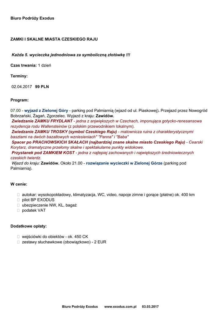 Biuro Podróży Exodus ZAMKI I SKALNE MIASTA CZESKIEGO RAJU Każda 5. wycieczka jednodniowa za symboliczną złotówkę !!! Czas trwania: 1 dzień Terminy: 02.04.2017 99 PLN Program: 07.00 - wyjazd z Zielonej Góry - parking pod Palmiarnią (wjazd od ul. Piaskowej). Przejazd przez Nowogród Bobrzański, Żagań, Zgorzelec. Wyjazd z kraju: Zawidów. Zwiedzanie ZAMKU FRYDLANT - jedna z anjwiększych w Czechach, imponująca gotycko-renesansowa rezydencja rodu Wallensteinów (z polskim przewodnikiem lokalnym). Zwiedzanie ZAMKU TROSKY (symbol Czeskiego Raju) - malownicza ruina z charakterystycznymi basztami na dwóch bazaltowych wzniesieniach" "Panna" i "Baba" Spacer po PRACHOWSKICH SKAŁACH (najbardziej znane skalne miasto Czeskiego Raju) - Cearski Korytarz, dramatyczne przełomy skalne i spektakularne punkty widokowe. Przystanek pod ZAMKIEM KOST - jedna z najlepiej zachowanych i największych średniowiecznych czeskich twierdz. Wjazd do kraju: Zawidów. Około 21.00 - rozwiązanie wycieczki w Zielonej Górze (parking pod Palmiarnią). W cenie: autokar: wysokopokładowy, klimatyzacja, WC, video, napoje zimne i gorące (płatne) ok. 400 km pilot BP EXODUS ubezpieczenie NW, KL, bagaż podatek VAT Dodatkowe opłaty: wejściówki do obiektów - ok. 450 CK zestawy słuchawkowe (obowiązkowo) - 2 EUR Biuro Podróży Exodus www.exodus.com.pl 03.03.2017