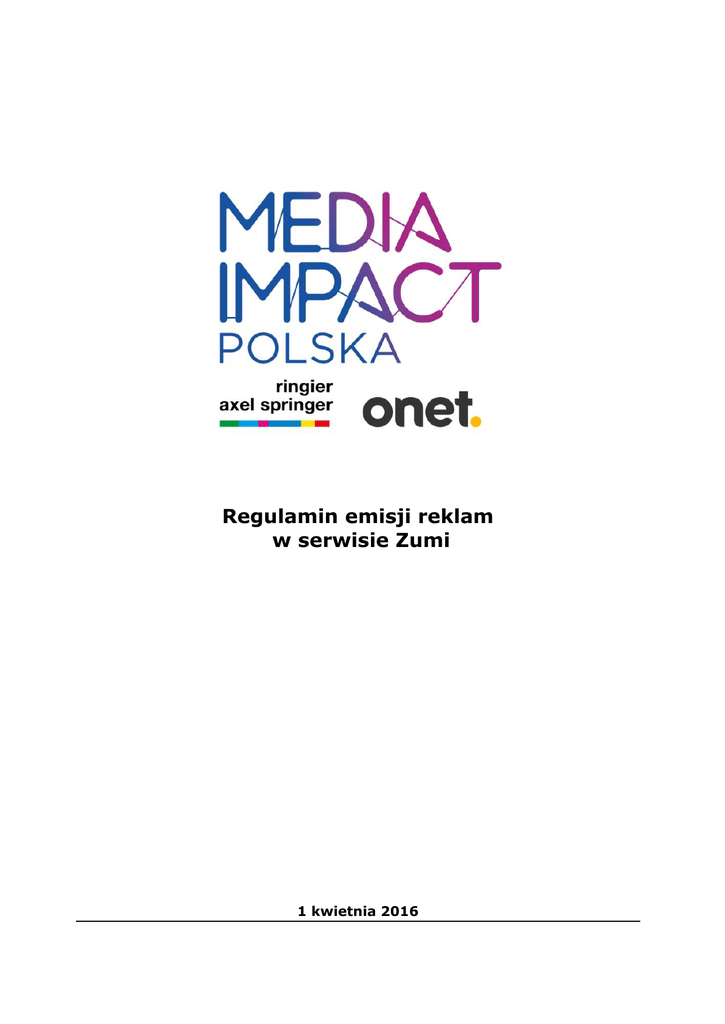 Regulamin emisji reklam w serwisie Zumi 1 kwietnia 2016 Regulamin emisji reklam w Serwisie Zumi 1. DEFINICJE 1.1. Grupa Onet.pl SA, Onet – Grupa Onet.pl SA, ul. Pilotów 10, 31-462 Kraków; wpisana do rejestru przedsiębiorców prowadzonego przez Sąd Rejonowy dla miasta Kraków Śródmieście, XI Wydział Gospodarczy, pod numerem KRS 0000007763, kapitał zakładowy 7 580 648,00 zł (wniesiony w całości), NIP 734-00-09-469, określana w dalszej części regulaminu także jako Onet 1.2. Ringier Axel Springer Polska Sp. z o.o., RASP - Ringier Axel Springer Polska Sp. z o.o., z siedzibą w Warszawie przy ul. Domaniewskiej 52, wpisana do rejestru przedsiębiorców prowadzonego przez Sąd Rejonowy dla m.st. Warszawy, XIII Wydział Gospodarczy Krajowego Rejestru Sądowego, pod numerem KRS 0000108017 określana w dalszej części regulaminu także jako RASP. 1.3. MIP - MEDIA IMPACT POLSKA sp. z o.o. z siedzibą w Warszawie przy ul. Domaniewskiej 52, wpisana do rejestru przedsiębiorców prowadzonego przez Sąd Rejonowy dla m. st. Warszawy, XIII Wydział Gospodarczy Krajowego Rejestru Sądowego, pod numerem KRS: 0000475673, spółka zajmująca się sprzedażą powierzchni reklamowej Onet i RASP. 1.4. Serwisy Onet – wszystkie serwisy internetowe, których właścicielem jest Onet, w tym Serwis Zumi. 1.5. Umowa – Zamówienie emisji produktu reklamowego wraz z treścią niniejszego Regulaminu, którego przedmiotem jest emisja kampanii reklamowej Zamawiającego, wraz z wszelkimi dodatkowymi uzgodnieniami Stron dotyczącymi emisji kampanii reklamowej, zawartymi pod rygorem nieważności w formie pisemnej i podpisanej przez upoważnionego przedstawiciela Zamawiającego lub drogą telefoniczną po odczytaniu przez przedstawiciela MIP i zaakceptowaniu przez Zamawiającego odpowiedniego oświadczenia. 1.6. Zamawiający – przedsiębiorca, będący osobą fizyczna, osobą prawną lub jednostką nie posiadającą osobowości prawnej, składający Zamówienie emisji reklamy („Zamówienie”). 1.7. Gotowe materiały reklamowe – materiały (kreacje graficzne, zdjęcia, opisy, dane teleadresowe, informacje promocyjne itp.) w plikach w formatach *.txt, *.doc, *.jpg, *.gif, flash, *.html lub rich media, w formie gotowej do wykorzystania jako reklama, zgodne ze specyfikacją poszczególnych form reklamowych, dostępnych pod adresem www.reklama.zumi.pl. 1.8. Emisja – jednorazowe wyświetlenie formy reklamowej wraz ze stroną WWW, na której jest ona umieszczona. 1.9. Serwis Zumi – serwis internetowy (www) oferowany przez Onet w domenie: www.zumi.pl – jest to narzędzie, umożliwiające poszukiwanie i lokalizowanie różnego rodzaju adresów, obiektów (tj. np. obiektów użyteczności publicznej, firm, nieruchomości, itp.) na mapach oraz zapoznanie się z w/w obiektami poprzez dostępne w Serwisie Zumi Multimedia. 1.10. Multimedia – zdjęcia, Panoramy, ZumiWideo oraz inne narzędzia prezentowane w Serwisie Zumi. 2. WARUNKI OGÓLNE, ODPOWIEDZIALNOŚĆ, LICENCJA 2.1. Zawierając Umowę Zamawiający wyraża zgodę na publikację w Serwisie Zumi materiałów reklamowych przekazanych przez Zamawiającego, przez okres obowiązywania licencji, o której mowa w pkt. 2.4.4 poniżej. 2.2. Produkty reklamowe sprzedawane są na podstawie Umowy, która określa liczbę emisji (wyświetleń) danego produktu lub na określony Zamówieniem czas, chyba że postanowienia Umowy stanowią inaczej. MEDIA IMPACT POLSKA Sp. z o.o. z siedzibą w Warszawie przy ul. Domaniewskiej 52, wpisana do rejestru przedsiębiorców prowadzonego przez Sąd Rejonowy dla m. st. Warszawy, XIII Wydział Gospodarczy Krajowego Rejestru Sądowego, pod numerem KRS: 0000475673, kapitał zakładowy spółki (wpłacony): 880 000 zł, NIP: 5213655064 2.2.1. Sprzedaż emisji na określony czas z zastrzeżeniem punktu 3.15 (w cyklach miesięcznych) dotyczy form reklamowych umieszczanych na stronach Serwisu Zumi oraz ewentualnie innych Serwisów Onet na stałe, a w szczególności: Zumi Link Regionalny, ZumiPage, Minilogosy, Zumi Banner na słowa kluczowe, Serwis Specjalny, Zumi Efekt, Zumiwideo, Zumi Kontekst, Zumi Landing Page, Link Sponsorowany w wyszukiwarce Onet, ZumiPack, ZumiSocial, Zumi Offers, Onet wizytówka. 2.2.2. Sprzedaż na określoną liczbę emisji danego produktu (np. ilość wyświetleń Bannera, ilość kont pocztowych na które zostanie wysłany mailing) dotyczy form reklamowych opisanych na stronach Serwisu Zumi a w szczególności:, Zumi City, ZumiNavibox, ZumiDirect, ZumiCorner, Billboard. 2.2.3. Sprzedaż produktów wymagających pełnej przedpłaty np. Zumi SEM, Facebook Ads, dla których specyfikacja techniczna oraz regulamin usługi dostępny jest pod adresem http://reklama.zumi.pl/1628328,Zumi+SEM,produkty.html 2.3. Zamawiający oświadcza, iż dostarczone przez Zamawiającego lub pozyskane ze źródeł ogólnodostępnych, tj. ze strony internetowej Zamawiającego materiały słowne i graficzne, w tym wykorzystywane przez niego znaki towarowe oraz materiały reklamowe, nie naruszają przepisów prawa, dobrych obyczajów, prawem chronionych dóbr osób lub podmiotów trzecich ani też praw na dobrach niematerialnych (autorskie, pokrewne, wynalazcze, na znakach towarowych lub wzorach zdobniczych, z tytułu tajemnicy przedsiębiorstwa, praw własności przemysłowej i inne) oraz jest on uprawniony do ich używania. 2.4. Zamawiający oświadcza iż: 2.4.1. Jest uprawniony do wyrażenia i wyraża zgodę na wykonanie, rozpowszechnianie i korzystanie w dowolnym celu, dowolną techniką, w dowolny sposób z wszelkich materiałów wykonanych w związku z realizacją Zamówienia, w szczególności materiałów koniecznych do realizacji Zamówienia dostarczonych przez niego lub pozyskanych ze źródeł ogólnodostępnych, tj. jego strony internetowej. Powyższa zgoda udzielona jest na rzecz MIP oraz podmiotów wskazanych przez MIP. 2.4.2. wykonanie, rozpowszechnianie i korzystanie z materiałów wykonanych w związku z realiza