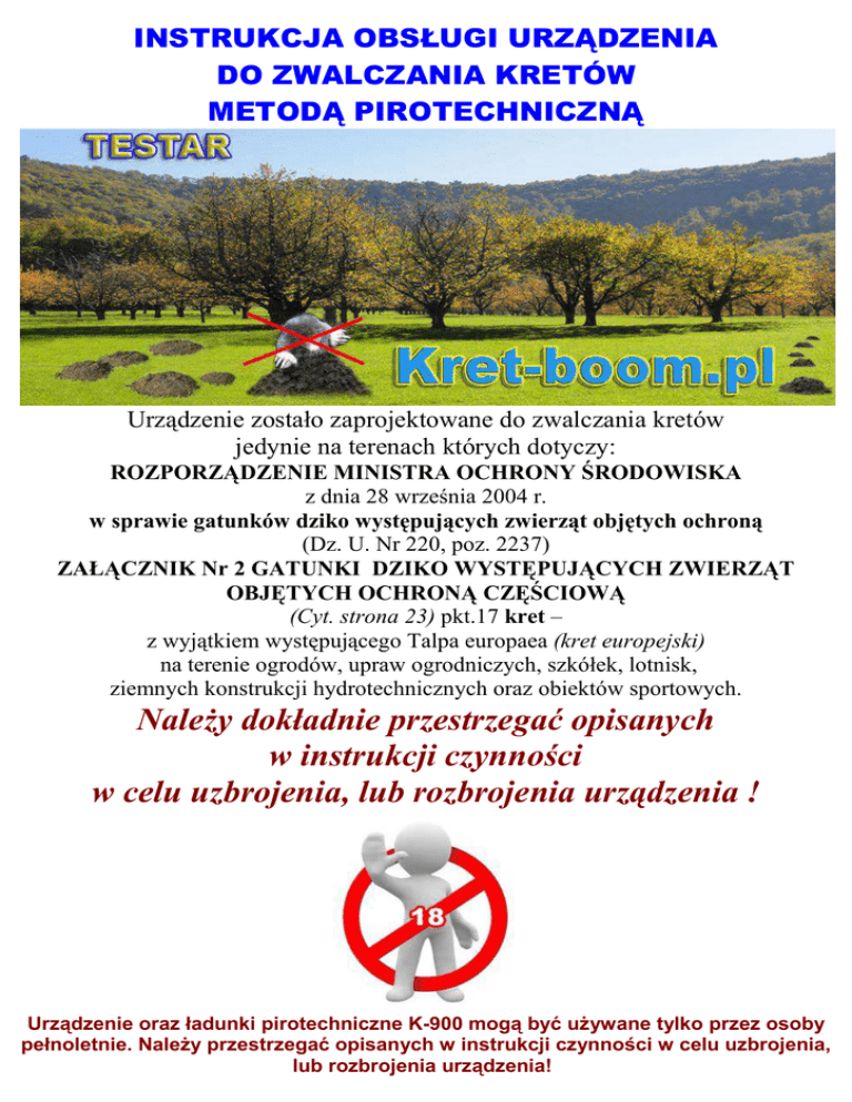 INSTRUKCJA OBSŁUGI URZĄDZENIA DO ZWALCZANIA KRETÓW METODĄ PIROTECHNICZNĄ Urządzenie zostało zaprojektowane do zwalczania kretów jedynie na terenach których dotyczy: ROZPORZĄDZENIE MINISTRA OCHRONY ŚRODOWISKA z dnia 28 września 2004 r. w sprawie gatunków dziko występujących zwierząt objętych ochroną (Dz. U. Nr 220, poz. 2237) ZAŁĄCZNIK Nr 2 GATUNKI DZIKO WYSTĘPUJĄCYCH ZWIERZĄT OBJĘTYCH OCHRONĄ CZĘŚCIOWĄ (Cyt. strona 23) pkt.17 kret – z wyjątkiem występującego Talpa europaea (kret europejski) na terenie ogrodów, upraw ogrodniczych, szkółek, lotnisk, ziemnych konstrukcji hydrotechnicznych oraz obiektów sportowych. Należy dokładnie przestrzegać opisanych w instrukcji czynności w celu uzbrojenia, lub rozbrojenia urządzenia ! Urządzenie oraz ładunki pirotechniczne K-900 mogą być używane tylko przez osoby pełnoletnie. Należy przestrzegać opisanych w instrukcji czynności w celu uzbrojenia, lub rozbrojenia urządzenia! Instrukcja obsługi – krok po kroku. 1. Wysuń pokrywę baterii w urządzeniu, następnie załóż 2 załączone baterie LR6 AA zgodnie z oznaczeniem (+, -) nie pomyl biegunów baterii (nie należy stosować akumulatorków) ! Koniecznie sprawdź połączenie styków baterii w koszyczku – jeśli baterie nie przylegają do biegunów – przesuń ręcznie baterie tak, żeby jej elektrody dokładnie przylegały do styków elektrycznych w koszyczku. Zaleca się stosowanie baterii alkalicznych a w okresie jesienno zimowym zalecane jest stosowanie wyłącznie nowych baterii, ze względu na obniżoną temperaturę przygruntową. Zbyt niskie napięcie baterii może unieruchomić urządzenie. 2. Zamknij pokrywę baterii. 3. Znajdź możliwie najnowsze miejsce bytowania kreta (świeżo zrobiony kopiec) 4. Usuń nadmiar ziemi z tego kopca, do momentu odnalezienia otworu (norki) kreta. 5. Wyjmij z opakowania jeden ładunek hukowy i lekko rozerwij końcówki przewodów elektrycznych, 6. Zakręć przewody elektryczne ładunku do załączonej w zestawie wtyczki małym śrubokrętem. Pamiętaj, żeby przewody elektryczne nie były zwarte pomiędzy sobą. (zdjęcie poniżej) UZABRAJANIE URZĄDZENIA 7. Włóż przygotowany ładunek do norki kreta a na powierzchni pozostaw wtyczkę wraz z przewodami. 8. Wciśnij urządzenie metalowym szpicem do gruntu, obok norki kreta (nie wbijaj jej w kanał norki, osłabi to stabilizację urządzenia). Wciśnij go obok otworu tak, żeby talerzyk dźwigni detonatora był w centrum otworu kretowiska a ładunek pirotechniczny znajdował się poniżej talerzyka, na głębokości około 10 cm. od talerzyka detonatora. 9. Podłącz przygotowany ładunek do gniazda w dolnej części urządzenia. (zobacz rysunek) Wprowadzając do norki kreta ładunek pirotechniczny, sprawdź odległość ładunku od talerzyka detonatora. Ładunek nie powinien być zbyt blisko talerzyka. W czasie detonacji, zbyt bliska odległość może spowodować zniszczenie urządzenia. Wbijając urządzenie, należy zachować kąt, pod jakim kret wydrążył swój kanał (chodzi o to, żeby dźwignia detonatora, będąca w norce kreta mogła poruszać się swobodnie w otworze. 10. Po wbiciu urządzenia w grunt, przesuń dźwignię detonatora lekko ku dołowi, w celu zwolnienia dźwigni ze stanu włączenia do stanu czuwania (Jest to ważne, ponieważ w czasie montażu urządzenia w ziemi, może powstać przypadkowe wciśnięcie dźwigni detonatora (nie spowoduje to wówczas odpalenia ładunku – w takim przypadku urządzenie nie da się uzbroić). Prawidłowe podłączenie ładunku pirotechnicznego powinny zasygnalizować diody świecące w górnej części urządzenia, migając przemiennie kolorem czerwonym i żółtym przez ok.20 sekund. Oznacza to, że urządzenie wykryło podłączony ładunek pirotechniczny. 11. Kiedy dioda żółta w urządzeniu zacznie migać pulsacyjnie co pół sekundy, oznacza to, że układ jest gotowy do uzbrojenia. Należy odczekać ok.10 sekund przed uzbrojeniem. 12. W celu uzbrojenia prawidłowo zamontowanego urządzenia, należy skierować pilota w kierunku górnej części urządzenia (odbiornika) i z odległości około pół metra wcisnąć i przytrzymać przycisk do momentu zaświecenia się na pilocie diody sygnalizacyjnej koloru czerwonego. Należy pamiętać, że pilot działa tylko jedną stroną – widoczna w nim dioda nadawcza znajduje się tylko z jednej strony pilota. (zobacz rysunek nr.1) (zdjęcie pilota) Rysunek nr.1 sterowanie pilotem 13. Urządzenie uzbroi się po około 10 sekundach. Stan uzbrajania sygnalizuje dioda żółta migając pulsacyjnie, oraz jednocześnie dioda czerwona świecąc światłem ciągłym. 14. Stan pełnego uzbrojenia sygnalizuje tylko dioda czerwona migając co 10 sekund. 15. Od tego momentu urządzenie jest w pełni uzbrojone i gotowe do odpalenia ładunku przez kreta. UWAGI Jeżeli po włączeniu na pilocie przycisku „włącz” – urządzenie nie da się uzbroić – oznacza to, że wciśnięta została dźwignia detonatora w czasie wkładania urządzenia w ziemię. Należy ją odciągnąć lekko w dół i ponownie rozpocząć uzbrajanie. NALEŻY PAMIĘTAĆ ! Aby nie doszło do przypadkowego odpalenia ładunku, należy zwrócić szczególną uwagę na dzieci, zwierzęta domowe… Urządzenia w stanie uzbrojonym nie należy dotykać. Poruszenie urządzeniem w stanie uzbrojonym może spowodować przypadkowe odpalenie ładunku pirotechnicznego ! 16. Od momentu uzbrojenia możemy oczekiwać na przybycie kreta. Przychodzi on najczęściej do kopca w celu zasypania jego wyjścia, podnosząc nadmiar ziemi ku górze. Jeśli pułapka zadziała i dojdzie do detonacji ładunku w norce kreta, urządzenie samoczynnie się wyłączy, dioda sygnalizacji zgaśnie i wtedy mamy pewność że urządzenie zadziałało prawidłowo. (ładunek odpalany jest pod ziemią, a jego detonacja jest niewielka i nie słychać jej na powierzchni). UWAGI I BŁĘDY Jeśli wszystko zostało podłączon