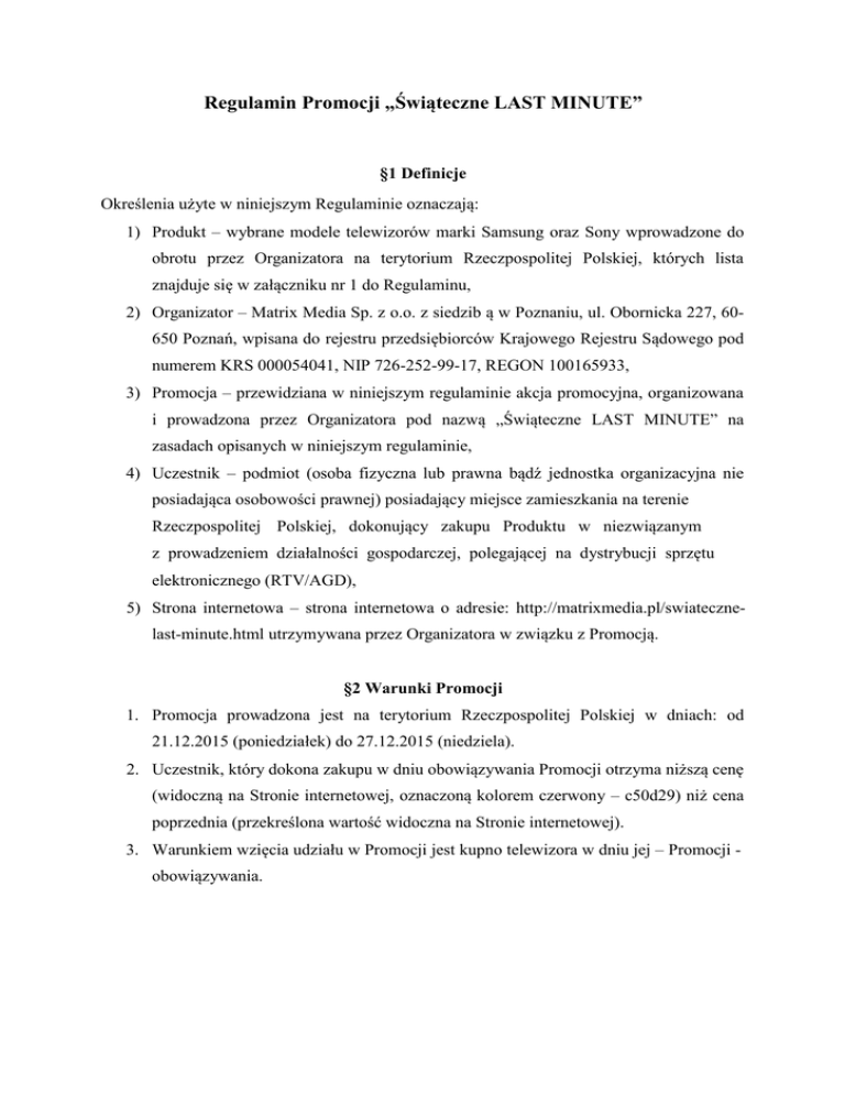 Regulamin Promocji „Świąteczne LAST MINUTE” §1 Definicje Określenia użyte w niniejszym Regulaminie oznaczają: 1) Produkt – wybrane modele telewizorów marki Samsung oraz Sony wprowadzone do obrotu przez Organizatora na terytorium Rzeczpospolitej Polskiej, których lista znajduje się w załączniku nr 1 do Regulaminu, 2) Organizator – Matrix Media Sp. z o.o. z siedzib ą w Poznaniu, ul. Obornicka 227, 60650 Poznań, wpisana do rejestru przedsiębiorców Krajowego Rejestru Sądowego pod numerem KRS 000054041, NIP 726-252-99-17, REGON 100165933, 3) Promocja – przewidziana w niniejszym regulaminie akcja promocyjna, organizowana i prowadzona przez Organizatora pod nazwą „Świąteczne LAST MINUTE” na zasadach opisanych w niniejszym regulaminie, 4) Uczestnik – podmiot (osoba fizyczna lub prawna bądź jednostka organizacyjna nie posiadająca osobowości prawnej) posiadający miejsce zamieszkania na terenie Rzeczpospolitej Polskiej, dokonujący zakupu Produktu w niezwiązanym z prowadzeniem działalności gospodarczej, polegającej na dystrybucji sprzętu elektronicznego (RTV/AGD), 5) Strona internetowa – strona internetowa o adresie: http://matrixmedia.pl/swiatecznelast-minute.html utrzymywana przez Organizatora w związku z Promocją. §2 Warunki Promocji 1. Promocja prowadzona jest na terytorium Rzeczpospolitej Polskiej w dniach: od 21.12.2015 (poniedziałek) do 27.12.2015 (niedziela). 2. Uczestnik, który dokona zakupu w dniu obowiązywania Promocji otrzyma niższą cenę (widoczną na Stronie internetowej, oznaczoną kolorem czerwony – c50d29) niż cena poprzednia (przekreślona wartość widoczna na Stronie internetowej). 3. Warunkiem wzięcia udziału w Promocji jest kupno telewizora w dniu jej – Promocji obowiązywania. §3 Dane osobowe 1) Administratorem danych osobowych Uczestników jest Organizator, 2) Dane osobowe Uczestników przetwarzane będą przez Organizatora w celu zrealizowania zamówienia złożonego na Produkt, 3) Przetwarzanie danych osobowych odbywać się będzie na zasadach przewidzianych ustawą z dnia 29 sierpnia 1997 r. o ochronie danych osobowych (Dz. U. 2002 Nr 101 poz. 926 z późn. zm.). §4 Postanowienia końcowe 1. Treść niniejszego Regulaminu dostępna jest w siedzibie Organizatora oraz na Stronie internetowej. 2. We wszystkich sprawach nieuregulowanych w niniejszym Regulaminie zastosowanie mają przepisy polskiego prawa. Wszelkie opracowania na podstawie niniejszego Regulaminu maja charakter tylko informacyjny. 3. Promocja nie łączy się z innymi promocjami prowadzonymi przez Organizatora. 4. Przez przystąpienie do Promocji Uczestnik potwierdza, że zapoznał się z Regulaminem, wyraża zgodę na jego postanowienie, oraz obowiązuje się do jego przestrzegania. 5. Organizator nie przewiduje możliwości zmiany świadczenia objętego Promocją na jego ekwiwalent pieniężny lub jakiekolwiek inne świadczenie. Załącznik nr 1. „Produkty”: SAMSUNG: SONY: UE48JS9000 48W705 UE48JS8500 43W809 UE40JU6000 50W809 UE48JU6000 50W755 UE55JU6000 65W855 UE55JU7500 43X8305 UE65JS9500 49X8309 UE65JU6000 55X9005 UE65JU7500 55S8505 UE75JU7000 65X8505C UE78JS9500 65X9005C UE85JU7000 65X9305C UE50JU6800 75X9405C UE60JU6800