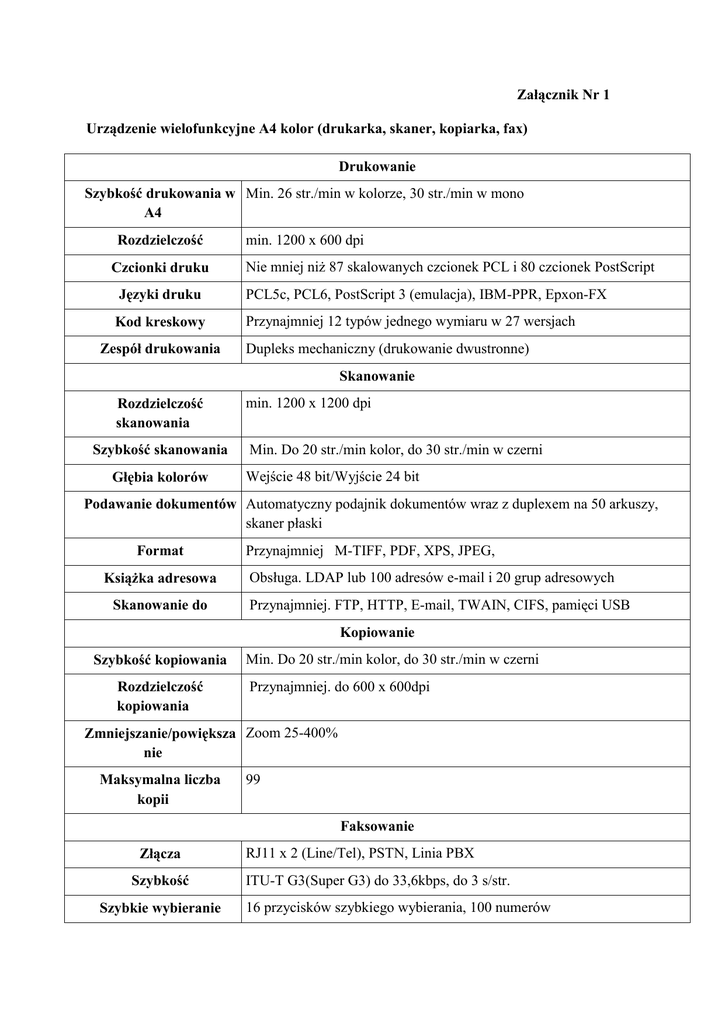 Załącznik Nr 1 Urządzenie wielofunkcyjne A4 kolor (drukarka