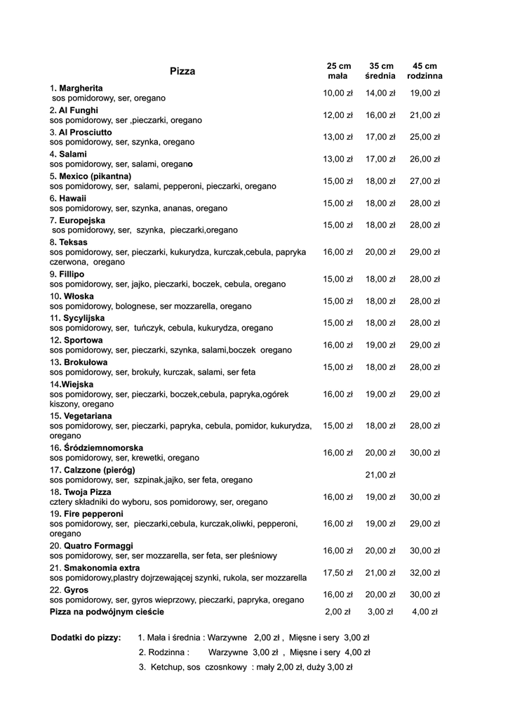 Pizza 1. Margherita sos pomidorowy, ser, oregano 2. Al Funghi sos pomidorowy, ser ,pieczarki, oregano 3. Al Prosciutto sos pomidorowy, ser, szynka, oregano 4. Salami sos pomidorowy, ser, salami, oregano oregano 5. Mexico (pikantna) sos pomidorowy, ser, salami, pepperoni, pieczarki, oregano 6. Hawaii sos pomidorowy, ser, szynka, ananas, oregano 7. Europejska sos pomidorowy, ser, szynka, pieczarki,oregano 8. Teksas sos pomidorowy, ser, pieczarki, kukurydza, kurczak,cebula, papryka czerwona, oregano 9. Fillipo sos pomidorowy, ser, jajko, pieczarki, boczek, cebula, oregano 10. 10. Włoska sos pomidorowy, bolognese, ser mozzarella, oregano 11. 11. Sycylijska sos pomidorowy, ser, tuńczyk, cebula, kukurydza, oregano 12. 12. Sportowa sos pomidorowy, ser, pieczarki, szynka, salami,boczek oregano 13. 13. Brokułowa sos pomidorowy, ser, brokuły, kurczak, salami, ser feta 14.Wiejska 14.Wiejska sos pomidorowy, ser, pieczarki, boczek,cebula, papryka,ogórek kiszony, oregano 15. 15. Vegetariana sos pomidorowy, ser, pieczarki, papryka, cebula, pomidor, kukurydza, oregano 16. 16. Śródziemnomorska sos pomidorowy, ser, krewetki, oregano 17. 17. Calzzone (pieróg) sos pomidorowy, ser, szpinak,jajko, ser feta, oregano 18. 18. Twoja Pizza cztery składniki do wyboru, sos pomidorowy, ser, oregano 19. 19. Fire pepperoni sos pomidorowy, ser, pieczarki,cebula, kurczak,oliwki, pepperoni, oregano 20. Quatro Formaggi sos pomidorowy, ser, ser mozzarella, ser feta, ser pleśniowy 21. Smakonomia extra sos pomidorowy,plastry dojrzewającej szynki, rukola, ser mozzarella 22. Gyros sos pomidorowy, ser, gyros wieprzowy, pieczarki, papryka, oregano Pizza na podwójnym cieście Dodatki do pizzy: 25 cm mała 35 cm średnia 45 cm rodzinna 10,00 zł 14,00 zł 19,00 zł 12,00 zł 16,00 zł 21,00 zł 13,00 zł 17,00 zł 25,00 zł 13,00 zł 17,00 zł 26,00 zł 15,00 zł 18,00 zł 27,00 zł 15,00 zł 18,00 zł 28,00 zł 15,00 zł 18,00 zł 28,00 zł 16,00 zł 20,00 zł 29,00 zł 15,00 zł 18,00 zł 28,00 zł 15,00 zł 18,00 zł 28,00 zł 15,00 zł 18,00 zł 28,00 zł 16,00 zł 19,00 zł 29,00 zł 15,00 zł 18,00 zł 28,00 zł 16,00 zł 19,00 zł 29,00 zł 15,00 zł 18,00 zł 28,00 zł 16,00 zł 20,00 zł 30,00 zł 21,00 zł 16,00 zł 19,00 zł 30,00 zł 16,00 zł 19,00 zł 29,00 zł 16,00 zł 20,00 zł 30,00 zł 17,50 zł 21,00 zł 32,00 zł 16,00 zł 20,00 zł 30,00 zł 2,00 zł 3,00 zł 4,00 zł 1. Mała i średnia : Warzywne 2,00 zł , Mięsne i sery 3,00 zł 2. Rodzinna : Warzywne 3,00 zł , Mięsne i sery 4,00 zł 3. Ketchup, sos czosnkowy : mały 2,00 zł, duży 3,00 zł FAST FOOD Hamburger XL z warzywami, kotletem własnej roboty i sosem 9,00 zł * Cheeseburger z warzywami, kotletem własnej roboty, serem i sosem 9,50 zł * Wrap z kurczakiem, warzywami, sosem ziołowym lub czosnkowym 12,00 zł * Wrap vega z warzywami, serem feta, sosem ziołowym lub czosnkowym 12,00 zł * Wrap z gyrosem wieprzowym, warzywami, sosem ziołowym lub czosnkowym 12,00 zł * Wrap z szynką, warzywami, sosem ziołowym lub czosnkowym 12,00 zł * Wrap z tuńczykiem, warzywami, sosem ziołowym lub czosnkowym 13,00 zł * SAŁATY Do każdej salaty podajemy ciepłe grzanki maślano – ziołowe * Bukiet sałat z grillowaną piersią kurczęcą w prażonym sezamie, pomidorem, papryką, czerwoną cebulą i dipem jogurtowym 12,00 zł * Sałata z plastrami szynki dojrzewającej,kaparami, suszonymi pomidorami i wiosennym Vinaigrette 12,00 zł * Drobiowe wątróbki w maśle czosnkowym na kompozycji sałat 12,00 zł * Sałatka grecka z oliwkami i fetą skropiona winnym octem i aromatyzowaną oliwą 11,00 zł * Sałata z gyrosem wieprzowym, pomidorem, ogórkiem,papryką, kukurydzą i dipem czosnkowym 12,00 zł * Bukiet grillowanych jarzyn zapiekany serem 15 zł * Sałatka brokułowa z jajkiem, prażonymi pestkami dyni, ogórkiem, pomidorem i dipem czosnkowym 12 zł ZUPY ( 350 ml) Podajemy z ciepłymi grzankami maślano – ziołowymi Flaki wołowe po staropolsku 10,00 zł * Zupa dnia (inspiracja szefa kuchni) 6,00 zł * DANIA GŁÓWNE Grillowany filet z piersi kurczaka podany z frytkami i świeżą sałatą z Vinaigrette 19,00 zł * Panierowana pierś kurczęca podana z purre ziemniaczanym i zestawem surówek sezonowych 18,00 zł * Filet schabowy w plastrach szynki dojrzewającej podany z pieczonymi ziemniakami i sałatą firmową 24,00 zł * Kotlet schabowy panierowany podany z purre ziemniaczanym i zestawem surówek sezonowych 18,00 zł * Karkówka z grilla z dipem czosnkowo - jogurtowym podana z opiekanymi ziemniakami i firmową sałatą z Vinaigrette 21,00 zł * Gyros z frytkami i grecką sałatą 18,00 zł * Wieprzowina w gulaszu z jarzynami podana z kluskami śląskimi i sałatką z buraczków 20,00 zł * Placek po węgiersku podany z sałatką firmową 19,00 zł * Pierogi „ruskie” z rumianą cebulą 10,00 zł * Pierogi z kapustą i grzybami 10,00 zł * Naleśnik z warzywami zapiekany z serem i słodkim chilli 15,00 zł * Krewetki smażone na maśle z czosnkiem i pietruszką, podane z plackiem czosnkowym 32,00 zł * Filet z miruny smażony w ziołach podany z talarkami ziemniaczanymi i bukietem sałat z sosem jogurtowym 19,00 zł * MAKARONY Spaghetti bolognese 15,00 zł * Tagliatelle z sosem szpinakowym 15,00 zł * ZAPIEKANKI Rybna: miruna, szpinak , sos cytrynowo-maślany ser żółty , makaron 18,00 zł * Makaron ze szpinakiem zapiekany żółtym serem 17,00 zł * DODATKI Paluchy, placek czosnkowy, talarki ziemniaczane, frytki, ziemniaki, ryż, kluski śląskie, ryż jaśminowy 4,00 zł * ketchup mały 2,00 zł duży 3,00 zł * sos czosnkowy, ziołowy, Vinaigrette, Vinaigrette, pikantny sos paprykowy mały 2,00 zł duży 3,00 zł * dip tzatziki mały 3,00 zł duży 4,00 zł * śmietana 1,50 zł * DESERY Wiśnie z kruszoną bezą na waniliowym mascarpone z nutą czekolady 8,00 zł * Naleśnik nadziewany serem podany z polewą owocową 8,00 zł * Lody waniliowe z malinami 8,00 zł * Lody z owocami, polewą i bitą śmietaną 9,00 zł * Szejk owocowy