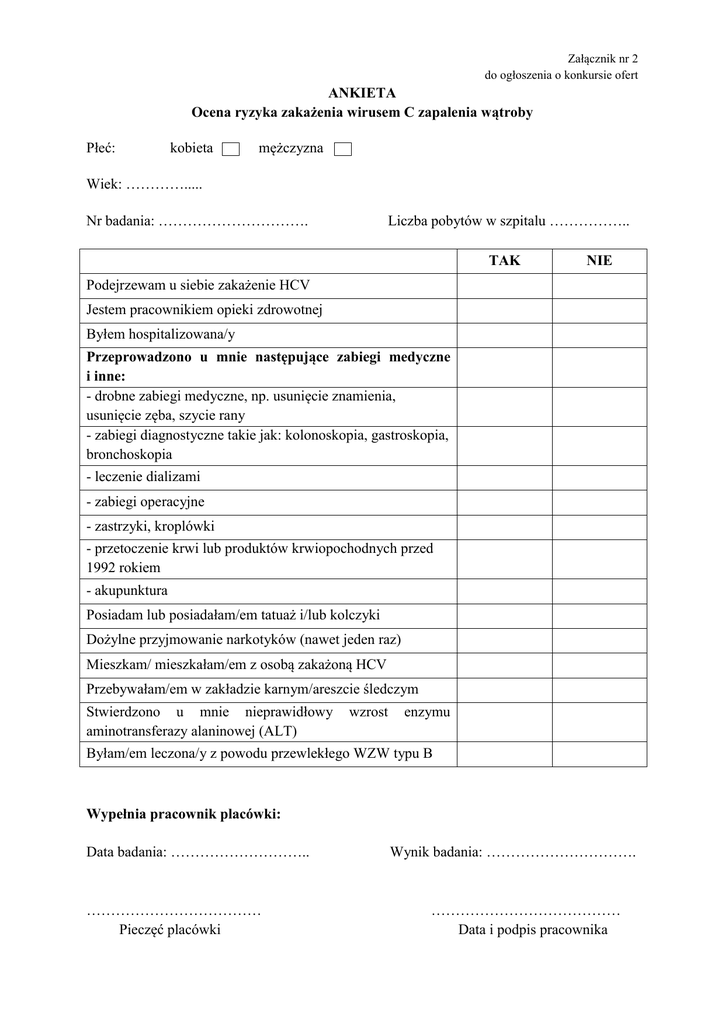 Załącznik nr 2 do ogłoszenia o konkursie ofert ANKIETA Ocena ryzyka zakażenia wirusem C zapalenia wątroby Płeć: kobieta mężczyzna Wiek: …………..... Nr badania: …………………………. Liczba pobytów w szpitalu …………….. TAK NIE Podejrzewam u siebie zakażenie HCV Jestem pracownikiem opieki zdrowotnej Byłem hospitalizowana/y Przeprowadzono u mnie następujące zabiegi medyczne i inne: - drobne zabiegi medyczne, np. usunięcie znamienia, usunięcie zęba, szycie rany - zabiegi diagnostyczne takie jak: kolonoskopia, gastroskopia, bronchoskopia - leczenie dializami - zabiegi operacyjne - zastrzyki, kroplówki - przetoczenie krwi lub produktów krwiopochodnych przed 1992 rokiem - akupunktura Posiadam lub posiadałam/em tatuaż i/lub kolczyki Dożylne przyjmowanie narkotyków (nawet jeden raz) Mieszkam/ mieszkałam/em z osobą zakażoną HCV Przebywałam/em w zakładzie karnym/areszcie śledczym Stwierdzono u mnie nieprawidłowy aminotransferazy alaninowej (ALT) wzrost enzymu Byłam/em leczona/y z powodu przewlekłego WZW typu B Wypełnia pracownik placówki: Data badania: ……………………….. ……………………………… Pieczęć placówki Wynik badania: …………………………. ………………………………… Data i podpis pracownika