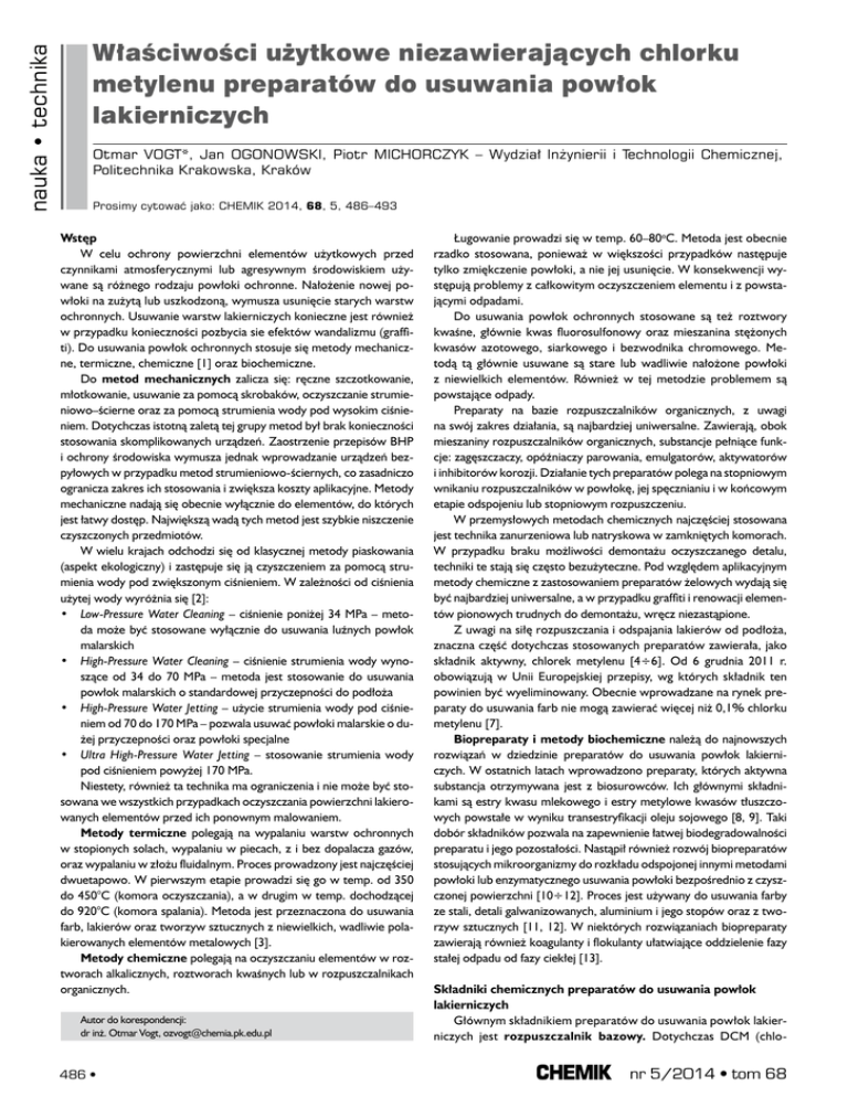 nauka • technika Właściwości użytkowe niezawierających chlorku metylenu preparatów do usuwania powłok lakierniczych Otmar Vogt*, Jan Ogonowski, Piotr Michorczyk – Wydział Inżynierii i Technologii Chemicznej, Politechnika Krakowska, Kraków Prosimy cytować jako: CHEMIK 2014, 68, 5, 486–493 Wstęp W celu ochrony powierzchni elementów użytkowych przed czynnikami atmosferycznymi lub agresywnym środowiskiem używane są różnego rodzaju powłoki ochronne. Nałożenie nowej powłoki na zużytą lub uszkodzoną, wymusza usunięcie starych warstw ochronnych. Usuwanie warstw lakierniczych konieczne jest również w przypadku konieczności pozbycia sie efektów wandalizmu (graffiti). Do usuwania powłok ochronnych stosuje się metody mechaniczne, termiczne, chemiczne [1] oraz biochemiczne. Do metod mechanicznych zalicza się: ręczne szczotkowanie, młotkowanie, usuwanie za pomocą skrobaków, oczyszczanie strumieniowo–ścierne oraz za pomocą strumienia wody pod wysokim ciśnieniem. Dotychczas istotną zaletą tej grupy metod był brak konieczności stosowania skomplikowanych urządzeń. Zaostrzenie przepisów BHP i ochrony środowiska wymusza jednak wprowadzanie urządzeń bezpyłowych w przypadku metod strumieniowo-ściernych, co zasadniczo ogranicza zakres ich stosowania i zwiększa koszty aplikacyjne. Metody mechaniczne nadają się obecnie wyłącznie do elementów, do których jest łatwy dostęp. Największą wadą tych metod jest szybkie niszczenie czyszczonych przedmiotów. W wielu krajach odchodzi się od klasycznej metody piaskowania (aspekt ekologiczny) i zastępuje się ją czyszczeniem za pomocą strumienia wody pod zwiększonym ciśnieniem. W zależności od ciśnienia użytej wody wyróżnia się [2]: • Low-Pressure Water Cleaning – ciśnienie poniżej 34 MPa – metoda może być stosowane wyłącznie do usuwania luźnych powłok malarskich • High-Pressure Water Cleaning – ciśnienie strumienia wody wynoszące od 34 do 70 MPa – metoda jest stosowanie do usuwania powłok malarskich o standardowej przyczepności do podłoża • High-Pressure Water Jetting – użycie strumienia wody pod ciśnieniem od 70 do 170 MPa – pozwala usuwać powłoki malarskie o dużej przyczepności oraz powłoki specjalne • Ultra High-Pressure Water Jetting – stosowanie strumienia wody pod ciśnieniem powyżej 170 MPa. Niestety, również ta technika ma ograniczenia i nie może być stosowana we wszystkich przypadkach oczyszczania powierzchni lakierowanych elementów przed ich ponownym malowaniem. Metody termiczne polegają na wypalaniu warstw ochronnych w stopionych solach, wypalaniu w piecach, z i bez dopalacza gazów, oraz wypalaniu w złożu fluidalnym. Proces prowadzony jest najczęściej dwuetapowo. W pierwszym etapie prowadzi się go w temp. od 350 do 450°C (komora oczyszczania), a w drugim w temp. dochodzącej do 920°C (komora spalania). Metoda jest przeznaczona do usuwania farb, lakierów oraz tworzyw sztucznych z niewielkich, wadliwie polakierowanych elementów metalowych [3]. Metody chemiczne polegają na oczyszczaniu elementów w roztworach alkalicznych, roztworach kwaśnych lub w rozpuszczalnikach organicznych. Autor do korespondencji: dr inż. Otmar Vogt, [email protected] 486 • Ługowanie prowadzi się w temp. 60–80oC. Metoda jest obecnie rzadko stosowana, ponieważ w większości przypadków następuje tylko zmiękczenie powłoki, a nie jej usunięcie. W konsekwencji występują problemy z całkowitym oczyszczeniem elementu i z powstającymi odpadami. Do usuwania powłok ochronnych stosowane są też roztwory kwaśne, głównie kwas fluorosulfonowy oraz mieszanina stężonych kwasów azotowego, siarkowego i bezwodnika chromowego. Metodą tą głównie usuwane są stare lub wadliwie nałożone powłoki z niewielkich elementów. Również w tej metodzie problemem są powstające odpady. Preparaty na bazie rozpuszczalników organicznych, z uwagi na swój zakres działania, są najbardziej uniwersalne. Zawierają, obok mieszaniny rozpuszczalników organicznych, substancje pełniące funkcje: zagęszczaczy, opóźniaczy parowania, emulgatorów, aktywatorów i inhibitorów korozji. Działanie tych preparatów polega na stopniowym wnikaniu rozpuszczalników w powłokę, jej spęcznianiu i w końcowym etapie odspojeniu lub stopniowym rozpuszczeniu. W przemysłowych metodach chemicznych najczęściej stosowana jest technika zanurzeniowa lub natryskowa w zamkniętych komorach. W przypadku braku możliwości demontażu oczyszczanego detalu, techniki te stają się często bezużyteczne. Pod względem aplikacyjnym metody chemiczne z zastosowaniem preparatów żelowych wydają się być najbardziej uniwersalne, a w przypadku graffiti i renowacji elementów pionowych trudnych do demontażu, wręcz niezastąpione. Z uwagi na siłę rozpuszczania i odspajania lakierów od podłoża, znaczna część dotychczas stosowanych preparatów zawierała, jako składnik aktywny, chlorek metylenu [4÷6]. Od 6 grudnia 2011 r. obowiązują w Unii Europejskiej przepisy, wg których składnik ten powinien być wyeliminowany. Obecnie wprowadzane na rynek preparaty do usuwania farb nie mogą zawierać więcej niż 0,1% chlorku metylenu [7]. Biopreparaty i metody biochemiczne należą do najnowszych rozwiązań w dziedzinie preparatów do usuwania powłok lakierniczych. W ostatnich latach wprowadzono preparaty, których aktywna substancja otrzymywana jest z biosurowców. Ich głównymi składnikami są estry kwasu mlekowego i estry metylowe kwasów tłuszczowych powstałe w wyniku transestryfikacji oleju sojowego [8, 9]. Taki dobór składników pozwala na zapewnienie łatwej biodegradowalności preparatu i jego pozostałości. Nastąpił również rozwój biopreparatów stosujących mikroorganizmy do rozkładu odspojonej innymi metodami powłoki lub enzymatycznego usuwania powłoki bezpośrednio z czyszczonej powierzchni [10÷12]. Proces jest używany do usuwania farby ze stali