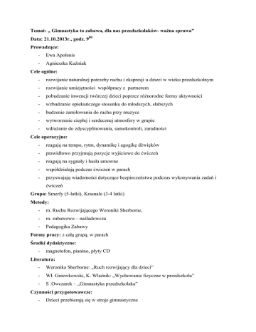 Temat: „ Gimnastyka to zabawa, dla nas przedszkolaków- ważna sprawa” Data: 21.10.2013r., godz. 900 Prowadzące: - Ewa Apołenis - Agnieszka Kuźniak Cele ogólne: - rozwijanie naturalnej potrzeby ruchu i ekspresji u dzieci w wieku przedszkolnym - rozwijanie umiejętności współpracy z partnerem - pobudzanie inwencji twórczej dzieci poprzez różnorodne formy aktywności - wzbudzanie opiekuńczego stosunku do młodszych, słabszych - budzenie zamiłowania do ruchu przy muzyce - wytworzenie ciepłej i serdecznej atmosfery w grupie - wdrażanie do zdyscyplinowania, samokontroli, zaradności Cele operacyjne: - reagują na tempo, rytm, dynamikę i agogikę dźwięków - prawidłowo przyjmują pozycje wyjściowe do ćwiczeń - reagują na sygnały i hasła umowne - współdziałają podczas ćwiczeń w parach - przyswajają wiadomości dotyczące bezpieczeństwa podczas wykonywania zadań i ćwiczeń Grupa: Smerfy (5-latki), Krasnale (3-4 latki) Metody: - m. Ruchu Rozwijającego Weroniki Sherborne, - m. zabawowo – naśladowcza - Pedagogika Zabawy Formy pracy: z całą grupą, w parach Środki dydaktyczne: - magnetofon, pianino, płyty CD Literatura: - Weronika Sherborne: „Ruch rozwijający dla dzieci” - Wł. Gniewkowski, K. Wlaźnik: „Wychowanie fizyczne w przedszkolu” - S .Owczarek – „Gimnastyka przedszkolaka” Czynności przygotowawcze: - Dzieci przebierają się w stroje gimnastyczne Czynności organizujące: - Dzieci wraz z nauczycielkami zbierają się w sali gimnastycznej - Przywitanie się Smerfów i Krasnali piosenką "Wszyscy są, witam Was, na zabawę przyszedł czas, jestem ja, jesteś Ty, raz, dwa, trzy" Dzieci witają się klaszcząc dłońmi o swoje ręce w parach, zabawę powtarzamy kilka razy. Czynności zasadnicze: L.p. 1. Rodzaj ćwiczenia i zabawy Zabawa integracyjna Zabawa orientacyjnoporządkowa Tytuł Opis „Ludzie do ludzi” Pary (starszak- maluch), prowadząca kieruje zabawą mówiąc: nos do nosa, plecy do pleców, ręka do ręki, ucho do ucha, kolano do kolana stopa do stopy; kiedy powie „ludzie do ludzi” każdy zmienia partnera. „Deszczyk” Pary stoją w rozsypce, Jedno dziecko z pary jest drzewem- stoi w pozycji skorygowanej, ręce w skrzydełka. Na hasło: słońce świeci- dzieci nie będące „drzewami” biegają na palcach po całej sali. Na hasło: pada deszcz- każde dziecko biegnie do swojego „drzewa” i staje plecami przy plecach kolegi w pozycji skorygowanej. Zmiana ról. 2. „Marsz” Koło. Rytmiczny marsz jednorzędem, zmiany prędkości marszu; Marsz na palcach, piętach, na lewej i prawej krawędzi stopy na zmianę. Zmiana kierunku. 3. 4. Ćw. porządkowe „Tańczące nutki” Koło. Rytmiczne uderzanie o podłogę, uda, klaskanie w dłonie, falowanie, wymachiwanie rękami z uwzględnieniem podanej dynamiki. Ćw. dużych grup mięśniowych „Puste kosze, pełne kosze” Przysiad podparty, na zapowiedź nauczyciela puste kosze dzieci prostują się, rozkładają ręce w bok; na zapowiedź „pełne kosze” wykonują powtórnie przysiad podparty. Powtórzyć 3x. „Toczący się pień” Rozsypka. Dzieci leżą na podłodze z wyprostowanymi i złączonymi nogami i rękoma ułożonymi na podłodze przy głowie. Wykonują trzy obroty w jedną stronę, a następnie 3 obroty w drugą stronę. „Wiatr i drzewa” Rozsypka. Dzieci wyobrażają sobie, że są drzewem, którego gałęzie poruszają się na wietrze. Naśladują szum wiatru. W tym samym czasie nauczyciel wygrywa na pianinie dźwięki. Zgodnie z ich natężeniem dziecko „szumi" raz głośniej, raz ciszej i kołysze się mocniej lub słabiej na boki. Gdy instrument cichnie, milkną i stają w bezruchu. 5. Zabawa relaksacyjna 6. Zabawa o wielostronnym ruchu (podskoki naprzemienne, zwarto – rozkroczne, obunóż, bieg, czworakowanie, pełzanie ) „Wijąca nić ” „Zepsute zabawki” Koło. Dzieci przy swobodnej improwizacji ruchowej przekazują sobie z rąk do rąk wijącą się nić w rytm usłyszanej muzyki. Rozsypka. Przy dźwiękach akompaniamentu dzieci naśladują zabawki: pajace, piłki, samochody, szybowce, roboty, baletnice. Na przerwę w muzyce stoją w bezruchu. „Niedźwiedzie Rozsypka. Melodia w niskich rejestrach – po sali i misie” czworakują niedźwiedzie, melodia w wysokich rejestrach – misie leżą na plecach wymachując nogami a rękami wykonują młynek. 7. Zabawa bieżna „Zaprzęgi” Pary. Dzieci dobierają się parami i tworzą zaprzęgi. Przy muzyce przemieszczają się po sali w ustalonym kierunku. Na sygnał nauczyciela dzieci zamieniają się miejscami. 8. Ćw. mięśni grzbietu, pełzanie, czołganie się lub czworakowanie „Mostek” Pary. Jedno dziecko wykonuje mostek wg własnej inwencji, drugie przechodzi pod mostkiem. Zmiana ról. 9. Zabawa uspokajająca „Korale jarzębiny ” Rozsypka. Dzieci – korale leżą nieruchomo. Pani jesień przy piosence „Jarzębinowa piosenka” spaceruje między leżącymi koralikami jarzębiny. Dziecko dotknięte dołącza do Pani jesieni i tak zostają nawleczone wszystkie korale. Zabawa kończy się gdy wszystkie dzieci utworzą jeden sznur korali. Na zakończenie wspólny taniec „w nitce” do muzyki. 10. Zabawa na zakończenie zajęć „Pożegnanie” Dzieci biegają po sali w rytm muzyki, na umówiony dźwięk zatrzymują się przed wybranym dzieckiem składając mu ukłony według własnych pomysłów i mówiąc dziękuję.