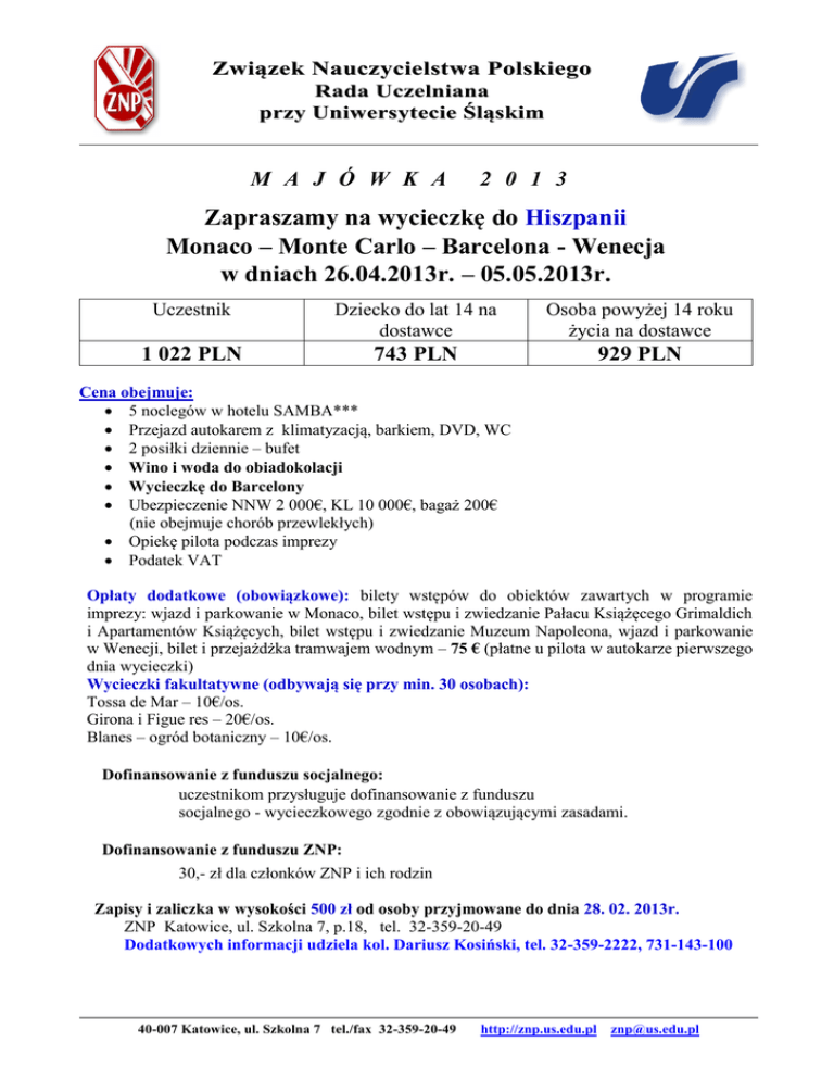 Z w i ą z e k N a uc z y c i e l st w a P o l s k i e g o R a d a U cz e l n i a n a p r z y U n i w e rs yt ec i e Ś l ąs k i m M A J Ó W K A 2 0 1 3 Zapraszamy na wycieczkę do Hiszpanii Monaco – Monte Carlo – Barcelona - Wenecja w dniach 26.04.2013r. – 05.05.2013r. Uczestnik Dziecko do lat 14 na dostawce Osoba powyżej 14 roku życia na dostawce 1 022 PLN 743 PLN 929 PLN Cena obejmuje: 5 noclegów w hotelu SAMBA*** Przejazd autokarem z klimatyzacją, barkiem, DVD, WC 2 posiłki dziennie – bufet Wino i woda do obiadokolacji Wycieczkę do Barcelony Ubezpieczenie NNW 2 000€, KL 10 000€, bagaż 200€ (nie obejmuje chorób przewlekłych) Opiekę pilota podczas imprezy Podatek VAT Opłaty dodatkowe (obowiązkowe): bilety wstępów do obiektów zawartych w programie imprezy: wjazd i parkowanie w Monaco, bilet wstępu i zwiedzanie Pałacu Książęcego Grimaldich i Apartamentów Książęcych, bilet wstępu i zwiedzanie Muzeum Napoleona, wjazd i parkowanie w Wenecji, bilet i przejażdżka tramwajem wodnym – 75 € (płatne u pilota w autokarze pierwszego dnia wycieczki) Wycieczki fakultatywne (odbywają się przy min. 30 osobach): Tossa de Mar – 10€/os. Girona i Figue res – 20€/os. Blanes – ogród botaniczny – 10€/os. Dofinansowanie z funduszu socjalnego: uczestnikom przysługuje dofinansowanie z funduszu socjalnego - wycieczkowego zgodnie z obowiązującymi zasadami. Dofinansowanie z funduszu ZNP: 30,- zł dla członków ZNP i ich rodzin Zapisy i zaliczka w wysokości 500 zł od osoby przyjmowane do dnia 28. 02. 2013r. ZNP Katowice, ul. Szkolna 7, p.18, tel. 32-359-20-49 Dodatkowych informacji udziela kol. Dariusz Kosiński, tel. 32-359-2222, 731-143-100 40-007 Katowice, ul. Szkolna 7 tel./fax 32-359-20-49 http://znp.us.edu.pl [email protected] Z w i ą z e k N a uc z y c i e l st w a P o l s k i e g o R a d a U cz e l n i a n a p r z y U n i w e rs yt ec i e Ś l ąs k i m RAMOWY PROGRAM IMPREZY: 1 dzień - wyjazd z Polski, przejazd przez Czechy, Austrię, Włochy, Francję. 2 dzień - Przyjazd do Monaco i Monte Carlo - zwiedzanie portu jachtowego, Pałacu Książęcego Grimaldich, kasyna (wymagany odpowiedni strój – długie spodnie), czas wolny. W godzinach wieczornych dalszy przejazd do Hiszpanii. 3 - 8 dzień – pobyt w hotelu Samba*** urozmaicony plażowaniem, wycieczka do Barcelony zwiedzanie z przewodnikiem (wejście na FC Barcelona dodatkowo płatne – 25€/os.). Możliwość korzystania z wycieczek fakultatywnych. Wyjazd z Hiszpanii w godzinach wieczornych, przejazd przez Francję i Włochy. 9 dzień - przyjazd do Wenecji. Zwiedzanie miasta z pilotem - m.in. przejazd tramwajem wodnym, plac i Bazylika św. Marka, Pałacu Dożów, czas wolny. W godzinach wieczornych wyjazd w kierunku Polski. 10 dzień - przyjazd do Polski w godzinach dopołudniowych. ZAKWATEROWANIE: HOTEL SAMBA *** POŁOŻENIE: do centrum sportowego ok. 150m. Do plaży w Fenals ok. 250m. Do centrum Lloret ok. 500m. ok. 80km od Barcelony. W pobliżu inne hotele, sklepy, bary, restauracje. USŁUGI HOTELOWE: klimatyzowana jadalnia dla niepalących, pomieszczenia klubowe, bar, przytulny angielski pub, sala konferencyjna, sala gier, windy, sklepik ,taras z widokiem na Lloret. Duży kompleks ogrodowy z ładnym trawnikiem, leżaki do opalania. Leżaki i parasole przy basenie bezpłatne. POKOJE: 2 i 3 os., wyposażone standardowo, łazienka/WC/prysznic, telefon, klimatyzacja (w cenie), ogrzewanie, balkon. Codzienna wymiana ręczników i sprzątanie pokoi, wymiana pościeli co 4 dni. Zakwaterowanie w dniu przyjazdu od godz. 14.00, wykwaterowanie do godz. 10.00 w dniu wyjazdu. WYŻYWIENIE: HB - śniadanie 07:30 – 10:00, obiadokolacja 18:30 – 21:30 w formie bufetu, wino i woda do obiadokolacji. SPORT I ZABAWA: basen z brodzikiem, boisko do siatkówki, program animacyjny w basenie, kilka razy w tygodniu wieczorki taneczne, animacje w ciągu dnia i po obiadokolacji, bilard, gry zręcznościowe. PLAŻA: publiczna, piaszczysto-żwirkowa, położona 250m od hotelu, przejście promenadą. 40-007 Katowice, ul. Szkolna 7 tel./fax 32-359-20-49 http://znp.us.edu.pl [email protected] Z w i ą z e k N a uc z y c i e l st w a P o l s k i e g o R a d a U cz e l n i a n a p r z y U n i w e rs yt ec i e Ś l ąs k i m 40-007 Katowice, ul. Szkolna 7 tel./fax 32-359-20-49 http://znp.us.edu.pl [email protected]