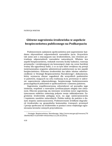 PATRYCJA WIKTOR Główne zagrożenia środowiska w aspekcie bezpieczeństwa publicznego na Podkarpaciu Podstawowym zadaniem społeczeństwa jest zapewnienie każdemu obywatelowi odpowiednich warunków życia. Oczywiście tak samo jest z otaczającym nas środowiskiem, ono również potrzebuje odpowiednich warunków naturalnych. Właśnie ten aspekt bezpieczeństwa, wskutek wzrostu liczby ludności, rozwoju przemysłu i zwiększającej się konsumpcji staje się coraz bardziej ważny dla egzystencji ludzi, a co za tym idzie zwiększa się presja instytucjonalna organów administracji państwowej na ten aspekt bezpieczeństwa. Ochrona środowiska ma także istotne odzwierciedlenie w Strategii Bezpieczeństwa Narodowego1, dokumencie, który wyznacza obszar zagadnień dla wszystkich podmiotów w państwie, mających na celu realizację m.in. prewencji w zakresie zapewnienia odpowiedniego, bezpiecznego funkcjonowania poszczególnych jednostek w społeczeństwie i samemu państwu. Zagrożenia współtowarzyszą człowiekowi od początku jego istnienia, wspólnie z rozwojem cywilizacyjnym ulegały one zmianom. Obecnie pojawiają się nieznane wcześniej nowe zagrożenia, tymczasem niektóre zmieniają jedynie swoje oddziaływanie. Zagrożenia środowiska polegają m.in. na jego zanieczyszczeniu i topnieniu zasobów naturalnych. Polska należy do państw o dużym stopniu zanieczyszczenia. Podstawowymi źródłami degradacji środowiska są: gospodarka komunalna, transport, przemysł i presja społeczna na środowisko w postaci coraz większego ograniczania terenów cennych przyrodniczo. Strategia Bezpieczeństwa Narodowego, http://www.msz.gov.pl/resource/7d 18e04d-8f23-4128-84b9-4f426346a112 (30.10.2014). 1 418 Główne zagrożenia środowiska w aspekcie bezpieczeństwa publicznego… Wspomniana presja polega także na: zanieczyszczeniu wód; zanieczyszczeniu powietrza atmosferycznego; zanieczyszczeniu odpadami; zanieczyszczeniu gleb; zagrożeniu promieniowaniem; niebezpieczeństwu dla środowiska nieożywionego; zagrożeniu hałasem szkodliwym dla człowieka; wibracjach w środowisku wywołanych drganiami mechanicznymi. Szczególne niebezpieczeństwo związane jest ze skażeniem wód, niezbędnych dla życia ludzi i zwierząt. Zanieczyszczenie to wywoływane jest przede wszystkim przez roztwory i zawiesiny, rozprowadzane w wodach na znaczne odległości2. Organami odpowiedzialnymi w państwie za bezpieczeństwo środowiska są m.in: Ministerstwo Środowiska; Główny Inspektorat Ochrony Środowiska; Narodowy Fundusz Ochrony Środowiska i Gospodarki Wodnej; Państwowa Rada Ochrony Przyrody; Państwowa Inspekcja Ochrony Środowiska; Komisja Ochrony Środowiska; Policja; Straż Miejska; Straż Graniczna; Straż Leśna; Agencja Bezpieczeństwa Wewnętrznego; Centralne Biuro Antykorupcyjne; Główny Konserwator Przyrody. E. Pyłka-Gutowska, Ekologia z ochroną środowiska, Warszawa 2004, s. 118–119. 2 419 Patrycja Wiktor Stan środowiska naturalnego w Polsce ciągle ulega zmianom. Organy administracji rządowej i jednostek samorządu terytorialnego, stosownie do swojej właściwości miejscowej, zapewniają warunki niezbędne do realizacji zasady zrównoważonego rozwoju oraz przestrzegania przepisów prawa ochrony środowiska3. Zadania w zakresie ochrony środowiska przypisane są niemal wszystkim organom administracji publicznej, zarówno rządowej, jak i samorządowej. Podstawowe prawa i obowiązki obywateli wobec środowiska określa Konstytucja Rzeczypospolitej Polskiej4 z dnia 2 kwietnia 1997 roku, która w art. 5 podnosi ochronę środowiska do rangi najważniejszych dla Rzeczypospolitej Polskiej spraw i stawia ją na równi z niepodległością, wolnością, prawami człowieka i obywatela oraz dziedzictwem kulturowym narodu, kierując się zasadą zrównoważonego rozwoju. Z kolei w art. 31 wskazuje na ochronę środowiska jako jedną z trzech własnych przyczyn, dla których konstytucyjna wolność obywateli może zostać ograniczona, czy też w art. 74, który nakłada obowiązek ochrony środowiska na władze publiczne. Ogólnie, Konstytucja, artykułem 86, zobowiązuje wszystkich do dbałości o stan środowiska i nakłada odpowiedzialność za spowodowanie jego pogorszenia. Także niezwykle ważnym aktem prawnym (jednym z kilkudziesięciu) w randze ustawy, jest Prawo Ochrony Środowiska5, które określa między innymi: warunki ochrony zasobów środowiska; warunki wprowadzania substancji lub energii do środowiska; koszty korzystania ze środowiska; zasady udostępniania informacji o środowisku i jego ochronie; 3 B. Bartkiewicz, Oczyszczanie ścieków przemysłowych, Warszawa 2006, s. 26–28. 4 Konstytucja RP z dnia 2 kwietnia 1997 r. (Dz. U. z 1997 r., nr 78, poz. 483), art. 5, 31, 74, 86. 5 Ustawa z dnia 27 kwietnia 2001 r., Prawo ochrony środowiska (Dz. U. z 2008 r., nr 25, poz. 150), art. 1–2. 420 Główne zagrożenia środowiska w aspekcie bezpieczeństwa publicznego… udział społeczeństwa w postępowaniu w sprawie ochrony środowiska; obowiązki organów administracji; odpowiedzialność i sankcje. W powyższym aspekcie problem bezpieczeństwa ludności w odniesieniu do środowiska naturalnego na Podkarpaciu ma szczególne znaczenie z uwagi na duży potencjał obszarów mających o szczególnej wartości przyrodniczej nie tylko dla Polski ale także dla Europy. Szczególne znaczenie mają tu krainy fizjograficzne, a mianowicie: Kotlina Sandomierska, Pogórze Karpackie oraz Bieszczady. Województwo podkarpacie jest w nie najgorszej kondycji ekologicznej, otóż 45% powierzchni są to regiony prawnie chronione: dwa parki narodowe: Magurski oraz Bieszczadzki, dziewięćdziesiąt cztery rezerwaty przyrody, dziesięć parków krajobrazowych, trzynaście obszarów chronionego krajobrazu, dwadzieścia osiem stanowisk dokumentacyjnych, trzysta sześćdziesiąt jeden użytków ekologicznych, dziewięć zespołów przyrodniczokrajobrazowych, tysiąc czterysta jedenaście pomnik