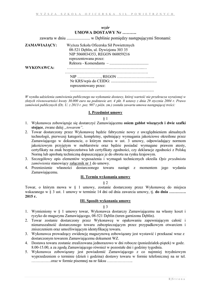 W Y Ż S Z A S Z K O Ł A O F I C E R S K A S I Ł P O W I E T R Z N Y C H wzór UMOWA DOSTAWY Nr ………. zawarta w dniu ...................... w Dęblinie pomiędzy następującymi Stronami: ZAMAWIAJĄCY: WYKONAWCA: Wyższa Szkoła Oficerska Sił Powietrznych 08-521 Dęblin, ul. Dywizjonu 303 35 NIP 5060034353, REGON 060059216 reprezentowana przez: Rektora - Komendanta – ........................................ …………………………………………………..… ………………………………………………………. NIP ………………, REGON …………………….…. Nr KRS/wpis do CEIDG: ............................................... reprezentowany przez: ...................................................................................... W wyniku udzielenia zamówienia publicznego na wykonanie dostawy, której wartość nie przekracza wyrażonej w złotych równowartości kwoty 30.000 euro na podstawie art. 4 pkt. 8 ustawy z dnia 29 stycznia 2004 r. Prawo zamówień publicznych (Dz. U. z 2013 r. poz. 907 z późn. zm.) została zawarta umowa następującej treści: I. Przedmiot umowy §1 1. Wykonawca zobowiązuje się dostarczyć Zamawiającemu osiem gablot wiszących i dwie szafki stojące, zwane dalej „towarem”. 2. Towar dostarczony przez Wykonawcę będzie fabrycznie nowy z uwzględnieniem aktualnych technologii, pierwszej kategorii, kompletny, spełniający wymagania jakościowe określone przez Zamawiającego w dokumencie, o którym mowa w ust. 3 umowy, odpowiadający normom jakościowym przyjętym w meblarstwie oraz będzie posiadać wymagane prawem atesty, certyfikaty na znak bezpieczeństwa lub certyfikaty zgodności, czy deklaracje zgodności z Polską Normą lub aprobatą techniczną dopuszczające je do obrotu na rynku krajowym. 3. Szczegółowy opis elementów wyposażenia i wymagań technicznych określa Opis przedmiotu zamówienia stanowiący załącznik nr 1 do umowy. 4. Przeniesienie własności dostarczonego towaru nastąpi z momentem jego wydania Zamawiającemu. II. Termin wykonania umowy §2 Towar, o którym mowa w § 1 umowy, zostanie dostarczony przez Wykonawcę do miejsca wskazanego w § 3 ust. 1 umowy w terminie 14 dni od dnia zawarcia umowy, tj. do dnia …………. 2015 r. III. Sposób wykonania umowy 1. 2. 3. 4. 5. §3 Wymieniony w § 1 umowy towar, Wykonawca dostarczy Zamawiającemu na własny koszt i ryzyko do magazynu Zamawiającego, 08-521 Dęblin (teren garnizonu Dęblin). Towar zostanie dostarczony przez Wykonawcę w opakowaniu zapewniającym całość i nienaruszalność dostarczonego towaru zabezpieczającym przez przypadkowym otwarciem i zniszczeniem oraz umożliwiającym identyfikację towaru. Wykonawca prowadzący ewidencję magazynową zobowiązany jest wystawić i przekazać wraz z dostarczonym towarem Zamawiającemu dokument WZ. Dostawa towaru zostanie zrealizowana jednorazowo w dni robocze (poniedziałek-piątek) w godz. 8.00-15.00, a za zgodą Zamawiającego również w pozostałe dni i godziny tygodnia. Wykonawca zobowiązany jest powiadomić Zamawiającego z co najmniej trzydniowym wyprzedzeniem o terminie (dzień i godzina) dostawy towaru w formie telefonicznej na nr tel. ……………oraz w formie pisemnej na nr faksu ……………….. 1|S t r o n a W Y Ż S Z A S Z K O Ł A O F I C E R S K A S I Ł P O W I E T R Z N Y C H 6. Wykonawca odpowiada za utratę lub uszkodzenie towaru powstałe w czasie jego transportu i ponosi z tego tytułu wszelkie skutki prawne, do chwili formalnego odbioru towaru przez Zamawiającego, tj. podpisania przez Zamawiającego protokołu odbioru towaru. 7. Wykonawca wyraża zgodę na poddanie podczas dostawy kierowcy i środka transportu rygorom procedur bezpieczeństwa obowiązującym u Zamawiającego zgodnie z obowiązującymi w tym zakresie przepisami prawa. §4 1. Towar podlega odbiorowi ilościowo - jakościowemu w dniu dostarczenia towaru w magazynie Zamawiającego przez magazyniera z udziałem Witolda SOKÓŁ. 2. Odbiór ilościowy polega na skontrolowaniu stanu opakowania dostarczonego towaru oraz umieszczonych na nim cech i znaków, porównaniu ilościowym dostawy ze specyfikacją przedmiotu dostawy określoną w umowie oraz dowodem WZ, przeliczeniu, zważeniu lub wymierzeniu przedmiotów dostawy. 3. Odbiór jakościowy polega na sprawdzeniu danych charakteryzujących przedmiot dostawy (wymiar, klasa, gatunek, kolor,) oraz na sprawdzeniu, czy dostarczony towar posiada wszystkie cechy określone w umowie. 4. Z czynności odbioru sporządzony zostanie stosowny protokół odbioru towaru podpisany przez osoby wymienione w ust. 1, który zawierać będzie w szczególności: 1) miejsce i data przekazania dostarczonego towaru, 2) specyfikacja dostawy (wyszczególnienie przedmiotu dostawy), 3) wykaz ujawnionych braków i wad (stwierdzone niezgodności, braki ilościowe oraz jakościowe towaru). 5. W przypadku stwierdzenia wad fizycznych towaru, w szczególności ustalenia, że towar jest niezgodny ze specyfikacją dostawy, jest niekompletny albo posiada ślady zewnętrznego uszkodzenia, Zamawiającemu przysługuje prawo do: a) odstąpienia od umowy w całości lub części, lub b) odmowy odbioru części lub całości zamówionego towaru. W przypadku, o którym mowa w pkt b) Zamawiający wyznaczy termin dostarczenia towaru wolnego od wad nie dłuższy niż 7 dni. Z czynności odbioru zamiennej partii towaru zostanie sporządzony nowy protokół odbioru. IV. Wynagrodzenie §5 1. Za wykonany przedmiot umowy, określony w § 1 umowy Zamawiający zapłaci Wykonawcy wynagrodzenie, zgodnie z formularzem cenowym (ofertowym) Wykonawcy, stanowiącym załącznik nr 2 do umowy, w łącznej wysokości: netto................................... zł (słownie:..............................................................) VAT ....................................zł. (słownie:..............................................................) brutto ..................................z