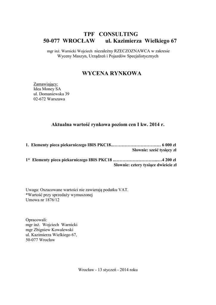 TPF CONSULTING 50-077 WROCŁAW ul. Kazimierza Wielkiego 67 mgr inż. Warnicki Wojciech niezależny RZECZOZNAWCA w zakresie Wyceny Maszyn, Urządzeń i Pojazdów Specjalistycznych WYCENA RYNKOWA Zamawiający: Idea Money SA ul. Domaniewska 39 02-672 Warszawa Aktualna wartość rynkowa poziom cen I kw. 2014 r. 1. Elementy pieca piekarniczego IBIS PKC18..…………………………… 6 000 zł Słownie: sześć tysięcy zł 1* Elementy pieca piekarniczego IBIS PKC18 ..………………………...…4 200 zł Słownie: cztery tysiące dwieście zł Uwaga: Oszacowane wartości nie zawierają podatku VAT. *Wartość przy sprzedaży wymuszonej Umowa nr 1876/12 Opracowali: mgr inż. Wojciech Warnicki mgr Zbigniew Kowalewski ul. Kazimierza Wielkiego 67, 50-077 Wrocław Wrocław - 13 styczeń - 2014 roku 1.0. DANE FORMALNE. 1.1. Podstawa opracowania. Podstawą opracowania wyceny jest formalne zamówienie firmy Idea Money SA; 02-672 Warszawa ul. Domaniewska 39, z dnia 09.01.2014 r. 1.2. Przedmiot wyceny. Przedmiotem wyceny są elementy pieca piekarniczego IBIS PKC18. Szczegółową charakterystykę w/w przedmiotów przedstawiono w punkcie 3.0. 1.3. Cel opracowania. Celem opracowania jest ocena stanu technicznego elementów pieca, określenie wartości rynkowej przy sprzedaży z przeniesieniem i wartości wymuszonej. 1.4. Wycenę tę opracowano z uwzględnieniem następujących przepisów: - Dziennik Ustaw Nr 7 z dnia 27.01.1975 r poz. 34 – Amortyzacja środków trwałych oraz wartości niematerialnych i prawnych, a także aktualizacja wyceny środków trwałych (z późniejszymi zmianami). - Monitor Polski Nr 9/95 poz. 125 - Wskaźniki przeliczeniowe do aktualizacji wyceny środków trwałych na dzień 1 stycznia 1975 r. - Dziennik Ustaw Nr 73 z dnia 28. 06. 1975 r. poz. 362 – Zmieniające rozporządzenie w sprawie amortyzacji środków trwałych oraz wartości niematerialnych i prawnych, a także aktualizacja wyceny środków trwałych. - Klasyfikacja Rodzajowa Środków Trwałych - Zeszyty Metodyczne - Zarządzenie Nr 51 Prezesa Głównego Urzędu Statystycznego z dnia 17.12.1971 r. - Rozporządzenie Ministra Finansów z dnia 17. 01. 1977 r. w sprawie amortyzacji środków trwałych oraz wartości niematerialnych i prawnych, a także aktualizacja wyceny środków trwałych - Dziennik Ustaw Nr 6/97. - Rozporządzenie Rady Ministrów z dnia 30 grudnia 1979 r. w sprawie Klasyfikacji Środków Trwałych Dz. U. z 1979 r. Nr 112, poz. 1317. - Słownik terminologiczny wyceny wartości maszyn i urządzeń – T. Klimek. - Ustawa prawo bankowe z dnia 29.08.1978. Dz. U. nr 140, poz. 939 ze zm. - Ustawa o rachunkowości z dnia 29.09.1974 Dz. U. nr 121, poz. 591. - Rozporządzenie Rady Ministrów z dnia 21.09.2004 w sprawie wyceny nieruchomości i sporządzania operatu szacunkowego (Dz. U. z 2004 nr 207, poz. 2109). - Ustawa z dnia 23.04.1964 r. Kodeks Cywilny, wraz z późniejszymi zmianami (Dz.U.1964 r. nr 16, poz.93), art. 44-46, art.145 ustawy. - Standardy zawodowe rzeczoznawców majątkowych - Standard VI - Wycena maszyn i urządzeń. PFSRM Warszawa 2004. - Rynek maszyn, baza danych – H. Butcher. - Cennik Maszyn i Urządzeń – WACETOB - Leksykon naukowo techniczny –PWN - Katalogi i cenniki branżowe. - Standardy zawodowe rzeczoznawców majątkowych. - Baza danych autorów operatu szacunkowego. 2.0. DANE UZUPEŁNIAJĄCE. 2.1. W dniu 09.01.2014 r. dokonano oględzin oraz opisu elementów pieca piekarniczego w magazynie wskazanym przez Idea Money SA we Wrocławiu ul. Krzywoustego 74. 2.2. Ze strony przechowującego wyjaśnień i pomocy podczas identyfikacji przedmiotu udzielał pan Mateusz Ołdak. 2.3. Zamawiający wyjaśnił, że w/w wycena potrzebna jest do ustalenia wartości rynkowej przedmiotów przy sprzedaży zwykłej - po przeniesieniu i wymuszonej. 2.4. Zawarta w operacie ocena stanu technicznego elementów pieca piekarniczego, nie jest ekspertyzą techniczną, a służy jedynie celom wyceny. Powyższa wycena wartości nie może być też traktowana jako gwarancja ewentualnej sprzedaży przedmiotu wyceny. 2.5. Wycena powyższa nie może być przedstawiona w całości lub części w jakimkolwiek dokumencie bez zgody rzeczoznawcy i bez uzgodnienia z nim formy i treści takiej publikacji. Ponadto nie można jej wykorzystać do żadnego innego celu aniżeli określonego powyżej. 3.0. PRZEDMIOT WYCENY. 3.1. Elementy pieca piekarniczego IBIS PKC18 Brak instrukcji obsługi i deklaracji zgodności oraz tabliczki znamionowej. 3.1.1. Charakterystyka techniczna - Producent/Dystrybutor - IBIS - Kraj pochodzenia - Polska - Numer seryjny - brak tabliczki - Rok produkcji - brak tabliczki - Model - PKC18 - Typ - 6A213 - Ilość komór wypiekowych - 4 szt. - Powierzchnia wypieku - 18 m2 - Wymiary komór wypiekowych - 1800 x 2500 mm - Zapotrzebowanie mocy termicznej - 180 (155 000) kw (kcal/h) - Zapotrzebowanie mocy elektr. – 5,5 kW - Masa - wg producenta około 5 000 kg - Gabaryty pieca zmontowanego - 3810 x 3500 x 2680 mm Fot. nr 1. Elementy pieca piekarniczego IBIS PKC18 Fot. nr 2. Elementy pieca piekarniczego IBIS PKC18 Fot. nr 3. Elementy pieca piekarniczego IBIS PKC18 Fot. nr 4. Widok poglądowy zmontowanego pieca piekarniczego IBIS PKC18 (z katalogu) 3.1.2. Przeznaczenie i opis. Piec piekarniczy 4 komorowy – gazowy, cyklotermiczny, produkcji IBIS model PKC18 to urządzenie do wypieku chleba, bułek i rogali. Wypiek odbywał się na czterech płytach wypiekowych lub na blachach piekarskich. Załadunek pieca ręczny lub przy użyciu wózków załadowczych z aparatami wrzutowymi. Panel sterujący montowany z przodu pieca. Przedmiotowe urządzenie rozmontowane na drobne elementy i złożone na zadaszonym placu składowym. W tym stanie brak możliwości potwierdzenia sprawności i kompletności. Brak specyfikacji i dokumentacji, brak tabliczki znamionowej. Widoczne ślady wieloletniego użytkowania, liczne mocne uszkodzenia mechaniczne, rozległe ślady korozji, zniszczona izolacja pieca i ins