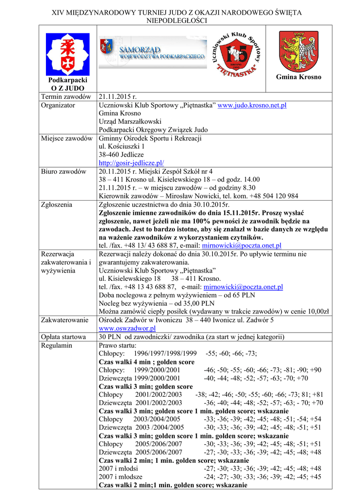 XIV MIĘDZYNARODOWY TURNIEJ JUDO Z OKAZJI NARODOWEGO ŚWIĘTA NIEPODLEGŁOŚCI Podkarpacki O Z JUDO Termin zawodów Organizator Gmina Krosno 21.11.2015 r. Uczniowski Klub Sportowy „Piętnastka” www.judo.krosno.net.pl Gmina Krosno Urząd Marszałkowski Podkarpacki Okręgowy Związek Judo Miejsce zawodów Gminny Ośrodek Sportu i Rekreacji ul. Kościuszki 1 38-460 Jedlicze http://gosir-jedlicze.pl/ Biuro zawodów 20.11.2015 r. Miejski Zespół Szkół nr 4 38 – 411 Krosno ul. Kisielewskiego 18 – od godz. 14.00 21.11.2015 r. – w miejscu zawodów – od godziny 8.30 Kierownik zawodów – Mirosław Nowicki, tel. kom. +48 504 120 984 Zgłoszenia Zgłoszenie uczestnictwa do dnia 30.10.2015r. Zgłoszenie imienne zawodników do dnia 15.11.2015r. Proszę wysłać zgłoszenie, nawet jeżeli nie ma 100% pewności że zawodnik będzie na zawodach. Jest to bardzo istotne, aby się znalazł w bazie danych ze względu na ważenie zawodników z wykorzystaniem czytników. tel. /fax. +48 13/ 43 688 87, e-mail: [email protected] Rezerwacja Rezerwacji należy dokonać do dnia 30.10.2015r. Po upływie terminu nie zakwaterowania i gwarantujemy zakwaterowania. wyżywienia Uczniowski Klub Sportowy „Piętnastka” ul. Kisielewskiego 18 38 – 411 Krosno. tel. /fax. +48 13 43 688 87, e-mail: [email protected] Doba noclegowa z pełnym wyżywieniem – od 65 PLN Nocleg bez wyżywienia – od 35,00 PLN Można zamówić ciepły posiłek (wydawany w trakcie zawodów) w cenie 10,00zł Zakwaterowanie Ośrodek Zadwór w Iwoniczu 38 – 440 Iwonicz ul. Zadwór 5 www.oswzadwor.pl Opłata startowa 30 PLN od zawodniczki/ zawodnika (za start w jednej kategorii) Regulamin Prawo startu: Chłopcy: 1996/1997/1998/1999 -55; -60; -66; -73; Czas walki 4 min ; golden score Chłopcy: 1999/2000/2001 -46; -50; -55; -60; -66; -73; -81; -90; +90 Dziewczęta 1999/2000/2001 -40; -44; -48; -52; -57; -63; -70; +70 Czas walki 3 min; golden score Chłopcy 2001/2002/2003 -38; -42; -46; -50; -55; -60; -66; -73; 81; +81 Dziewczęta 2001/2002/2003 -36; -40; -44; -48; -52; -57; -63; - 70; +70 Czas walki 3 min; golden score 1 min. golden score; wskazanie Chłopcy 2003/2004/2005 -33; -36; -39; -42; -45; -48; -51; -54; +54 Dziewczęta 2003 /2004/2005 -30; -33; -36; -39; -42; -45; -48; -51; +51 Czas walki 3 min; golden score 1 min. golden score; wskazanie Chłopcy 2005/2006/2007 -30; -33; -36; -39; -42; -45; -48; -51; +51 Dziewczęta 2005/2006/2007 -27; -30; -33; -36; -39; -42; -45; -48; +48 Czas walki 2 min; 1 min. golden score; wskazanie 2007 i młodsi -27; -30; -33; -36; -39; -42; -45; -48; +48 2007 i młodsze -24; -27; -30; -33; -36; -39; -42; -45; +45 Czas walki 2 min;1 min. golden score; wskazanie Program zawodów Uwagi Dziewczęta i chłopcy ur. w latach 2005 i młodsi mogą startować za pisemną zgodą rodziców lub trenerów. Piątek 20.11.2015r. 1. 14.00 – 20.00 - przyjazd ekip sportowych, weryfikacja, 2. 20,00 – 21,00 waga oficjalna dla korzystających z zakwaterowania Sobota 21.11.2015 r. 1. 8,00 – 9,00 – weryfikacja i waga oficjalna dla ekip przyjeżdżających w dniu zawodów 2. 9.00 – 10,00 – weryfikacja ostateczna i losowanie 3. 10,00 – rozpoczęcie walk od najmłodszych kategorii wiekowych 4. 12,00 oficjalne rozpoczęcie turnieju 5. 12,30 – walki aż do zakończenia (wręczanie medali i dyplomów po zakończeniu walk w danej kategorii) Niedziela 22.11.2015r. Wyjazd ekip zagranicznych po śniadaniu 1. Wszyscy uczestnicy zawodów winni być ubezpieczeni przez klub lub właściwe stowarzyszenie wojewódzkie od następstw NW. Organizator nie ponosi odpowiedzialności za powstałe wypadki. 2. Za badania lekarskie odpowiada kierownik/trener ekipy 3. Turniej będzie rozgrywany na sześciu matach. 4. Dyplomy i medale za miejsca I – III. 5. Dla wszystkich uczestników przewidziany jest suchy prowiant w trakcie turnieju. 6. Bardzo prosimy aby ekipy przewidziały w swoim składzie sędziego. Sędziów obowiązuje strój sędziowski. TURNIEJ ZORGANIZOWANO PRZY WSPARCIU FINANSOWYM GMINY KROSNO, URZĘDU MARSZAŁKOWSKIEGO I PODKARPACKIEGO OKRĘGOWEGO ZWIĄZKU JUDO Zaproszone ekipy: Rumunia Ukraina Słowacja Czechy Węgry Serbia Kluby zrzeszone w Polskim Związku Judo Prezes Klubu Wojciech Kasza