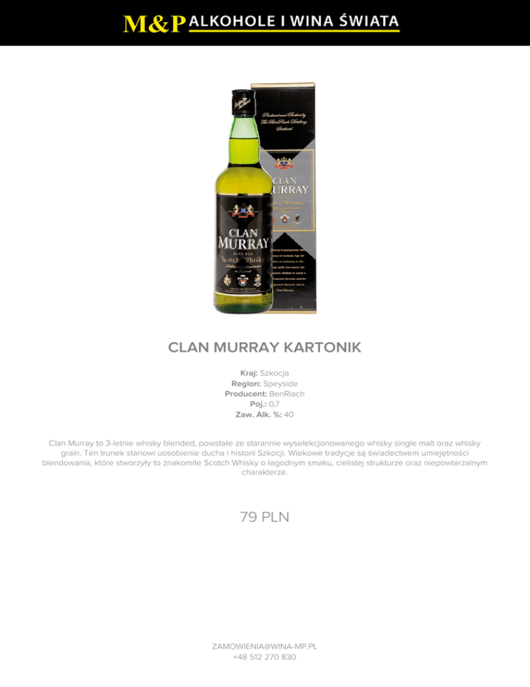 CLAN MURRAY KARTONIK Kraj: Szkocja Region: Speyside Producent: BenRiach Poj.: 0,7 Zaw. Alk. %: 40 Clan Murray to 3-letnie whisky blended, powstałe ze starannie wyselekcjonowanego whisky single malt oraz whisky grain. Ten trunek stanowi uosobienie ducha i historii Szkocji. Wiekowe tradycje są świadectwem umiejętności blendowania, które stworzyły to znakomite Scotch Whisky o łagodnym smaku, cielistej strukturze oraz niepowtarzalnym charakterze. 79 PLN [email protected] +48 512 270 830