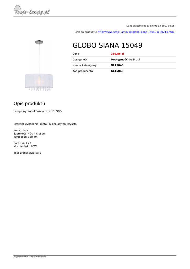 Dane aktualne na dzień: 03-03-2017 00:06 Link do produktu: http://www.twoje-lampy.pl/globo-siana-15049-p-30214.html GLOBO SIANA 15049 Cena 219,86 zł Dostępność Dostępność do 5 dni Numer katalogowy GL15049 Kod producenta GL15049 Opis produktu Lampa wyprodukowana przez GLOBO. Materiał wykonania: metal, nikiel, szyfon, kryształ Kolor: biały Szerokość: 40cm x 18cm Wysokość: 150 cm Żarówka: E27 Moc żarówki: 60W Ilość źródeł światła: 1 wygenerowano w programie shopGold Powered by TCPDF (www.tcpdf.org)