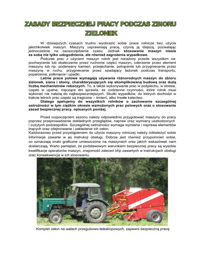 W dzisiejszych czasach trudno wyobrazić sobie prace rolnicze bez użycia jakichkolwiek maszyn. Maszyny usprawniają pracę, czynią ją lżejszą, pozwalając jednocześnie na zaoszczędzenie czasu. Jednak stosowanie maszyn niesie za sobą nie tylko udogodnienia, ale również zagrożenia wypadkowe. Podczas prac z użyciem maszyn rolnik jest narażony przede wszystkim na: pochwycenie lub skaleczenie przez ruchome części maszyn, uderzenie przez element maszyny lub np. poderwany kamień, przejechanie, potrącenie lub przygniecenie przez maszynę w ruchu, przygniecenie przez spadający ładunek podczas transportu, poparzenia, potknięcia i upadki. Letnie prace polowe wymagają używania różnorodnych maszyn do zbioru zielonek, siana i słomy, charakteryzujących się skomplikowaną budową oraz dużą liczbą mechanizmów roboczych. To, a także wykonywanie prac w pośpiechu, w stresie, często w upalne, męczące dni sprawia, że codzienne czynności, które rolnik musi wykonać nie należą do najbezpieczniejszych. Skutki wypadków, do których dochodzi w trakcie letnich prac często są tragiczne – śmierć, albo trwałe kalectwo. Dlatego apelujemy do wszystkich rolników o zachowanie szczególnej ostrożności w tym ciężkim okresie wzmożonych prac polowych oraz o stosowanie zasad bezpiecznej pracy, opisanych poniżej. Przed rozpoczęciem sezonu należy odpowiednio przygotować maszyny do pracy poprzez przeprowadzenie dokładnych przeglądów, napraw oraz wymiany uszkodzonych i zużytych podzespołów. Szczególnej ostrożności wymaga wymiana i naprawa elementów tnących oraz zdejmowanie i zakładanie ich osłon. Każdorazowo przed przystąpieniem do użycia maszyny rolniczej należy odświeżyć sobie informacje zawarte w jej instrukcji obsługi. Dobrze jest również przypomnieć sobie, co oznaczają znaki graficzne umieszczone na maszynach oraz jakich wskazówek nam dostarczają. Warto pamiętać, że podstawowym warunkiem bezpiecznej pracy są wysokie kwalifikacje operatorów maszyn, znajomość zaleceń bhp zawartych w instrukcjach obsługi oraz konsekwencja w ich stosowaniu. Komplet osłon na wałach przegubowo-teleskopowych, zapewni bezpieczną pracę OGÓLNE ZASADY BEZPIECZNEJ PRACY: każdej maszyny rolniczej należy używać zgodnie z jej przeznaczeniem; do pracy z wykorzystaniem maszyn i narzędzi rolniczych należy zakładać ubrania przylegające do ciała, bez zwisających elementów oraz buty z podeszwą uniemożliwiającą poślizg; maszyny rolnicze należy utrzymywać w czystości, elementy elektryczne trzeba często oczyszczać z kurzu i pyłu, aby zapobiec zagrożeniom pożarowym; agregowania maszyny rolniczej z ciągnikiem powinna dokonywać jedna osoba, zaznajomiona z instrukcją obsługi maszyny; każdorazowo przed uruchomieniem maszyny należy skontrolować sprawność elementów i podzespołów, decydujących o bezpieczeństwie obsługi, w szczególności: wszelkich pędni i przekładni pasowych oraz łańcuchowych, przekładni kół zębatych, końcówek wałów, czopów, sprzęgieł oraz świateł i hamulców; przed rozpoczęciem pracy maszyną rolniczą należy upewnić się, że w jej pobliżu nie ma żadnych osób, a zwłaszcza dzieci, które nie zawsze zdają sobie sprawę z niebezpieczeństw związanych z zabawą w gospodarstwie; nie wolno przewozić ludzi na pracujących lub transportowanych maszynach, chyba, że producent dopuszcza taką możliwość, a maszyny są wyposażone w siedziska dla pasażerów; wszystkie fabryczne osłony maszyn i urządzeń powinny być na swoich miejscach, uszkodzone osłony należy niezwłocznie wymienić na nowe, a osłony zdjęte na czas naprawy lub konserwacji muszą być ponownie zamontowane po ich przeprowadzeniu; koła i pasy napędowe, przekładanie pasowo-klinowe, łańcuchowe, wały przegubowo-teleskopowe oraz końcówki wałów bezwzględnie muszą posiadać komplet osłon; osprzęt uruchamiający (linki, łańcuchy, drążki itp.) urządzeń zdalnie sterowanych powinien być tak ułożony, aby we wszystkich położeniach transportowych i roboczych nie doszło do niezamierzonego wyzwolenia ruchów; podczas podłączania węży hydraulicznych do układu hydraulicznego ciągnika należy zwrócić uwagę, aby zarówno układ hydrauliczny urządzenia, jak i ciągnika był pozbawiony ciśnienia; podczas przewozu maszyn po drogach publicznych, powinny one znajdować się w pozycji transportowej; niedopuszczalna jest praca maszynami naprawianymi prowizorycznie. Nie wolno używać łańcuchów, czy pasów naprawianych za pomocą nitów, śrub, drutu; każdorazowo przed opuszczeniem stanowiska kierowcy ciągnika lub operatora maszyny należy odpowiednio zabezpieczyć sprzęt, np. maszynę zawieszaną na ciągniku trzeba całkowicie opuścić, następnie można wyłączyć silnik i wyjąć kluczyk ze stacyjki. Wszystkie maszyny w czasie postoju powinny być zabezpieczone przed samoczynnym przetoczeniem się. W tym celu pod koła należy włożyć kliny; dołączanie i odłączanie wałków przegubowych można wykonywać tylko przy wyłączonym WOM, wyłączonym silniku ciągnika i po wyjęciu kluczyka ze stacyjki. Elementy napędowe oraz inne ruchome części maszyn powinny być osłonięte, pochwycenie przez nieosłonięty mechanizm może zakończyć się śmiercią BEZPIECZNA OBSŁUGA KOSIAREK ROLNICZYCH: zawsze przed rozpoczęciem pracy kosiarką należy obejrzeć miejsce pracy i usunąć wszelkie nietrwałe przeszkody; zabronione jest używanie kosiarek rotacyjnych na terenach kamienistych lub takich, na których występują przeszkody trwałe; kosiarki rotacyjne muszą mieć komplet osłon i nieuszkodzony fartuch ochronny. Fartuch chroni pracującego rolnika oraz osoby postronne przed uderzeniem przez urwany element roboczy lub przypadkowy kamień; przed pracą należy wyregulować bezpiecznik przeciążeniowy kosiarki, wysokość koszenia i kąt ustawienia zespołu tnącego do kierunku jazdy oraz sprawdzić z