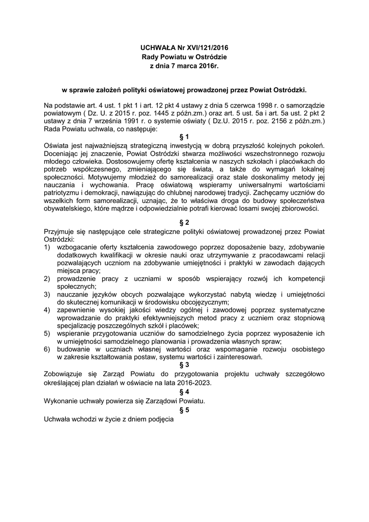 UCHWAŁA Nr XVI/121/2016 Rady Powiatu w Ostródzie z dnia 7 marca 2016r. w sprawie założeń polityki oświatowej prowadzonej przez Powiat Ostródzki. Na podstawie art. 4 ust. 1 pkt 1 i art. 12 pkt 4 ustawy z dnia 5 czerwca 1998 r. o samorządzie powiatowym ( Dz. U. z 2015 r. poz. 1445 z późn.zm.) oraz art. 5 ust. 5a i art. 5a ust. 2 pkt 2 ustawy z dnia 7 września 1991 r. o systemie oświaty ( Dz.U. 2015 r. poz. 2156 z późn.zm.) Rada Powiatu uchwala, co następuje: §1 Oświata jest najważniejszą strategiczną inwestycją w dobrą przyszłość kolejnych pokoleń. Doceniając jej znaczenie, Powiat Ostródzki stwarza możliwości wszechstronnego rozwoju młodego człowieka. Dostosowujemy ofertę kształcenia w naszych szkołach i placówkach do potrzeb współczesnego, zmieniającego się świata, a także do wymagań lokalnej społeczności. Motywujemy młodzież do samorealizacji oraz stale doskonalimy metody jej nauczania i wychowania. Pracę oświatową wspieramy uniwersalnymi wartościami patriotyzmu i demokracji, nawiązując do chlubnej narodowej tradycji. Zachęcamy uczniów do wszelkich form samorealizacji, uznając, że to właściwa droga do budowy społeczeństwa obywatelskiego, które mądrze i odpowiedzialnie potrafi kierować losami swojej zbiorowości. §2 Przyjmuje się następujące cele strategiczne polityki oświatowej prowadzonej przez Powiat Ostródzki: 1) wzbogacanie oferty kształcenia zawodowego poprzez doposażenie bazy, zdobywanie dodatkowych kwalifikacji w okresie nauki oraz utrzymywanie z pracodawcami relacji pozwalających uczniom na zdobywanie umiejętności i praktyki w zawodach dających miejsca pracy; 2) prowadzenie pracy z uczniami w sposób wspierający rozwój ich kompetencji społecznych; 3) nauczanie języków obcych pozwalające wykorzystać nabytą wiedzę i umiejętności do skutecznej komunikacji w środowisku obcojęzycznym; 4) zapewnienie wysokiej jakości wiedzy ogólnej i zawodowej poprzez systematyczne wprowadzanie do praktyki efektywniejszych metod pracy z uczniem oraz stopniową specjalizację poszczególnych szkół i placówek; 5) wspieranie przygotowania uczniów do samodzielnego życia poprzez wyposażenie ich w umiejętności samodzielnego planowania i prowadzenia własnych spraw; 6) budowanie w uczniach własnej wartości oraz wspomaganie rozwoju osobistego w zakresie kształtowania postaw, systemu wartości i zainteresowań. §3 Zobowiązuje się Zarząd Powiatu do przygotowania projektu uchwały szczegółowo określającej plan działań w oświacie na lata 2016-2023. §4 Wykonanie uchwały powierza się Zarządowi Powiatu. §5 Uchwała wchodzi w życie z dniem podjęcia UZASADNIENIE do uchwały w sprawie założeń polityki oświatowej prowadzonej przez Powiat Ostródzki. Projekt uchwały w sprawie założeń polityki oświatowej prowadzonej przez Powiat Ostródzki jest wynikiem pracy nad dokumentem pod nazwą „ Strategia Edukacyjna Powiatu Ostródzkiego na lata 2016-2023”. W ramach tego przedsięwzięcia w okresie od kwietnia 2015 r. do stycznia 2016 r. dokonano: - powołano Zespół ds., opracowania Strategii Edukacyjnej Powiatu Ostródzkiego na lata 2016-2023, - diagnozy placówek oświatowych prowadzonych przez Powiat Ostródzki, - sporządzono i zaprezentowano raport o stanie poszczególnych placówek oraz stanie oświaty w powiecie, - przeprowadzono cykl spotkań środowiskowych mających na celu zebranie oczekiwań społecznych w zakresie kierunków rozwoju oświaty w Powiecie Ostródzkim, - przeprowadzono Forum Oświatowe podczas którego opracowano cele strategiczne, określone na podstawie wyników spotkań środowiskowych. Przedstawione w projekcie wymienionych działań. uchwały cele strategiczne stanowią konkluzję wyżej