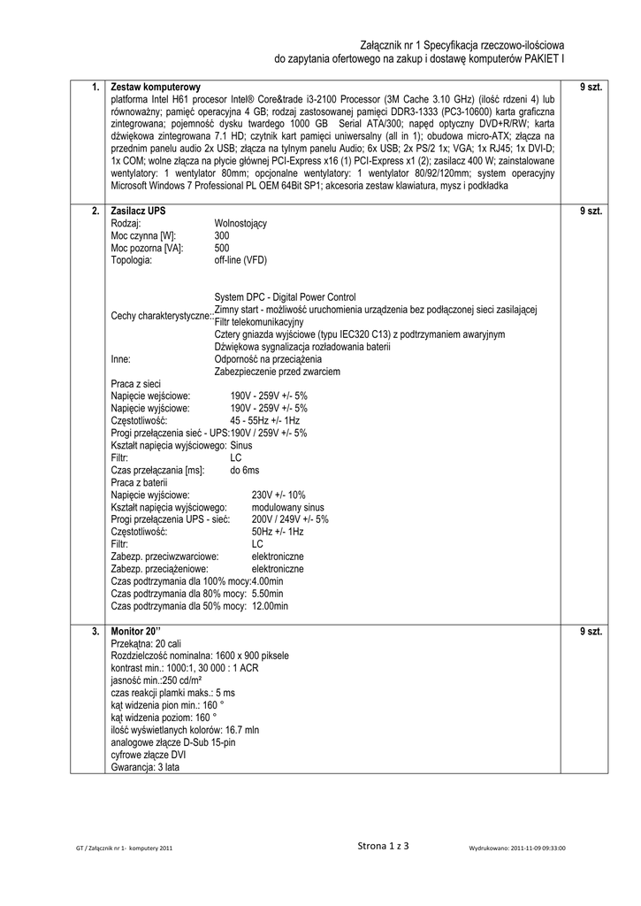 Załącznik nr 1 Specyfikacja rzeczowo-ilościowa do zapytania ofertowego na zakup i dostawę komputerów PAKIET I 1. Zestaw komputerowy platforma Intel H61 procesor Intel® Core&trade i3-2100 Processor (3M Cache 3.10 GHz) (ilość rdzeni 4) lub równoważny; pamięć operacyjna 4 GB; rodzaj zastosowanej pamięci DDR3-1333 (PC3-10600) karta graficzna zintegrowana; pojemność dysku twardego 1000 GB Serial ATA/300; napęd optyczny DVD+R/RW; karta dźwiękowa zintegrowana 7.1 HD; czytnik kart pamięci uniwersalny (all in 1); obudowa micro-ATX; złącza na przednim panelu audio 2x USB; złącza na tylnym panelu Audio; 6x USB; 2x PS/2 1x; VGA; 1x RJ45; 1x DVI-D; 1x COM; wolne złącza na płycie głównej PCI-Express x16 (1) PCI-Express x1 (2); zasilacz 400 W; zainstalowane wentylatory: 1 wentylator 80mm; opcjonalne wentylatory: 1 wentylator 80/92/120mm; system operacyjny Microsoft Windows 7 Professional PL OEM 64Bit SP1; akcesoria zestaw klawiatura, mysz i podkładka 9 szt. 2. Zasilacz UPS Rodzaj: Moc czynna [W]: Moc pozorna [VA]: Topologia: 9 szt. Wolnostojący 300 500 off-line (VFD) System DPC - Digital Power Control Zimny start - możliwość uruchomienia urządzenia bez podłączonej sieci zasilającej Cechy charakterystyczne:: Filtr telekomunikacyjny Cztery gniazda wyjściowe (typu IEC320 C13) z podtrzymaniem awaryjnym Dźwiękowa sygnalizacja rozładowania baterii Inne: Odporność na przeciążenia Zabezpieczenie przed zwarciem Praca z sieci Napięcie wejściowe: 190V - 259V +/- 5% Napięcie wyjściowe: 190V - 259V +/- 5% Częstotliwość: 45 - 55Hz +/- 1Hz Progi przełączenia sieć - UPS:190V / 259V +/- 5% Kształt napięcia wyjściowego: Sinus Filtr: LC Czas przełączania [ms]: do 6ms Praca z baterii Napięcie wyjściowe: 230V +/- 10% Kształt napięcia wyjściowego: modulowany sinus Progi przełączenia UPS - sieć: 200V / 249V +/- 5% Częstotliwość: 50Hz +/- 1Hz Filtr: LC Zabezp. przeciwzwarciowe: elektroniczne Zabezp. przeciążeniowe: elektroniczne Czas podtrzymania dla 100% mocy:4.00min Czas podtrzymania dla 80% mocy: 5.50min Czas podtrzymania dla 50% mocy: 12.00min 3. Monitor 20’’ Przekątna: 20 cali Rozdzielczość nominalna: 1600 x 900 piksele kontrast min.: 1000:1, 30 000 : 1 ACR jasność min.:250 cd/m² czas reakcji plamki maks.: 5 ms kąt widzenia pion min.: 160 ° kąt widzenia poziom: 160 ° ilość wyświetlanych kolorów: 16.7 mln analogowe złącze D-Sub 15-pin cyfrowe złącze DVI Gwarancja: 3 lata GT / Załącznik nr 1- komputery 2011 9 szt. Strona 1 z 3 Wydrukowano: 2011-11-09 09:33:00 Załącznik nr 1 Specyfikacja rzeczowo-ilościowa do zapytania ofertowego na zakup i dostawę komputerów PAKIET I 4. Laptop Ekran: Przekątna ekranu [cal] 15.6, natywna rozdzielczość: 1366 x 768 Karta graficzna NVIDIA GeForce 520 lub równoważna Procesor Intel Core i3-2310M lub równowazny Taktowanie procesora [MHz] 2100 Pamięć RAM 4 GB DDR3 Urządzenie wskazujące Touchpad Klawiatura z wydzieloną częścią numeryczną Dźwięk: Wbudowane głośniki; wbudowany mikrofon Dysk twardy 500 GB Napędy DVD-Super Multi DL Zarządzanie bezpieczeństwem: Gniazdo Kensington Lock Akumulator 6-komorowy Litowo-Jonowy; pojemność akumulatora 4400 mAh; maksymalny czas pracy: 4.5h Wbudowana kamera internetowa Komunikacja Karta sieciowa 10/100/1000 Łączność bezprzewodowa WiFi 802.11 b/g/n złącza A/V: wyjście D-Sub, wyjście HDMI, wejście mikrofonowe, wyjście słuchawkowe złącza USB x3; gniazda rozszerzeń: czytnik kart pamięci RJ-45 LAN Maksymalna prędkość przewodowej transmisji danych - do 1000 Mb/s Oprogramowanie: System operacyjny Windows 7 Professional 64 bit 5. 2 szt. Dyski HDD Western Digital Caviar RAID Edition 4 500GB SATA/300 7200rpm 64MB 3,5cala (WD5003ABYX) 6. 1 szt. Switch: Gwarancja liczba portów 10/100 Mbit 48 szt. liczba portów 1000 Mbit 2 szt. IEEE 802.3z IEEE 802.3x flow control IEEE 802.3u IEEE 802.3ad IEEE 802.3ab IEEE 802.3 IEEE 802.1Q IEEE 802.1p rozmiar tablicy adresów MAC 8000 algorytm przełączania store-and-forward prędkośc magistrali wew. 17.6 Gb/s obsługa VLANów tak możliwość instalacji w szafach 19' tak obsługiwane protokoły GT / Załącznik nr 1- komputery 2011 5 lat Strona 2 z 3 Wydrukowano: 2011-11-09 09:33:00 Załącznik nr 1 Specyfikacja rzeczowo-ilościowa do zapytania ofertowego na zakup i dostawę komputerów PAKIET I 7. Zestaw komputerowy z monitorem i zasilaczem UPS (zakup ze środków inwestycyjnych) Komputer procesor Intel® Core™ i5-2400 Processor (6M Cache, 3.10 GHz) ilość pamięci operacyjnej 4 GB rodzaj zastosowanej pamięci DDR3-1333 (PC3-10600) karta graficzna zintegrowana pojemność dysku twardego 1000 GB Serial ATA/600 napęd optyczny DVD+/-RW karta dźwiękowa zintegrowana czytnik kart pamięci: xD, SD, MS Pro, MS, MMC, CF obudowa CoolerMaster ELITE 334 (RC-334-KKN1-GP) lub równoważna złącza na przednim panelu: audio, min. 2x USB złącza na tylnym panelu: Audio, 6x USB, 1x VGA, 1x RJ45, 1x PS/2, 1x LPT, 1x DVI-I wolne złącza na płycie głównej: PCI-Express x4 (1), PCI-Express x1 (1), PCI-Express x16 (1), PCI (1) zasilacz 400 W zainstalowane wentylatory: 1 wentylator 120 mm system operacyjny: Windows 7 Professional 64 bit akcesoria: zestaw klawiatura, mysz laserowa, podkładka Monitor 20’’ przekątna: 20 cali, rozdzielczość nominalna: 1600 x 900 piksele kontrast min.: 1000:1, 30 000 : 1 ACR, jasność min.:250 cd/m² czas reakcji plamki maks.: 5 ms kąt widzenia pion min.: 160 ° , kąt widzenia poziom min.: 160 ° ilość wyświetlanych kolorów: 16.7 mln analogowe złącze D-Sub 15-pin, cyfrowe złącze DVI gwarancja: 3 lata Zasilacz UPS Rodzaj: Wolnostojący Moc czynna [W]: 300 Moc pozorna [VA]: 500 Topologia: off-line (VFD) Inne: Cechy charakterystyczne: System DPC - Digital Power Control Zimny start - możliwość uruchomienia urządzenia bez podłączonej sieci zasilającej Filtr telekomunikacyjny Cztery gniazda wyjściowe (typu IEC320 C13) z podtrzymaniem awaryjnym Dźwiękowa syg