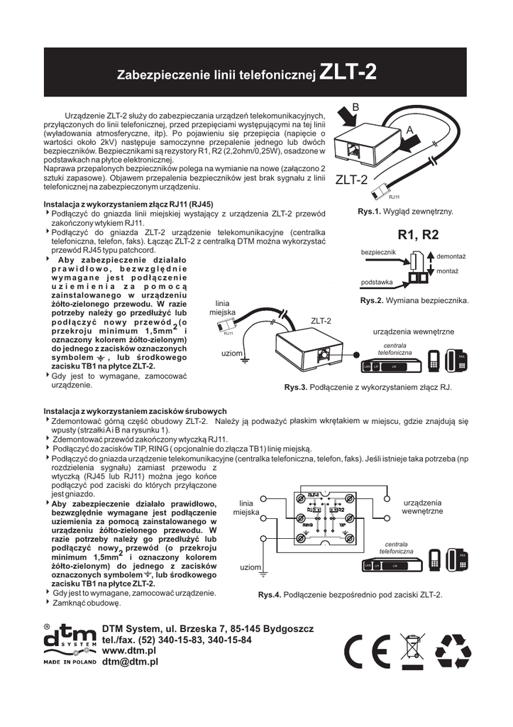 Zabezpieczenie linii telefonicznej ZLT-2 Urządzenie ZLT-2 służy do zabezpieczania urządzeń telekomunikacyjnych, przyłączonych do linii telefonicznej, przed przepięciami występującymi na tej linii (wyładowania atmosferyczne, itp). Po pojawieniu się przepięcia (napięcie o wartości około 2kV) następuje samoczynne przepalenie jednego lub dwóch bezpieczników. Bezpiecznikami są rezystory R1, R2 (2,2ohm/0,25W), osadzone w podstawkach na płytce elektronicznej. Naprawa przepalonych bezpieczników polega na wymianie na nowe (załączono 2 sztuki zapasowe). Objawem przepalenia bezpieczników jest brak sygnału z linii telefonicznej na zabezpieczonym urządzeniu. B A ZLT-2 RJ11 Instalacja z wykorzystaniem złącz RJ11 (RJ45) Rys.1. Wygląd zewnętrzny. 4Podłączyć do gniazda linii miejskiej wystający z urządzenia ZLT-2 przewód zakończony wtykiem RJ11. 4Podłączyć do gniazda ZLT-2 urządzenie telekomunikacyjne (centralka telefoniczna, telefon, faks). Łącząc ZLT-2 z centralką DTM można wykorzystać przewód RJ45 typu patchcord. bezpiecznik demontaż 4 Aby zabezpieczenie działało prawidłowo, bezwzględnie montaż wymagane jest podłączenie podstawka uziemienia za pomocą zainstalowanego w urządzeniu Rys.2. Wymiana bezpiecznika. linia żółto-zielonego przewodu. W razie miejska potrzeby należy go przedłużyć lub ZLT-2 podłączyć nowy przewód (o 2 przekroju minimum 1,5mm i urządzenia wewnętrzne RJ11 oznaczony kolorem żółto-zielonym) centrala do jednego z zacisków oznaczonych telefoniczna uziom symbolem , lub środkowego zacisku TB1 na płytce ZLT-2. 4Gdy jest to wymagane, zamocować urządzenie. Rys.3. Podłączenie z wykorzystaniem złącz RJ. R1, R2 FAX LAN LM LW Instalacja z wykorzystaniem zacisków śrubowych 4Zdemontować górną część obudowy ZLT-2. Należy ją podważyć płaskim wkrętakiem w miejscu, gdzie znajdują się wpusty (strzałki A i B na rysunku 1). 4 Zdemontować przewód zakończony wtyczką RJ11. 4 Podłączyć do zacisków TIP, RING ( opcjonalnie do złącza TB1) linię miejską. 4Podłączyć do gniazda urządzenie telekomunikacyjne (centralka telefoniczna, telefon, faks). Jeśli istnieje taka potrzeba (np rozdzielenia sygnału) zamiast przewodu z wtyczką (RJ45 lub RJ11) można jego końce podłączyć pod zaciski do których przyłączone jest gniazdo. urządzenia linia 4Aby zabezpieczenie działało prawidłowo, wewnętrzne miejska bezwzględnie wymagane jest podłączenie uziemienia za pomocą zainstalowanego w urządzeniu żółto-zielonego przewodu. W razie potrzeby należy go przedłużyć lub centrala podłączyć nowy przewód (o przekroju telefoniczna 2 minimum 1,5mm i oznaczony kolorem żółto-zielonym) do jednego z zacisków uziom oznaczonych symbolem , lub środkowego zacisku TB1 na płytce ZLT-2. 4 Gdy jest to wymagane, zamocować urządzenie. Rys.4. Podłączenie bezpośrednio pod zaciski ZLT-2. 4 Zamknąć obudowę. FAX LAN DTM System, ul. Brzeska 7, 85-145 Bydgoszcz tel./fax. (52) 340-15-83, 340-15-84 www.dtm.pl [email protected] LM LW