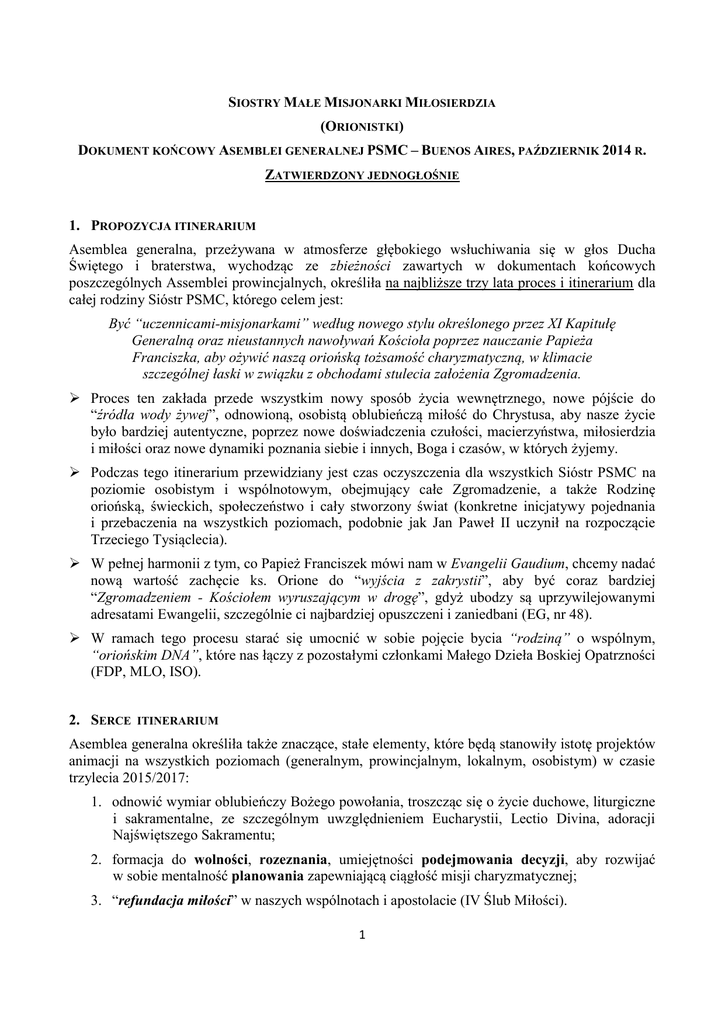 SIOSTRY MAŁE MISJONARKI MIŁOSIERDZIA (ORIONISTKI) DOKUMENT KOŃCOWY ASEMBLEI GENERALNEJ PSMC – BUENOS AIRES, PAŹDZIERNIK 2014 R. ZATWIERDZONY JEDNOGŁOŚNIE 1. PROPOZYCJA ITINERARIUM Asemblea generalna, przeżywana w atmosferze głębokiego wsłuchiwania się w głos Ducha Świętego i braterstwa, wychodząc ze zbieżności zawartych w dokumentach końcowych poszczególnych Assemblei prowincjalnych, określiła na najbliższe trzy lata proces i itinerarium dla całej rodziny Sióstr PSMC, którego celem jest: Być “uczennicami-misjonarkami” według nowego stylu określonego przez XI Kapitułę Generalną oraz nieustannych nawoływań Kościoła poprzez nauczanie Papieża Franciszka, aby ożywić naszą oriońską tożsamość charyzmatyczną, w klimacie szczególnej łaski w związku z obchodami stulecia założenia Zgromadzenia. Proces ten zakłada przede wszystkim nowy sposób życia wewnętrznego, nowe pójście do “źródła wody żywej”, odnowioną, osobistą oblubieńczą miłość do Chrystusa, aby nasze życie było bardziej autentyczne, poprzez nowe doświadczenia czułości, macierzyństwa, miłosierdzia i miłości oraz nowe dynamiki poznania siebie i innych, Boga i czasów, w których żyjemy. Podczas tego itinerarium przewidziany jest czas oczyszczenia dla wszystkich Sióstr PSMC na poziomie osobistym i wspólnotowym, obejmujący całe Zgromadzenie, a także Rodzinę oriońską, świeckich, społeczeństwo i cały stworzony świat (konkretne inicjatywy pojednania i przebaczenia na wszystkich poziomach, podobnie jak Jan Paweł II uczynił na rozpoczącie Trzeciego Tysiąclecia). W pełnej harmonii z tym, co Papież Franciszek mówi nam w Evangelii Gaudium, chcemy nadać nową wartość zachęcie ks. Orione do “wyjścia z zakrystii”, aby być coraz bardziej “Zgromadzeniem - Kościołem wyruszającym w drogę”, gdyż ubodzy są uprzywilejowanymi adresatami Ewangelii, szczególnie ci najbardziej opuszczeni i zaniedbani (EG, nr 48). W ramach tego procesu starać się umocnić w sobie pojęcie bycia “rodziną” o wspólnym, “oriońskim DNA”, które nas łączy z pozostałymi członkami Małego Dzieła Boskiej Opatrzności (FDP, MLO, ISO). 2. SERCE ITINERARIUM Asemblea generalna określiła także znaczące, stałe elementy, które będą stanowiły istotę projektów animacji na wszystkich poziomach (generalnym, prowincjalnym, lokalnym, osobistym) w czasie trzylecia 2015/2017: 1. odnowić wymiar oblubieńczy Bożego powołania, troszcząc się o życie duchowe, liturgiczne i sakramentalne, ze szczególnym uwzględnieniem Eucharystii, Lectio Divina, adoracji Najświętszego Sakramentu; 2. formacja do wolności, rozeznania, umiejętności podejmowania decyzji, aby rozwijać w sobie mentalność planowania zapewniającą ciągłość misji charyzmatycznej; 3. “refundacja miłości” w naszych wspólnotach i apostolacie (IV Ślub Miłości). 1 4. “rewolucja czułości”, konkretne gesty bliskości; docenianie i promowanie darów posiadanych przez współsiostry oraz momentów sprzyjających lepszemu poznaniu się we wspólnocie; 5. powrót do źródeł charyzmatycznych poprzez systematyczne i pogłębione studium kontekstu historycznego, społecznego, duchowego naszego Założyciela; 6. nabycie umiejętności czytania znaków czasu, aby w sposób konkretny i profetyczny realizować “wyjście z zakrystii”; 7. aktualizacja lokalizacji PAI w naszych wspólnotach i apostolacie; 8. ożywienie DMP, poprzez opracowanie systematycznego i konkretnego projektu, z przeznaczeniem na ten cel nowych środków. 3. POSTAWA OSOBISTA Aby itinerarium przyniosło oczekiwane owoce niezbędną i decydującą rzeczą jest “decyzja”, osobista zgoda każdej Siostry PSMC oraz głęboka postawa uległości na działanie Ducha Świętego. Taka właśnie postawa, która będzie towarzyszyć refundacji wszystkich wymienionych wyżej aspektów i obszarów, prowadząc do realnej odnowy stylu życia, polega na „oduczeniu się”, aby „nauczyć się” nowości działania Ducha Świętego w tym momencie historycznym. Oznacza to myślenie o nowych strukturach (mentalnych, duchowych, posługi władzy, modlitwy, formacji, wspólnoty) i ich realizacja, w sposób odpowiedni do czasów, w których żyjemy, z pomocą świeckich, młodych, całej Rodziny oriońskiej tak, aby Chrystus stanowił centrum naszego życia (por. Akta XI KG, nr 24). 4. PRIORYTETOWE STRUKTURY DO “REFUNDACJI” Aby przemiana, której wszystkie pragniemy, nie pozostała tylko pięknym pomysłem, lub pobożnym życzeniem, trzeba, by itinerarium zawierało procesy transformacji i zmiany (refundacji) niektórych podstawowych struktur: 1. Życie duchowe ożywione poprzez twórcze sposoby modlitwy, dobrze przygotowaną modlitwę litugiczną. 2. Formacja na wszystkich poziomach i etapach życia; ze szczególnym uwzględnieniem towarzyszenia osobistego. 3. Animacja (posługa władzy) na wszystkich poziomach. Poprzez: warsztaty lectio divina; rekolekcje, rewizję życia, różne spotkania przeprowadzane w oparciu o nowe dynamiki, jako odpowiedź na potrzeby duchowe, psychologiczne, ludzkie, kulturowe “osoby” dzisiaj (przełom antropologiczny). przygotowanie do animacji, towarzyszenia innym i komunikacji, ujednolicając style. Kontynuację warsztatów formacyjnych dla przełożonych lokalnych i prowincjalnych, warsztaty charyzmatyczne we wspólnotach i ze świeckimi. 2 5. PROPOZYCJE DOTYCZĄCE WPROWADZENIA W ŻYCIE TEGO ITINERARIUM Asemblea generalna zatwierdziła również kilka rad, wskazówek do umieszczenia w itinerarium oraz kilka konkretnych dynamik, na poziomie generalnym i prowincjalnym: a. POZIOM GENERALNY b. POZIOM PROWINCJALNY/REGIONALNY Jak zrealizować itinerarium: - Jak zrealizować itinerarium: Opracować główne linie dla wszystkich Sióstr PSMC. Promować proces pojednania osobistego i wspólnotowego. Promować dzień prośby o przebaczenie w kontekście stulecia założenia Zgromadzenia. - Re