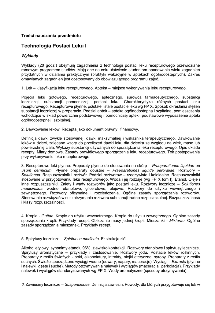 Treści nauczania przedmiotu Technologia Postaci Leku I Wykłady Wykłady (20 godz.) obejmują zagadnienia z technologii postaci leku recepturowego przewidziane ramowym programem studiów. Mają one na celu ułatwienie studentom opanowania wielu zagadnień przydatnych w działaniu praktycznym (praktyki wakacyjne w aptekach ogólnodostępnych). Zakres omawianych zagadnień jest dostosowany do obowiązującego programu zajęć. 1. Lek – klasyfikacja leku recepturowego. Apteka – miejsce wykonywania leku recepturowego. Pojęcia leku gotowego, recepturowego, aptecznego, surowca farmaceutycznego, substancji leczniczej, substancji pomocniczej, postaci leku. Charakterystyka różnych postaci leku recepturowego. Recepturowe płynne, półstałe i stałe postacie leku wg FP X. Sposób określania stężeń substancji leczniczej w preparacie. Podział aptek – apteka ogólnodostępna i szpitalna, pomieszczenia wchodzące w skład powierzchni podstawowej i pomocniczej apteki, podstawowe wyposażenie apteki ogólnodostępnej i szpitalnej. 2. Dawkowanie leków. Recepta jako dokument prawny i finansowy. Definicja dawki zwykle stosowanej, dawki maksymalnej i wskaźnika terapeutycznego. Dawkowanie leków u dzieci, zalecane wzory do przeliczeń dawki leku dla dziecka ze względu na wiek, masę lub powierzchnię ciała. Wykazy substancji używanych do sporządzania leku recepturowego. Opis układu recepty. Miary domowe. Zasady prawidłowego sporządzania leku recepturowego. Tok postępowania przy wykonywaniu leku recepturowego. 3. Recepturowe leki płynne. Preparaty płynne do stosowania na skórę – Praeparationes liquidae ad usum dermicum. Płynne preparaty doustne – Praeparationes liquide peroraliae. Roztwory – Solutiones. Rozpuszczalnik i roztwór. Podział roztworów – rzeczywiste i koloidalne. Rozpuszczalniki stosowane w przygotowaniu leku recepturowego. Woda i jej rodzaje (wg FP X tom I). Etanol. Oleje i inne rozpuszczalniki. Zalety i wady roztworów jako postaci leku. Roztwory lecznicze – Solutiones medicinales: wodne, etanolowe, glicerolowe, olejowe. Roztwory do użytku wewnętrznego i zewnętrznego. Roztwory oficynalne i rozcieńczenia. Ogólne zasady sporządzania roztworów. Stosowanie rozwiązań w celu otrzymania roztworu substancji trudno rozpuszczalnej. Rozpuszczalność i klasy rozpuszczalności. 4. Krople - Guttae. Krople do użytku wewnętrznego. Krople do użytku zewnętrznego. Ogólne zasady sporządzania kropli. Przykłady recept. Obliczanie masy jednej kropli. Mieszanki - Mixturae. Ogólne zasady sporządzania mieszanek. Przykłady recept. 5. Spirytusy lecznicze – Spirituosa medicata. Ekstrakcja ziół. Alkohol etylowy, synonimy etanolu 96%, zjawisko kontrakcji. Roztwory etanolowe i spirytusy lecznicze. Spirytusy aromatyczne – przykłady i zastosowanie. Roztwory jodu. Postacie leków roślinnych. Preparaty z roślin świeżych - soki, alkoholatury, intrakty, olejki eteryczne, syropy. Preparaty z roślin suchych. Świeżo sporządzone wyciągi wodne (odwary, napary, maceracje). Wyciągi – Extracta (płynne i nalewki, gęste i suche). Metody otrzymywania nalewek i wyciągów (maceracja i perkolacja). Przykłady nalewek i wyciągów standaryzowanych wg FP X. Wody aromatyczne (sposoby otrzymywania). 6. Zawiesiny lecznicze – Suspensiones. Definicja zawiesin. Powody, dla których przygotowuje się lek w postaci zawiesiny. Czynniki wpływające na trwałość zawiesin. Podział zawiesin - do użytku wewnętrznego i zewnętrznego wg FP X. Pudry płynne. Ogólne zasady sporządzania zawiesin. Przykłady recept. Emulsje lecznicze – Emulsiones medicinales. Definicja emulsji wg FP X. Typy emulsji. Liczba HLB. Emulsje do użytku wewnętrznego – Emulsiones ad usum internum i zewnętrznego - Emulsiones ad usum externum (maści, kremy, krople do nosa, mazidła – Linimenta). Emulgatory i ich podział. Przykłady i zastosowanie emulgatorów anionowo i kationowo czynnych. Przykłady i zastosowanie emulgatorów niejonowych. Emulgatory amfoteryczne. Emulgatory koloidalne tzw. „rzekome” i ich zastosowanie. Emulsje z gumą arabską. Sporządzanie emulsji – metoda angielska i kontynentalna. 7. Recepturowe leki półstałe. Półstałe preparaty do stosowania na skórę - Preparationes molles ad usum dermicum (maści, kremy, żele, pasty, kataplazmy, plastry lecznicze). Maści – Unguenta. Definicja maści wg FP X. Rodzaje maści - podział ze względu na drogę podania i strukturę. Pasty. Podłoża maściowe: podłoża maści lipofilowych (węglowodorowe, smalec wieprzowy), podłoża absorpcyjne i ich składniki (lanolina, euceryna, woski), podłoża hydrofilowe (makrogolowe, hydrożele). Kremy hydrofobowe i hydrofilowe. Sporządzanie maści w warunkach aptecznych; maści roztwory, maści zawiesiny, maści emulsje. 8. Leki do oczu – Ophtalmica. Budowa rogówki, skład płynu łzowego. Wymagania stawiane lekom do oczu. Izohydria. Euhydria. Podział postaci leków do oczu wg FP X. Płynne postacie do oczu (wodne i olejowe krople do oczu, płyny do oczu, zawiesiny do oczu). Półstałe i stałe postacie do oczu. Wymagania stawiane maściom do oczu. Sporządzanie leków do oczu- roztwory, zawiesiny, maści. Zastosowanie środków konserwujących. Pomiar osmolarności wg FP X. 9. Proszki- Pulveres. Definicja wg FP X. Rozdrabnianie ciał stałych. Proszki proste i złożone. Proszki rozcieńczone. Proszki mianowane. Olejkocukry. Sposób zapisywania proszków. Proszki niedzielone i dzielone, do użytku wewnętrznego i zewnętrznego. Pudry stałe. Zalety stosowania stałych dozowanych postaci leku w porównaniu z płynnymi postaciami leku. Wymagania stawiane proszkom. Sposób wykonania. 10. Czopki – Suppositoria. Definicja wg FP X. Podział czopków. Podłoża czopkowe – olej kakaowy, półsyntetyczne glicerydy kwasów tłuszczowych, makrogole, masy żelatynowo-glicerolowe. Wymagania stawiane podłożom czopkowym. Substancje pomocnicze stosowane w czopkach. Metody otrzymyw