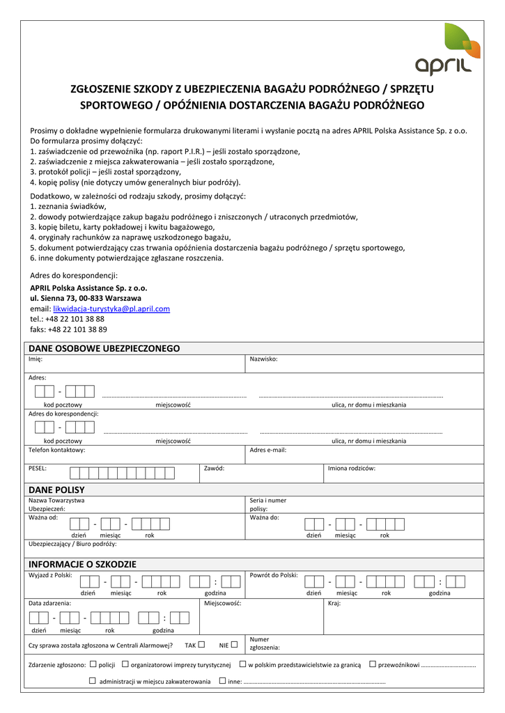 ZGŁOSZENIE SZKODY Z UBEZPIECZENIA BAGAŻU PODRÓŻNEGO / SPRZĘTU SPORTOWEGO / OPÓŹNIENIA DOSTARCZENIA BAGAŻU PODRÓŻNEGO Prosimy o dokładne wypełnienie formularza drukowanymi literami i wysłanie pocztą na adres APRIL Polska Assistance Sp. z o.o. Do formularza prosimy dołączyć: 1. zaświadczenie od przewoźnika (np. raport P.I.R.) – jeśli zostało sporządzone, 2. zaświadczenie z miejsca zakwaterowania – jeśli zostało sporządzone, 3. protokół policji – jeśli został sporządzony, 4. kopię polisy (nie dotyczy umów generalnych biur podróży). Dodatkowo, w zależności od rodzaju szkody, prosimy dołączyć: 1. zeznania świadków, 2. dowody potwierdzające zakup bagażu podróżnego i zniszczonych / utraconych przedmiotów, 3. kopię biletu, karty pokładowej i kwitu bagażowego, 4. oryginały rachunków za naprawę uszkodzonego bagażu, 5. dokument potwierdzający czas trwania opóźnienia dostarczenia bagażu podróżnego / sprzętu sportowego, 6. inne dokumenty potwierdzające zgłaszane roszczenia. Adres do korespondencji: APRIL Polska Assistance Sp. z o.o. ul. Sienna 73, 00-833 Warszawa email: [email protected] tel.: +48 22 101 38 88 faks: +48 22 101 38 89 DANE OSOBOWE UBEZPIECZONEGO Imię: Nazwisko: Adres: kod pocztowy Adres do korespondencji: kod pocztowy Telefon kontaktowy: ……………………………………………………………………………..... miejscowość ………………………………………………………………………………………………………. ulica, nr domu i mieszkania ……………………………………………………………………………….. miejscowość ……………………………………………………………………………………………………… ulica, nr domu i mieszkania Adres e-mail: PESEL: Zawód: Imiona rodziców: DANE POLISY Nazwa Towarzystwa Ubezpieczeń: Ważna od: - Seria i numer polisy: Ważna do: - dzień miesiąc Ubezpieczający / Biuro podróży: rok dzień miesiąc rok INFORMACJE O SZKODZIE Wyjazd z Polski: dzień miesiąc rok godzina Miejscowość: Data zdarzenia: dzień miesiąc dzień miesiąc Kraj: - : rok godzina : rok godzina Czy sprawa została zgłoszona w Centrali Alarmowej? Zdarzenie zgłoszono: Powrót do Polski: : TAK □ NIE □ Numer zgłoszenia: □ policji □ organizatorowi imprezy turystycznej □ w polskim przedstawicielstwie za granicą □ przewoźnikowi …………………………….. □ administracji w miejscu zakwaterowania □ inne: ………………………………………………………………………………. Szkoda powstała wskutek: □ zaginięcia / zagubienia przez …………………………………………………………………………………………………… □ kradzieży bez włamania / kradzieży z włamaniem* z: □ przechowalni bagażu □ zamkniętego indywidualnego pomieszczenia bagażowego na dworcu / lotnisku* □ zamkniętego miejsca zakwaterowania □ zamkniętej kabiny jednostki pływającej / przyczepy kempingowej □ samochodu □ terenu strzeżonego □ podczas przewozu wykonywanego przez zawodowego przewoźnika □ konfiskaty □ opóźnienia w dostarczeniu □ zdarzenia losowego (trzęsienie ziemi / powódź / huragan / pożar */ inne: …………………………………………………………………..) □ akcji ratowniczej prowadzonej w związku ze zdarzeniami losowymi □ nieszczęśliwego wypadku / nagłego zachorowania* powodujących pozbawienie możliwości zaopiekowania się bagażem lub jego zabezpieczenia □ wypadku lub katastrofy środka komunikacji lądowej / powietrznej / wodnej* □ inne: ………………………………………………………………………………………………………………………………………… * niepotrzebne skreślić Szczegóły lotu, podczas którego doszło do opóźnienia dostarczenia bagażu podróżnego / sprzętu sportowego (daty, godziny, trasa podróży): Szczegółowy opis zdarzenia: Jeśli są świadkowie zdarzenia to podać nazwiska i imiona oraz dane teleadresowe: Wykaz rzeczy zniszczonych / utraconych lub zakupionych przedmiotów osobistego użytku: Nazwa przedmiotu Rodzaj materiału, marka, typ Stopień zużycia Ogółem całkowita wysokość zgłoszonych roszczeń: …………………………………………………………………………… złotych Data i cena zakupu Stopień uszkodzenia Czy wystąpił Pan / Pani o odszkodowanie / zaliczkę za zniszczony / utracony / opóźniony bagaż / sprzęt sportowy, do przewoźnika, administracji w miejscu zakwaterowania itp.? TAK □ NIE □ Jeśli tak to proszę podać kwotę uzyskanego odszkodowania / zaliczki i przez kogo zostało wypłacone: Czy posiada Pan / Pani inna polisę obejmującą to zdarzenie? TAK □ NIE □ Jeśli tak, prosimy podać nazwę zakładu ubezpieczeń i serię oraz numer polisy: OŚWIADCZENIE 1. Oświadczam, że wszelkie dane i informacje zostały przeze mnie podane zgodnie z prawdą i według najlepszej wiedzy. 2. Oświadczam, że jestem świadomy(a), że podanie informacji nieprawdziwych może spowodować wydanie przez Ubezpieczyciela decyzji o odmowie wypłaty odszkodowania na podstawie art. 815§3 kodeksu cywilnego (Dz.U.1964.16.93) oraz może stanowić podstawę do pociągnięcia zgłaszającego do odpowiedzialności karnej za przestępstwo określone w art. 286 kodeksu karnego (Dz.U.1997.88.553), zgodnie z którym ”Kto, w celu osiągnięcia korzyści majątkowej, doprowadza inną osobę do niekorzystnego rozporządzenia własnym lub cudzym mieniem za pomocą wprowadzenia jej w błąd albo wyzyskania błędu lub niezdolności do należytego pojmowania przedsiębranego działania, podlega karze pozbawienia wolności od 6 miesięcy do lat 8”. 3. Wyrażam zgodę na przetwarzanie danych osobowych przez APRIL Polska Assistance Sp. z o.o. z siedzibą w Warszawie przy ul. Siennej 73 w cel