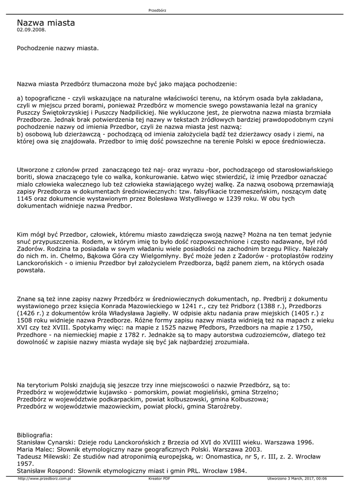 Przedbórz Nazwa miasta 02.09.2008. Pochodzenie nazwy miasta. Nazwa miasta Przedbórz tłumaczona może być jako mająca pochodzenie: a) topograficzne - czyli wskazujące na naturalne właściwości terenu, na którym osada była zakładana, czyli w miejscu przed borami, ponieważ Przedbórz w momencie swego powstawania leżał na granicy Puszczy Świętokrzyskiej i Puszczy Nadpilickiej. Nie wykluczone jest, że pierwotna nazwa miasta brzmiała Przedborze. Jednak brak potwierdzenia tej nazwy w tekstach żródłowych bardziej prawdopodobnym czyni pochodzenie nazwy od imienia Przedbor, czyli że nazwa miasta jest nazwą: b) osobową lub dzierżawczą - pochodzącą od imienia założyciela bądź też dzierżawcy osady i ziemi, na której owa się znajdowała. Przedbor to imię dość powszechne na terenie Polski w epoce średniowiecza. Utworzone z członów przed zanaczącego też naj- oraz wyrazu -bor, pochodzącego od starosłowiańskiego boriti, słowa znaczącego tyle co walka, konkurowanie. Łatwo więc stwierdzić, iż imię Przedbor oznaczać mialo człowieka walecznego lub też człowieka stawiającego wyżej walkę. Za nazwą osobową przemawiają zapisy Przedborza w dokumentach średniowiecznych: tzw. falsyfikacie trzemeszeńskim, noszącym datę 1145 oraz dokumencie wystawionym przez Bolesława Wstydliwego w 1239 roku. W obu tych dokumentach widnieje nazwa Predbor. Kim mógł być Przedbor, człowiek, któremu miasto zawdzięcza swoją nazwę? Można na ten temat jedynie snuć przypuszczenia. Rodem, w którym imię to było dość rozpowszechnione i często nadawane, był ród Zadorów. Rodzina ta posiadała w swym władaniu wiele posiadłości na zachodnim brzegu Pilicy. Należały do nich m. in. Chełmo, Bąkowa Góra czy Wielgomłyny. Być może jeden z Zadorów - protoplastów rodziny Lanckorońskich - o imieniu Przedbor był założycielem Przedborza, bądź panem ziem, na których osada powstała. Znane są też inne zapisy nazwy Przedbórz w średniowiecznych dokumentach, np. Predbrij z dokumentu wystawionego przez księcia Konrada Mazowieckiego w 1241 r., czy też Pridborz (1388 r.), Przedborzs (1426 r.) z dokumentów króla Władysława Jagiełły. W odpisie aktu nadania praw miejskich (1405 r.) z 1508 roku widnieje nazwa Przedborze. Różne formy zapisu nazwy miasta widnieją też na mapach z wieku XVI czy też XVIII. Spotykamy więc: na mapie z 1525 nazwę Pfedbors, Przedbors na mapie z 1750, Przedhore - na niemieckiej mapie z 1782 r. Jednakże są to mapy autorstwa cudzoziemców, dlatego też dowolność w zapisie nazwy miasta wydaje się być jak najbardziej zrozumiała. Na terytorium Polski znajdują się jeszcze trzy inne miejscowości o nazwie Przedbórz, są to: Przedbórz w województwie kujawsko - pomorskim, powiat mogieliński, gmina Strzelno; Przedbórz w województwie podkarpackim, powiat kolbuszowski, gmina Kolbuszowa; Przedbórz w województwie mazowieckim, powiat płocki, gmina Staroźreby. Bibliografia: Stanisław Cynarski: Dzieje rodu Lanckorońskich z Brzezia od XVI do XVIIII wieku. Warszawa 1996. Maria Malec: Słownik etymologiczny nazw geograficznych Polski. Warszawa 2003. Tadeusz Milewski: Ze studiów nad atroponimią europejską, w: Onomastica, nr 5, r. III, z. 2. Wrocław 1957. Stanisław Rospond: Słownik etymologiczny miast i gmin PRL. Wrocław 1984. http://www.przedborz.com.pl Kreator PDF Utworzono 3 March, 2017, 00:06 Przedbórz Kazimierz Rymut: Nazwy miast Polski. Wrocław 1987.Paweł Zięba http://www.przedborz.com.pl Kreator PDF Utworzono 3 March, 2017, 00:06