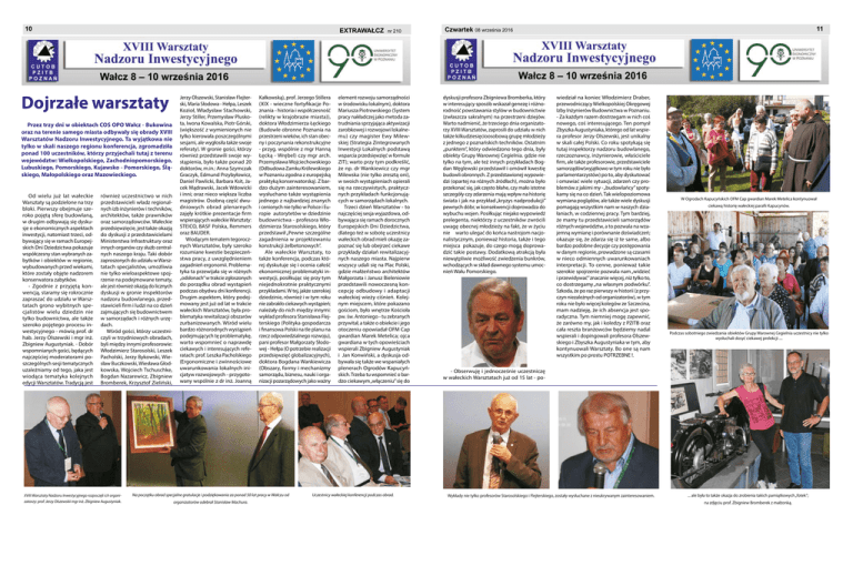 10 EXTRAWAŁCZ Dojrzałe warsztaty Przez trzy dni w obiektach COS OPO Wałcz - Bukowina oraz na terenie samego miasta odbywały się obrady XVIII Warsztatów Nadzoru Inwestycyjnego. Ta wyjątkowa nie tylko w skali naszego regionu konferencja, zgromadziła ponad 100 uczestników, którzy przyjechali tutaj z terenu województw: Wielkopolskiego, Zachodniopomorskiego, Lubuskiego, Pomorskiego, Kujawsko - Pomorskiego, Śląskiego, Małopolskiego oraz Mazowieckiego. Od wielu już lat wałeckie Warsztaty są podzielone na trzy bloki. Pierwszy obejmuje szeroko pojętą sferę budowlaną, w drugim odbywają się dyskusje o ekonomicznych aspektach inwestycji, natomiast trzeci, odbywający się w ramach Europejskich Dni Dziedzictwa pokazuje współczesny stan wybranych zabytków i obiektów w regionie, wybudowanych przed wiekami, które zostały objęte nadzorem konserwatora zabytków. - Zgodnie z przyjętą konwencją, staramy się rokrocznie zapraszać do udziału w Warsztatach grono wybitnych specjalistów wielu dziedzin nie tylko budownictwa, ale także szeroko pojętego procesu inwestycyjnego - mówią prof. dr hab. Jerzy Olszewski i mgr inż. Zbigniew Augustyniak. - Dobór wspomnianych gości, będących najczęściej moderatorami poszczególnych sesji tematycznych uzależniamy od tego, jaka jest wiodąca tematyka kolejnych edycji Warsztatów. Tradycją jest również uczestnictwo w nich przedstawicieli władz regionalnych izb inżynierów i techników, architektów, także prawników oraz samorządowców. Wałeckie przedsięwzięcie, jest także okazją do dyskusji z przedstawicielami Ministerstwa Infrastruktury oraz innych organów czy służb centralnych naszego kraju. Taki dobór zaproszonych do udziału w Warsztatach specjalistów, umożliwia nie tylko wieloaspektowe spojrzenie na podejmowane tematy, ale jest również okazją do licznych dyskusji w gronie inspektorów nadzoru budowlanego, przedstawicieli firm i ludzi na co dzień zajmujących się budownictwem w samorządach i różnych urzędach. Wśród gości, którzy uczestniczyli w trzydniowych obradach, byli między innymi profesorowie: Włodzimierz Starosolski, Leszek Pacholski, Jerzy Bykowski, Wiesław Buczkowski, Wiesława Głodkowska, Wojciech Tschuschke, Bogdan Nazarewicz, Zbigniew Bromberek, Krzysztof Zieliński, XVIII Warsztaty Nadzoru Inwestycyjnego rozpoczęli ich organizatorzy: prof. Jerzy Olszewskii mgr inż. Zbigniew Augustyniak. Jerzy Olszewski, Stanisław Flejterski, Maria Słodowa - Hełpa, Leszek Kozioł, Władysław Stachowski, Jerzy Stiller, Przemysław Pluskota, Iwona Kowalska, Piotr Górski, (większość z wymienionych nie tylko kierowała poszczególnymi sesjami, ale wygłosiła także swoje referaty). W gronie gości, którzy również przedstawili swoje wystąpienia, było także ponad 20 doktorów, m.in.: Anna Szymczak Graczyk, Edmund Przybyłowicz, Daniel Pawlicki, Barbara Ksit, Jacek Mądrawski, Jacek Wdowicki i inni; oraz nieco większa liczba magistrów. Osobną część dwudniowych obrad plenarnych zajęły krótkie prezentacje firm wspierających wałeckie Warsztaty: STEICO, BASF Polska, Remmers oraz BAUDER. Wiodącym tematem tegorocznych Warsztatów, były szeroko rozumiane kwestie bezpieczeństwa pracy, z uwzględnieniem zagadnień ergonomii. Problematyka ta przewijała się w różnych „odsłonach” w trakcie zgłoszonych do porządku obrad wystąpień podczas obydwu dni konferencji. Drugim aspektem, który podejmowany jest już od lat w trakcie wałeckich Warsztatów, była problematyka rewitalizacji obszarów zurbanizowanych. Wśród wielu bardzo różnorodnych wystąpień podejmujących tę problematykę, warto wspomnieć o naprawdę ciekawych i interesujących referatach: prof. Leszka Pacholskiego (Ergonomiczne i zwinnościowe uwarunkowania lokalnych inicjatyw rozwojowych - przygotowany wspólnie z dr inż. Joanną Kałkowską), prof. Jerzego Stillera (XIX - wieczne fortyfikacje Poznania - historia i współczesność (relikty w krajobrazie miasta)), doktora Włodzimierza Łęckiego (Budowle obronne Poznania na przestrzeni wieków, ich stan obecny i poczynania rekonstrukcyjne - przyg. wspólnie z mgr Hanną Łęcką - Wrębel) czy mgr arch. Przemysława Wojciechowskiego (Odbudowa Zamku Królewskiego w Poznaniu zgodna z europejską praktyką konserwatorską). Z bardzo dużym zainteresowaniem, wysłuchano także wystąpienia jednego z najbardziej znanych i cenionych nie tylko w Polsce i Europie autorytetów w dziedzinie budownictwa - profesora Włodzimierza Starosolskiego, który przedstawił „Pewne szczególne zagadnienia w projektowaniu konstrukcji żelbetonowych”. Ale wałeckie Warsztaty, to także konferencja, podczas której dyskutuje się i ocenia całość ekonomicznej problematyki inwestycji, posiłkując się przy tym niejednokrotnie praktycznymi przykładami. W tej, jakże szerokiej dziedzinie, również i w tym roku nie zabrakło ciekawych wystąpień; należały do nich między innymi: wykład profesora Stanisława Flejterskiego (Polityka gospodarcza i finansowa Polski na tle planu na rzecz odpowiedzialnego rozwoju), pani profesor Małgorzaty Słodowej - Hełpa (O potrzebie realizacji przedsięwzięć globalizacyjnych), doktora Bogdana Wankiewicza (Obszary, formy i mechanizmy samorządu, biznesu, nauki i organizacji pozarządowych jako ważny Na początku obrad specjalne gratulacje i podziękowania za ponad 50 lat pracy w Wałczu od organizatorów odebrał Stanisław Machura. nr 210 element rozwoju samorządności w środowisku lokalnym), doktora Mariusza Piotrowskiego (System pracy nakładczej jako metoda zatrudniania sprzyjająca aktywizacji zarobkowej i rozwojowi lokalnemu) czy magister Ewy Milewskiej (Strategia Zintegrowanych Inwestycji Lokalnych podstawą wsparcia przedsięwzięć w formule ZIT); warto przy tym podkreślić, że np. dr Wankiewicz czy mgr Milewska (nie tylko zresztą oni), w swoich wystąpieniach opierali się na rzeczywistych, praktycznych przykładach fun