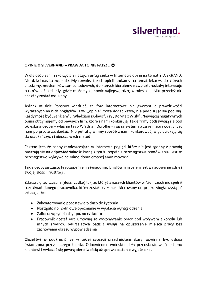 OPINIE O SILVERHAND – PRAWDA TO NIE FAŁSZ…  Wiele osób zanim skorzysta z naszych usług szuka w Internecie opinii na temat SILVERHAND. Nie dziwi nas to zupełnie. My również takich opinii szukamy na temat lekarzy, do których chodzimy, mechaników samochodowych, do których kierujemy nasze czteroślady; interesuje nas również niekiedy, gdzie możemy zamówić najlepszą pizzę w mieście…. Nikt przecież nie chciałby zostać oszukany. Jednak musicie Państwo wiedzieć, że fora internetowe nie gwarantują prawdziwości wyrażanych na nich poglądów. Tzw. „opinię” może dodać każdy, nie podpisując się pod nią. Każdy może być „Zenkiem”, „Władziem z Gliwic”, czy „Dorotą z Wisły”. Najwięcej negatywnych opinii otrzymujemy od pewnych firm, które z nami konkurują. Takie firmy podszywają się pod określoną osobę – właśnie tego Władzia i Dorotkę - i piszą systematycznie nieprawdę, chcąc nam po prostu zaszkodzić. Nie potrafią w inny sposób z nami konkurować, więc uciekają się do oszukańczych i nieuczciwych metod. Faktem jest, że osoby zamieszczające w Internecie pogląd, który nie jest zgodny z prawdą narażają się na odpowiedzialność karną z tytułu popełnia przestępstwa pomówienia. Jest to przestępstwo wykrywalne mimo domniemanej anonimowości. Takie osoby są często tego zupełnie nieświadome. Ich głównym celem jest wyładowanie gdzieś swojej złości i frustracji. Zdarza się też czasami (dość rzadko) tak, że któryś z naszych klientów w Niemczech nie spełnił oczekiwań danego pracownika, który został przez nas skierowany do pracy. Mogła wystąpić sytuacja, że:     Zakwaterowanie pozostawiało dużo do życzenia Nastąpiło np. 2-dniowe opóźnienie w wypłacie wynagrodzenia Zaliczka wpłynęła zbyt późno na konto Pracownik dostał karę umowną za wykonywanie pracy pod wpływem alkoholu lub innych środków odurzających bądź z uwagi na opuszczenie miejsca pracy bez zachowania okresu wypowiedzenia Chcielibyśmy podkreślić, że w takiej sytuacji przedmiotem skargi powinna być usługa świadczona przez naszego klienta. Odpowiednie wnioski należy przedstawić właśnie temu klientowi i wykazać się pewną cierpliwością aż sprawa zostanie wyjaśniona. Osoby, które są rozzłoszczone i zdenerwowane na agencję zatrudnienia SILVERHAND z tego powodu, że współpraca nie układa się tak, jak powinna, uprzejmie prosimy o kierowanie skarg na ręce Pani Natalii Matczak, która jest Partnerem Zarządzającym w firmie SILVERHAND i kierownikiem biura w Poznaniu. Adres e-mail: [email protected] Gwarantujemy adekwatną i szybką reakcję na wszelkiego rodzaju skargi. Prosimy jednak o cierpliwość i wyrozumiałość. Prawdziwe opinie na nasz temat zebraliśmy w zakładce „Opinie pracowników”. Pod każdą wypowiedzią podpisała się osoba, która rzeczywiście została skierowana przez nas do pracy w Niemczech. Pozdrawiamy, Zespół Rekrutacyjny SILVERHAND