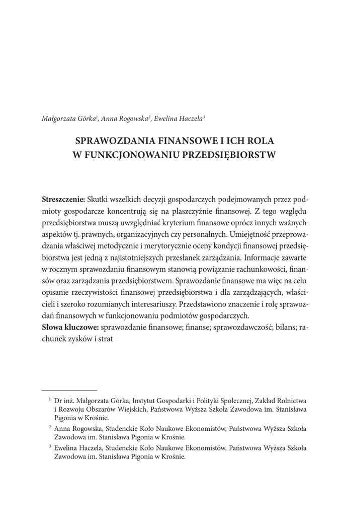Małgorzata Górka1, Anna Rogowska2, Ewelina Haczela3 SPRAWOZDANIA FINANSOWE I ICH ROLA W FUNKCJONOWANIU PRZEDSIĘBIORSTW Streszczenie: Skutki wszelkich decyzji gospodarczych podejmowanych przez podmioty gospodarcze koncentrują się na płaszczyźnie finansowej. Z tego względu przedsiębiorstwa muszą uwzględniać kryterium finansowe oprócz innych ważnych aspektów tj. prawnych, organizacyjnych czy personalnych. Umiejętność przeprowadzania właściwej metodycznie i merytorycznie oceny kondycji finansowej przedsiębiorstwa jest jedną z najistotniejszych przesłanek zarządzania. Informacje zawarte w rocznym sprawozdaniu finansowym stanowią powiązanie rachunkowości, finansów oraz zarządzania przedsiębiorstwem. Sprawozdanie finansowe ma więc na celu opisanie rzeczywistości finansowej przedsiębiorstwa i dla zarządzających, właścicieli i szeroko rozumianych interesariuszy. Przedstawiono znaczenie i rolę sprawozdań finansowych w funkcjonowaniu podmiotów gospodarczych. Słowa kluczowe: sprawozdanie finansowe; finanse; sprawozdawczość; bilans; rachunek zysków i strat Dr inż. Małgorzata Górka, Instytut Gospodarki i Polityki Społecznej, Zakład Rolnictwa i Rozwoju Obszarów Wiejskich, Państwowa Wyższa Szkoła Zawodowa im. Stanisława Pigonia w Krośnie. 2 Anna Rogowska, Studenckie Koło Naukowe Ekonomistów, Państwowa Wyższa Szkoła Zawodowa im. Stanisława Pigonia w Krośnie. 3 Ewelina Haczela, Studenckie Koło Naukowe Ekonomistów, Państwowa Wyższa Szkoła Zawodowa im. Stanisława Pigonia w Krośnie. 1 48 Małgorzata Górka, Anna Rogowska, Ewelina Haczela Wstęp Trafne decyzje gospodarcze wymagają stałego dopływu kompleksowych i rzetelnych informacji gospodarczych. Na ich podstawie podmioty gospodarcze podejmują decyzje strategiczne i operacyjne. Strategiczne obejmujące sytuację gospodarczą, jak i operacyjne dotyczące działalności przedsiębiorstwa. Informacje wykorzystywane w procesach decyzyjnych mają charakter syntetyczny lub analityczny. Informacje syntetyczne są przetwarzane w oparciu o dostępne narzędzia rachunkowa, z kolei analityczne służą do wyjaśniania przyczyn zmian oraz skutków i czynników kształtujących wyniki ekonomiczne przedsiębiorstwa4. Sprawozdawczość finansową można określić jako proces komunikowania informacji finansowych oczekiwanych przez odbiorców. Proces ten wymaga wcześniejszego poprawnego zidentyfikowania zdarzeń gospodarczych wpływających na sytuację finansową i wyniki jednostki gospodarczej oraz wycen skutków tych zdarzeń. Efektem końcowym procesu sprawozdawczości finansowej są sprawozdania finansowe5. Zasadniczym celem sprawozdania finansowego jest wg ustawy o rachunkowości jest rzetelna i jasna prezentacja sytuacji majątkowej i finansowej oraz wyniku finansowego jednostki. Celem publikacji jest przedstawienie roli i znaczenie sprawozdań finansowych w funkcjonowaniu podmiotów gospodarczych. Dokonano analizy literatury z zakresu sprawozdawczości finansowej. Istota, cele i zasady sprawozdań finansowych Informacje finansowe można czerpać z różnych źródeł takich jak: ewidencja księgowa, statystyki przedsiębiorstwa lub dokumentacja księgowa. Jednak podstawowym źródłem informacji jest sprawozdanie finansowe. Z tego powodu analiza danych, które znajdują się w sprawozdaniu finansowym, jest najistotniejszym ujęciem badawczym jakie stosuje się w analizie finansowej Analiza danych nosi nazwę analizy sprawozdań finansowych. Skupia się ona na przetwarzaniu oraz interpretacji danych znajdujących się w sprawozdaniu finansowym. Jej celem R. Nesterowicz, Sprawozdawczość finansowa i jej rola w ocenie wyników działalności przedsiębiorstw [w:]Nierówności społeczne a wzrost gospodarczy, z. 39 (3/2014), Wyd. Uniwersytetu Rzeszowskiego, Rzeszów 2014, s. 320-329. 5 W. Gos, M. Janowicz, P. Mućko, A. Niemiec, W. Skoczylas, P. Waśniewski, Sprawozdania finansowe i ich analiza, Wyd. Stowarzyszenie Księgowych w Polsce, Warszawa 2015. 4 Szanse i bariery rozwoju przedsiębiorczości… 49 jest ocena sytuacji majątkowej, finansowej i wyników, jakie uzyskała jednostka gospodarcza. Jest również podstawą do podejmowania właściwych decyzji ekonomicznych. Daje możliwość kompleksowej oceny sytuacji finansowej jednostki gospodarczej oraz znalezienia potencjalnych nieprawidłowości, które w niej funkcjonują. Analiza sprawozdań finansowych umożliwia również porównanie działalności danej jednostki do innych jednostek6. Według Bednarskiego7 sprawozdawczość finansowa dzieli się na sprawozdawczość rzeczową i sprawozdawczość finansową. Sprawozdawczość finansowa służy przede wszystkim do analizy finansowej, natomiast sprawozdawczość rzeczowa stanowi podstawowe źródło do analizy techniczno-ekonomicznej. Podmioty gospodarcze chcąc kompleksowo ocenić wybrane zagadnienie posługują się zarówno jednym, jak i drugim rodzajem sprawozdawczości. Podstawowym źródłem informacji ekonomicznej dotyczącej działalności jednostki gospodarczej są, obowiązkowe sprawozdania finansowe, które stanowią podstawę do podejmowania decyzji są sprawozdanie finansowe. Według Nowaka8 analiza danych zawartych w sprawozdaniach finansowych nie może być utożsamiana z analizą finansową. Sprawozdania finansowe bowiem wykorzystywane są jako główne, ale nie jedyne źródło danych niezbędnych do analizy finansowej. Z tego względu analiza sprawozdań finansowych ma węższy zakres informacji. Zgodnie z przepisani prawnymi [art. 45] ustawy o rachunkowości9 mówi, iż sprawozdanie składa się z trzech elementów: bilansu, rachunku zysków i strat oraz informacji dodatkowej obejmującej wprowadzenie do sprawozdania finansowego oraz dodatkowe informacje i objaśnienia. Natomiast sprawozdania finansowe podlegające obowiązkowemu badaniu przez biegłego rewidenta, zgodnie z artykułem 64 ustawy o rachunkowości obejmują ponadto rachunek przepływów pieniężnych oraz 