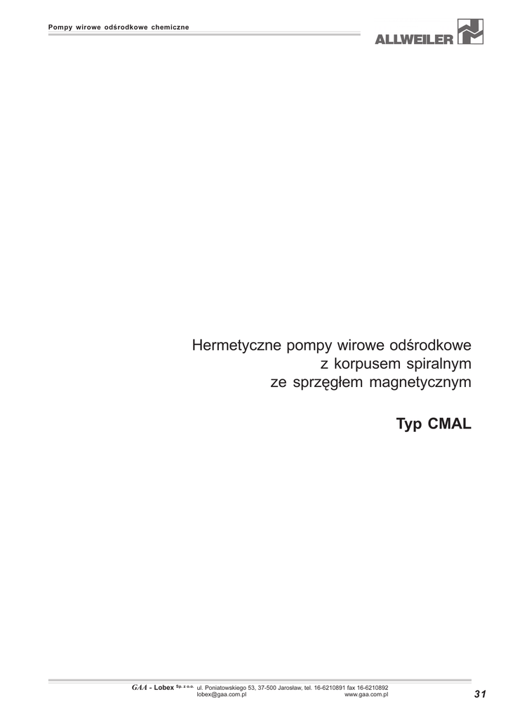 Pompy wirowe odœrodkowe chemiczne Hermetyczne pompy wirowe odœrodkowe z korpusem spiralnym ze sprzêg³em magnetycznym Typ CMAL GAA - Lobex Sp. z o.o. ul. Poniatowskiego 53, 37-500 Jaros³aw, tel. 16-6210891 fax 16-6210892 [email protected] www.gaa.com.pl 31 Pompy wirowe odœrodkowe chemiczne Typ CMAL Zastosowanie Do t³oczenia toksycznych, ³atwo lotnych, wybuchowych, lub w inny sposób zagra¿aj¹cych otoczeniu i œrodowisku cieczy, które wymagaj¹ hermetycznie zamkniêtej, bezuszczelnieniowej pompy. Media te nie mog¹ powodowaæ korozji pompy lub sprzêg³a magnetycznego. Budowa Pompy te s¹ wykonywane jako pompy poziome, jednostopniowe pompy odœrodkowe ze sprzêg³em magnetycznym. Wymiary obudowy oraz parametry hydrauliczne wg norm DIN EN 22858 / ISO 2858. Przeniesienie momentu napêdowego nastêpuje bezdotykowo z zewnêtrznego rotora na wewnêtrzny rotor poprzez stacjonarny garnek rozdzielaj¹cy przy pomocy analogicznie rozmieszczonych magnesów z CoSm. Zewnêtrzny rotor magnetyczny przymocowany jest do wa³u silnika. Wewnêtrzny magnetyczny rotor jest po³¹czony bezpoœrednio z symetrycznym wirnikiem dwustrumieniowym, dziêki czemu si³y poosiowe zostaj¹ sprowadzone do zera. Zastosowanie ³o¿yska poœredniego wirnika redukuje o po³owê wystêpuj¹ce si³y promieniowe w ³o¿yskach œlizgowych. do 80 m3/h H do 55 m t do 150°C pd do 16 bar DN d od 1) CMAL 32 - 200 / 01 110 / 40 - W20 Typ Wielkoœæ Œrednica nominalna króæca t³ocznego 1) Œrednica nominalna wirnika Numer hydrauliczny Rozmiar sprzêg³a magnetycznego Zamontowane magnesy (ca³kowita d³ugoœæ magnesów w mm) Wykonanie materia³owe Oznaczenie typu umieszczone jest na tabliczce znamionowej. Materia³y Nazwa elementu Korpus pompy Wirnik Pokrywa obudowy pompy Wspornik łożyskowy Wał napędowy Pierścień wewnętrzny łożyska ślizgowego Pierścień zewnętrzny łożyska ślizgowego Garnek rozdzielający Parametry eksploatacyjne Q Oznaczenie typu pompy 1) 25 do 50 mm Nr części 102.01 230.01 161.01 330.01 213.01 529.01/02 545.01/02 817.01 Ciœnienie wejœciowe plus ciœnienie wytwarzane przez pompê (przy zerowym przep³ywie) nie mo¿e przekroczyæ ustalonej wartoœci pd. Osi¹galne parametry natê¿enia przep³ywu mo¿na odczytaæ z charakterystyk pompy. Graniczne wartoœci ciœnienia w zale¿noœci od temperatury pompowanego medium Zalecana wydajnoœæ minimalna: Qmin= 0,3 x Qh opt. Nominalna moc sprzêg³a magnetycznego P do 37 kW przy 2900 1/min. D³ugoœci magnesów: 20, 30, 40, 60 oraz 80 mm Powy¿sze parametry nale¿y traktowaæ jako wartoœci pogl¹dowe / teoretyczne. Dok³adne granice zastosowania zostan¹ podane w ofercie b¹dŸ w potwierdzeniu przyjêcia zamówienia do realizacji. Ko³nierze / Przy³¹cza Wymiary ko³nierzy wg DIN EN 1092 - 1, PN16 Napêd Pompy s¹ seryjnie wyposa¿ane w trójfazowy silnika asynchroniczny. Do 2,2 kW 230 /400 V, od 3kW 400/690V, IP55. 32 Wykonanie materiałowe 1.4408 1.4408 1.4571 EN-GJL-250 (GG-25) 1.7139 SSiC SSiC 2.4610 GAA - Lobex Sp. z o.o. ul. Poniatowskiego 53, 37-500 Jaros³aw, tel. 16-6210891 fax 16-6210892 [email protected] www.gaa.com.pl Pompy wirowe odœrodkowe chemiczne Typ CMAL £o¿yskowanie Od strony pompy: ³o¿ysko œlizgowe smarowane transportowanym medium Od strony napêdu: ³o¿ysko toczne smarowane smarem. Demontowanie jednostki wspornika ³o¿yskowego W przypadku zastosowania sprzêg³a elastycznego z tulejk¹ dystansow¹ istnieje mo¿liwoœæ wymontowania jednostki wspornika ³o¿yskowego od strony napêdu bez koniecznoœci demonta¿u pokrywy obudowy pompy oraz napêdu z p³yty podstawy oraz roz³¹czenia króæców od ruroci¹gów. Sprzêg³o wa³u i ochrona przed dotykiem Sprzêg³o elastyczne wa³u wg. DIN 740 z lub bez tulejki dystansowej. Ochrona sprzêg³a jest dostarczana jako ochrona przed dotykiem zgodnie z DIN EN 294 (DIN 31001), wtedy gdy zakres dostawy zawiera pompê, p³ytê podstawy oraz sprzêg³o. Ochrona przeciwwybuchowa Pompa posiada certyfikat zgodny z dyrektyw¹ 94/9/ WG (ATEX 100a) dla urz¹dzeñ grupy II, kategorii 2G. Klasy temperaturowe zgodne z EN 13463-1 w zale¿noœci od temperatury pompowanego medium. Maksymalna temperatura pompowanego medium odpowiadaj¹ca klasie temperaturowej podana jest w tabeli poni¿ej: Grupa wybuchowa II 2G/ c/b II 3G/ c 1) Klasa temperaturowa wg EN 13463-1 T4 T3 T2 T1 Maksymalna temperatura medium 103 °C 150 °C 1) 150 °C 1) 150 °C 1) graniczne temperatury pompy: ochrona przeciwwybuchowa typ b = ochrona ognioszczelna ochrona przeciwwybuchowa typ c = ochrona samoistnie bezpieczna Temperatury wymienione powy¿ej s¹ wspó³zale¿ne z maksymaln¹ temperatur¹ otoczenia 40°C. Uwaga! W przypadku pomp kategorii 2 nadmierny wzrost temperatury na powierzchni pompy, spowodowany mo¿liw¹ awari¹, musi byæ wyeliminowany poprzez zastosowanie urz¹dzeñ monitoruj¹cych. Przy przypadku pracy pompy przy niezmiennych parametrach (przep³ywu, wysokoœci podnoszenia, obrotów, lepkoœci) mo¿emy dostarczyæ na ¿yczenie czujnik kontroli wydajnoœci pompy do wykrywania ewentualnych zaburzeñ pracy pompy. Certyfikat Ex Certyfikat produktu dostarczany jest na ¿yczenie. Wymiennoœæ czêœci Typy CMA i CMAL Czêœci zamieszczone w tabeli posiadaj¹ce takie same numery w kolumnach s¹ czêœciami wymiennymi. Typ Korpus pompy Wirnik 25-160/01 25-200/01 32-160/01 32-200/01 40-160/01 40-200/01 50-160/01 50-200/01 1 2 3 4 5 6 7 8 1 2 3 4 5 6 7 8 Pokrywa korpusu pompy Łożyska ślizgowe Wspornik łożyskowy 1 1 1 GAA - Lobex Sp. z o.o. CMAL Płyta podstawy Wał napędu CMAL 1 2 1 2 1 2 2 2 CMA 1 2 1 2 1 2 1 2 Klosz mocowania napędu Wał napędowy CMA CMA Sprzęgło magnetyczne Zależne od obrotów i typu silnika ul. Poniatowskiego 53, 37-500 Jaros³aw, tel. 16-6210891 fax 16-6210892 [email protected] www.gaa.com.pl 33 Pompy wirowe odœrodkowe chemiczne Typ CMAL 34 Postêp Inteligentne rozwi¹zania konstrukcyjne. Budowa Standardowe czêœci zamienne; niewielka iloœæ czêœci sk³adowych; odporne na wysokie