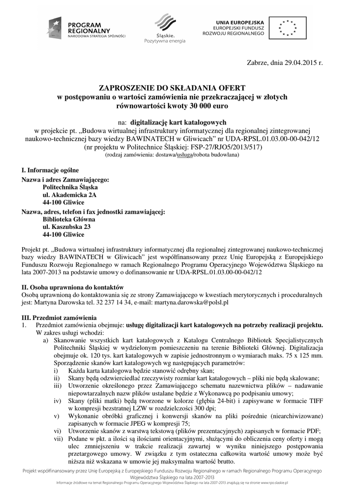 Zabrze, dnia 29.04.2015 r. ZAPROSZENIE DO SKŁADANIA OFERT w postępowaniu o wartości zamówienia nie przekraczającej w złotych równowartości kwoty 30 000 euro na: digitalizację kart katalogowych w projekcie pt. „Budowa wirtualnej infrastruktury informatycznej dla regionalnej zintegrowanej naukowo-technicznej bazy wiedzy BAWINATECH w Gliwicach” nr UDA-RPSL.01.03.00-00-042/12 (nr projektu w Politechnice Śląskiej: FSP-27/RJO5/2013/517) (rodzaj zamówienia: dostawa/usługa/robota budowlana) I. Informacje ogólne Nazwa i adres Zamawiającego: Politechnika Śląska ul. Akademicka 2A 44-100 Gliwice Nazwa, adres, telefon i fax jednostki zamawiającej: Biblioteka Główna ul. Kaszubska 23 44-100 Gliwice Projekt pt. „Budowa wirtualnej infrastruktury informatycznej dla regionalnej zintegrowanej naukowo-technicznej bazy wiedzy BAWINATECH w Gliwicach” jest współfinansowany przez Unię Europejską z Europejskiego Funduszu Rozwoju Regionalnego w ramach Regionalnego Programu Operacyjnego Województwa Śląskiego na lata 2007-2013 na podstawie umowy o dofinansowanie nr UDA-RPSL.01.03.00-00-042/12 II. Osoba uprawniona do kontaktów Osobą uprawnioną do kontaktowania się ze strony Zamawiającego w kwestiach merytorycznych i proceduralnych jest: Martyna Darowska tel. 32 237 14 34, e-mail: [email protected] III. Przedmiot zamówienia 1. Przedmiot zamówienia obejmuje: usługę digitalizacji kart katalogowych na potrzeby realizacji projektu. W zakres usługi wchodzi: a) Skanowanie wszystkich kart katalogowych z Katalogu Centralnego Bibliotek Specjalistycznych Politechniki Śląskiej w wydzielonym pomieszczeniu na terenie Biblioteki Głównej. Digitalizacja obejmuje ok. 120 tys. kart katalogowych w zapisie jednostronnym o wymiarach maks. 75 x 125 mm. Sporządzenie skanów kart katalogowych wg następujących parametrów: i) Każda karta katalogowa będzie stanowić odrębny skan; ii) Skany będą odzwierciedlać rzeczywisty rozmiar kart katalogowych – pliki nie będą skalowane; iii) Utworzenie określonego przez Zamawiającego schematu nazewnictwa plików – nadawanie niepowtarzalnych nazw plików ustalane będzie z Wykonawcą po podpisaniu umowy; iv) Skany (pliki matki) będą tworzone w kolorze (głębia 24-bit) i zapisywane w formacie TIFF w kompresji bezstratnej LZW w rozdzielczości 300 dpi; v) Wykonanie obróbki graficznej i konwersji skanów na pliki pośrednie (niearchiwizowane) zapisanych w formacie JPEG w kompresji 75; vi) Utworzenie skanów z warstwą tekstową (plików prezentacyjnych) zapisanych w formacie PDF; vii) Podane w pkt. a ilości są ilościami orientacyjnymi, służącymi do obliczenia ceny oferty i mogą ulec zmniejszeniu w trakcie realizacji zawartej w wyniku niniejszego postępowania przetargowego umowy. W związku z tym ostateczna całkowita wartość umowy może być niższa niż wskazana w umowie jej maksymalna wartość brutto. Projekt współfinansowany przez Unię Europejską z Europejskiego Funduszu Rozwoju Regionalnego w ramach Regionalnego Programu Operacyjnego Województwa Śląskiego na lata 2007-2013 Informacje źródłowe na temat Regionalnego Programu Operacyjnego Województwa Śląskiego na lata 2007-2013 znajdują się na stronie www.rpo.slaskie.pl 2. b) Indeksacja w siedzibie Wykonawcy wszystkich skanów kart katalogowych z automatycznym rozpoznaniem tekstu bez weryfikacji: i) Utworzenie 4 następujących indeksów dla wszystkich obrazów kart katalogowych: sygnatura, autor, tytuł, lokalizacja (na podstawie wykazu dostarczonego przez Zamawiającego); ii) Utworzenie plików XML dla wszystkich plików obrazów kart zawierający zestaw wprowadzanych indeksów. c) Archiwizacja plików na dyskach zewnętrznych udostępnionych przez Zamawiającego: i) Będące efektem skanowania, stanowiące pliki master (tzw. matki”); ii) Poddane obróbce graficznej, stanowiące pliki prezentacyjne. d) Dostarczenie oprogramowania bazodanowego do prezentacji zeskanowanego katalogu kartkowego i instalacja oprogramowania na serwerze Biblioteki Głównej. Cechy i funkcjonalności oprogramowania: i) Oprogramowanie przeznaczone do przechowywania, przeglądania i wyszukiwania kart katalogowych, umożliwiające publiczny dostęp w Internecie do prezentowanych obrazów kart katalogowych; ii) Oprogramowanie bazujące na technologii PHP +MySQL, pracujące w środowiskach Windows i Linx. iii) Oprogramowanie z interfejsem webowym zawierające moduły dla użytkownika oraz administratora i/lub pracownika; iv) Webowy interfejs użytkownika zapewniający: swobodny dostęp użytkowników do zasobów katalogowych przez przeglądarkę WWW, bez konieczności instalowania dodatkowego oprogramowania po stronie stacji klienckich; dostępność 2 wersji językowych (polskiej i angielskiej); czytelne wyświetlanie obrazów kart w układzie liter alfabetu i strukturze fizycznej katalogu oraz wskazanych przez Zamawiającego indeksów; możliwość wyświetlenia poszczególnych kart w powiększeniu; możliwość przechodzenia do poszczególnych podstruktur katalogu; możliwość przechodzenia do wprost wskazanych zakresów czy podzakresów katalogu; możliwość wyszukiwania obiektów według wprowadzonych indeksów; chroniony hasłem dostęp do funkcji administracyjnych poprzez interfejs administracyjny; v) Webowy interfejs administratora zapewniający: możliwość wprowadzenia nowych oraz modyfikację istniejących indeksów wyszukiwawczych; zdalnego (przez Internet) tworzenia użytkowników oraz grup użytkowników o różnych poziomach uprawnień; wykonywania i odzyskiwania kopii bezpieczeństwa; ręcznego usuwania i wprowadzania obrazów kart do katalogu, wraz z automatyczną zmianą porządku kart; możliwość generowania statystyk z użytkowania oprogramowania; vi) Oprogramowanie daje możliwość modyfikacji parametrów wyświetlania interfejsu (kolorystyka, układ logiczny, czcionka, itp.) i dostosowywania elementów graficznych i wizualnych (tj. logo) do bieżących potrzeb Za
