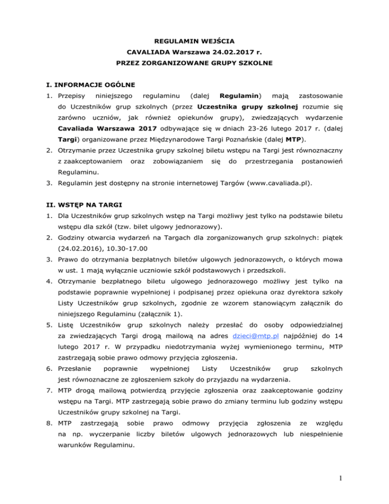 REGULAMIN WEJŚCIA CAVALIADA Warszawa 24.02.2017 r. PRZEZ ZORGANIZOWANE GRUPY SZKOLNE I. INFORMACJE OGÓLNE 1. Przepisy niniejszego regulaminu (dalej Regulamin) mają zastosowanie do Uczestników grup szkolnych (przez Uczestnika grupy szkolnej rozumie się zarówno uczniów, jak również opiekunów grupy), zwiedzających wydarzenie Cavaliada Warszawa 2017 odbywające się w dniach 23-26 lutego 2017 r. (dalej Targi) organizowane przez Międzynarodowe Targi Poznańskie (dalej MTP). 2. Otrzymanie przez Uczestnika grupy szkolnej biletu wstępu na Targi jest równoznaczny z zaakceptowaniem oraz zobowiązaniem się do przestrzegania postanowień Regulaminu. 3. Regulamin jest dostępny na stronie internetowej Targów (www.cavaliada.pl). II. WSTĘP NA TARGI 1. Dla Uczestników grup szkolnych wstęp na Targi możliwy jest tylko na podstawie biletu wstępu dla szkół (tzw. bilet ulgowy jednorazowy). 2. Godziny otwarcia wydarzeń na Targach dla zorganizowanych grup szkolnych: piątek (24.02.2016), 10.30-17.00 3. Prawo do otrzymania bezpłatnych biletów ulgowych jednorazowych, o których mowa w ust. 1 mają wyłącznie uczniowie szkół podstawowych i przedszkoli. 4. Otrzymanie bezpłatnego biletu ulgowego jednorazowego możliwy jest tylko na podstawie poprawnie wypełnionej i podpisanej przez opiekuna oraz dyrektora szkoły Listy Uczestników grup szkolnych, zgodnie ze wzorem stanowiącym załącznik do niniejszego Regulaminu (załącznik 1). 5. Listę Uczestników grup szkolnych należy przesłać do osoby odpowiedzialnej za zwiedzających Targi drogą mailową na adres [email protected] najpóźniej do 14 lutego 2017 r. W przypadku niedotrzymania wyżej wymienionego terminu, MTP zastrzegają sobie prawo odmowy przyjęcia zgłoszenia. 6. Przesłanie poprawnie wypełnionej Listy Uczestników grup szkolnych jest równoznaczne ze zgłoszeniem szkoły do przyjazdu na wydarzenia. 7. MTP drogą mailową potwierdzą przyjęcie zgłoszenia oraz zaakceptowanie godziny wstępu na Targi. MTP zastrzegają sobie prawo do zmiany terminu lub godziny wstępu Uczestników grupy szkolnej na Targi. 8. MTP zastrzegają sobie prawo odmowy przyjęcia zgłoszenia ze względu na np. wyczerpanie liczby biletów ulgowych jednorazowych lub niespełnienie warunków Regulaminu. 1 9. Każdej grupie szkolnej musi towarzyszyć co najmniej jeden opiekun z ramienia szkoły na każdych dwudziestu uczniów Opiekun będący przedstawicielem szkoły, ponosi pełną odpowiedzialność za bezpieczeństwo, działania i szkody wyrządzone przez swoich podopiecznych na terenie Targów. Opiekun zobowiązany jest do zapoznania uczniów z niniejszym Regulaminem i egzekwowania jego zasad. 10. Wszyscy Uczestnicy grup szkolnych mają obowiązek zwiedzania Targów z przewodnikiem grupy, którego zapewniają MTP. MTP zastrzegają sobie prawo do łączenia grup w większe bądź dzielenia na mniejsze. Uczestnicy grup szkolnych zobowiązani są do zastosowania się i przestrzegania poleceń Przewodnika grupy. 11. Przewidziany czas obecności na wydarzeniu wynosi około 1 godziny. 12. Wraz z potwierdzeniem przyjęcia zgłoszenia przesyłana będzie drogą mailową zaakceptowana godzina wstępu na Targi dla grupy szkolnej. III. PRZEPISY PORZĄDKOWE 1. Zabronione jest wnoszenie na teren Targów broni palnej, amunicji, materiałów wybuchowych oraz przedmiotów, których używanie może zagrażać bezpieczeństwu osób przebywających na terenach targowych. 2. Zabronione jest wprowadzanie na teren Targów zwierząt. 3. Na terenie Targów Uczestników grupy szkolnej obowiązuje zakaz: 1) palenia tytoniu z wyjątkiem miejsc specjalnie wyznaczonych dla palaczy na zewnątrz pawilonów wystawowych; 2) spożywania alkoholu oraz zażywania środków odurzających; 3) prowadzenia reklamowych, jakichkolwiek zbiórek promocyjnych oraz pieniężnych, agitacyjnych nie działań akwizycyjnych, uzgodnionych z MTP, jak również żadnych działań niezgodnych z obowiązującymi przepisami prawa; 4) używania otwartego ognia; 5) posiadania substancji chemicznych, pożarowo niebezpiecznych, w tym butli z gazami palnymi, w tym również typu turystycznego. 4. W razie podejrzenia wniesienia przez Uczestników grup szkolnych na teren Targów alkoholu, środków odurzających lub niebezpiecznych przedmiotów, jak również nieprzestrzegania pozostałych zakazów wskazanych w ust. 2 MTP zastrzegają sobie prawo do natychmiastowego wyprowadzenia Uczestnika wraz z całą grupą szkolną z terenu MTP (bez możliwości ponownego wejścia na teren Targów) i wezwania Policji. 5. Do dyspozycji Uczestników grup szkolnych udostępniona zostanie szatnia. 6. Targi nie ponoszą odpowiedzialności za szkodę na mieniu Uczestników powstałą z winy Uczestników grup szkolnych lub osoby trzeciej, będącej wynikiem np. braku należytego nadzoru własnego mienia. 7. MTP nie ponoszą odpowiedzialności za mienie wniesione na teren MTP, za wyjątkiem rzeczy pozostawionych w szatni MTP. 2 8. MTP nie ponoszą odpowiedzialności za szkodę na osobie spowodowaną przez osobę trzecią lub z winy poszkodowanego. 9. Zabrania się wstępu na teren Targów osobom nietrzeźwym, znajdującym się w stanie odurzenia lub zachowującym się w sposób, który zagraża bezpieczeństwu innych osób zwiedzających oraz wystawców, zakłóca porządek publiczny, narusza ogólnie przyjęte normy zachowania w miejscach publicznych. 10. MTP zastrzegają sobie prawo do odmowy wpuszczenia na teren Targów osoby, o której mowa w pkt. 9 powyżej. 11. Uczestnicy grup szkolnych obowiązani będą przestrzegać poleceń porządkowych wydawanych przez MTP w czasie trwania Targów. IV. SKARGI I REKLAMACJE Skargi i reklamacje Uczestników grup szkolnych rozpatruje Kierownik Wydziału Komunikacji, Kierownik Sekcji Obsługi lub Kierownik Sekcji Komunikacji. Skargi powinny być składane w formie mailowej pod adresem [email protected] lub w czasie trwania Targów osobiście u opiekuna klienta w holach wejściowych. V. 