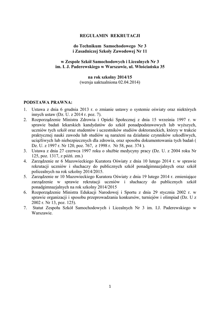 REGULAMIN REKRUTACJI do Technikum Samochodowego Nr 3 i Zasadniczej Szkoły Zawodowej Nr 11 w Zespole Szkół Samochodowych i Licealnych Nr 3 im. I. J. Paderewskiego w Warszawie, ul. Włościańska 35 na rok szkolny 2014/15 (wersja uaktualniona 02.04.2014) PODSTAWA PRAWNA: 1. 2. 3. 4. 5. 6. 7. Ustawa z dnia 6 grudnia 2013 r. o zmianie ustawy o systemie oświaty oraz niektórych innych ustaw (Dz. U. z 2014 r. poz. 7). Rozporządzenie Ministra Zdrowia i Opieki Społecznej z dnia 15 września 1997 r. w sprawie badań lekarskich kandydatów do szkół ponadpodstawowych lub wyższych, uczniów tych szkół oraz studentów i uczestników studiów doktoranckich, którzy w trakcie praktycznej nauki zawodu lub studiów są narażeni na działanie czynników szkodliwych, uciążliwych lub niebezpiecznych dla zdrowia, oraz sposobu dokumentowania tych badań ( Dz. U. z 1997 r. Nr 120, poz. 767, z 1998 r. Nr 58, poz. 374 ). Ustawa z dnia 27 czerwca 1997 roku o służbie medycyny pracy (Dz. U. z 2004 roku Nr 125, poz. 1317, z późń. zm.) Zarządzenie nr 6 Mazowieckiego Kuratora Oświaty z dnia 10 lutego 2014 r. w sprawie rekrutacji uczniów i słuchaczy do publicznych szkół ponadgimnazjalnych oraz szkół policealnych na rok szkolny 2014/2015. Zarządzenie nr 10 Mazowieckiego Kuratora Oświaty z dnia 19 lutego 2014 r. zmieniające zarządzenie w sprawie rekrutacji uczniów i słuchaczy do publicznych szkół ponadgimnazjalnych na rok szkolny 2014/2015 Rozporządzenie Ministra Edukacji Narodowej i Sportu z dnia 29 stycznia 2002 r. w sprawie organizacji i sposobu przeprowadzania konkursów, turniejów i olimpiad (Dz. U z 2002 r. Nr 13, poz. 125). Statut Zespołu Szkół Samochodowych i Licealnych Nr 3 im. I.J. Paderewskiego w Warszawie. 1 I. REKRUTACJA W ROKU SZKOLNYM 2014/2015 PROWADZONA BĘDZIE DO NASTEPUJACYCH KLAS PIERWSZYCH DLA MŁODZIEŻY NA PODBUDOWIE GIMNAZJUM : Technikum Samochodowe Nr 3 (cykl nauczania – 4 lata) – trzy zawody Zawód: TECHNIK POJAZDÓW SAMOCHODOWYCH 311513 (trzy oddziały) Kształcenie w zawodzie technik pojazdów samochodowych trwa cztery lata. Nauka odbywa się w bardzo dobrze wyposażonych pracowniach szkolnych (m.in. najnowocześniejsza pracownia diagnostyki pojazdów samochodowych), z wykorzystaniem własnych warsztatów szkolnych, bazy renomowanych serwisów samochodowych (zajęcia specjalistyczne i 4 – tygodniowe praktyki zawodowe) oraz własnego Ośrodka Szkolenia Kierowców z nowymi samochodami do nauki jazdy, w którym uczniowie są bezpłatnie przygotowywani do uzyskania prawa jazdy. Absolwenci przygotowywani są do: 1) diagnozowania stanu technicznego pojazdów samochodowych; 2) obsługiwania i naprawiania pojazdów samochodowych; 3) organizowania i nadzorowania obsługi pojazdów samochodowych Są kreatywni i mobilni zawodowo, dodatkowo przygotowywani są do: uzyskania prawa jazdy kat. B aktywnego funkcjonowania na zmieniającym się rynku pracy, prowadzenia własnej działalności gospodarczej, korzystania ze specjalistycznych programów komputerowych. Podczas nauki w szkole uczeń w tym zawodzie może przystępować do egzaminów potwierdzających kwalifikacje w zawodzie, które przeprowadzane są w Ośrodku Egzaminacyjnym w naszej szkole (kwalifikacje oznaczone są symbolami: M.18, M. 12, M.42) Nr Nazwa kwalifikacji Termin egzaminu Diagnozowanie i naprawa podzespołów i zespołów pod koniec semestru K1 pojazdów samochodowych ( M.18 ) pierwszego w III klasie Diagnozowanie oraz naprawa elektrycznych pod koniec semestru K2 i elektronicznych układów pojazdów samochodowych drugiego w III klasie (M. 12) Organizacja i prowadzenie procesu obsługi pojazdów pod koniec semestru K3 samochodowych (M.42) pierwszego w IV klasie 2 Absolwent technikum, który zdał egzaminy potwierdzające kwalifikacje w zawodzie w zakresie trzech kwalifikacji oznaczonych symbolami M.18, M.12, M.42 i posiada świadectwo ukończenia technikum otrzymuje tytuł technika pojazdów samochodowych. Absolwent technikum po ukończeniu szkoły otrzymuje świadectwo ukończenia szkoły i może przystąpić do egzaminu maturalnego i kontynuowania nauki w szkole wyższej. W programie nauczania dla zawodu technik pojazdów samochodowych przewidziano nauczanie matematyki i fizyki na poziomie rozszerzonym oraz przedmiotu historia i społeczeństwo, jako przedmiotu uzupełniającego 1. Klasa 1 PZM – technik pojazdów samochodowych 311513, klasa pod patronatem Zarządu Okręgowego Polskiego Związku Motorowego w Warszawie z autoryzowanym programem nauczania; język angielski , język niemiecki lub język rosyjski kształcenie w zawodzie obejmuje 3 kwalifikacje: M.18 - Diagnozowanie i naprawa podzespołów i zespołów pojazdów samochodowych M.12 - Diagnozowanie oraz naprawa elektrycznych i elektronicznych układów pojazdów samochodowych M.42 - Organizacja i prowadzenie procesu obsługi pojazdów samochodowych Wskazane szczególne zainteresowania motoryzacją i sportami motoryzacyjnymi. Program wzbogacony jest o zagadnienia ratownictwa medycznego i bezpieczeństwa w ruchu drogowym. Uczniowie uczestniczą w dodatkowych zajęciach z ratownikami medycznymi, spotkaniach z mistrzami sportów samochodowych, otrzymują bezpłatne wejściówki na rajdy i targi motoryzacyjne, biorą udział w konkursach bezpiecznej jazdy, doskonalą technikę jazdy. 2. Klasa I PW – technik pojazdów samochodowych 311513, klasa pod patronatem Wydziału Samochodów i Maszyn Roboczych Politechniki Warszawskiej z autoryzowanym programem nauczania; język angielski , język niemiecki lub język rosyjski kształcenie w zawodzie obejmuje 3 kwalifikacje: M.18 - Diagnozowanie samochodowych i naprawa podzespołów i zespołów pojazdów M.12 - Diagnozowanie oraz naprawa elektrycznych i elektronicznych układów pojazdów samochodowych M.42 - Organizacja i prowadzenie procesu obsługi pojazdów samochodowych 3 Wskazane szczególnie zainteresowania techniczno-motoryzacyjne, zdolności matematyczno-fizyczne. Program wzbogacony o