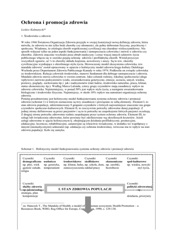 Ochrona i promocja zdrowia Lesław Kulmatycki* 1. Środowisko a zdrowie W roku 1946 Światowa Organizacja Zdrowia przyjęła w swojej konstytucji nową definicję zdrowia, która mówiła, że zdrowie to nie tylko brak choroby czy ułomności, ale pełny dobrostan fizyczny, psychiczny i społeczny. Wiadomo, że etiologia chorób współczesnej cywilizacji ma charakter wieloczynnikowy. Nie sposób wskazać tylko na jeden aspekt funkcjonowania i samopoczucia człowieka i mówić o zdrowiu czy chorobie. Zdrowie znacznie wychodzi poza obręb medycyny i coraz więcej innych sektorów życia publicznego włącza się w szeroko pojętą ochronę zdrowia i profilaktykę chorób. Wśród przyczyn wszystkich zgonów, aż ¾ to choroby układu krążenia, nowotwory i urazy. Są to tzw. choroby cywilizacyjne wynikające z określonego stylu życia. Mowoczesny model ekosystemu człowieka, tzw. mandala zdrowia1 został opracowany w oparciu o holistyczny model zdrowia kręgu kultury Dalekiego Wschodu przez Departament Zdrowia Publicznego Kanady w roku 1974. Podkreśla on związki człowieka ze środowiskiem. Relacja człowiek-środowisko, stanowi fundament dla dobrego samopoczucia i zdrowia. Mandala zdrowia stawia człowieka w swoim centrum. Jako członek rodziny, lokalnej społeczności ulega wpływowi zarówno podsystemów (ciało, uwarunkowania genetyczne, emocje, uczucia, umysł, wiedza, postawy, poglądy, zachowania itp.) jak i nadsystemów (inni ludzie, środowisko naturalne, praca, klimat, status ekonomiczny itp.). Według Marca Lalonda, cztery grupy czynników mają zasadniczy wpływ na zdrowie człowieka. Najistotniejszy, w ponad 50% jest wpływ stylu życia, a następnie uwarunkowania biologiczne i środowisko fizyczne. Najmniejszy, w około 10% wpływ ma natomiast organizacja ochrony zdrowia. Poniżej przedstawiony jest holistyczny model funkcjonowania systemu ochrony zdrowia i promocji zdrowia (schemat 1) w którym zaznaczone są trzy zasadnicze i powiązane ze sobą elementy. Element I, to stan zdrowia populacji, zdeterminowany 8 grupami czynników z których najważniejsze znaczenie ma grupa czynników społeczno-kulturowych. Element II, to rzeczywiste potrzeby zdrowotne danej populacji. Z jednej strony definiowane są przez pacjentów i są to te potrzeby na zaspokojenie których pacjenci oczekują. Z drugiej strony potrzeby zdrowotne realnie zaspokajane przez system ochrony zdrowia. Element III, to usługi lub świadczenia zdrowotne, które powinny być zdefiniowane wg określonych kryteriów. Jeżeli usługi zdrowotne w ujęciu holistycznym tj. obejmującym działania profilaktyczne, promocyjne, edukacyjne, lecznicze, rehabilitacyjne, sanatoryjne są właściwie świadczone, w dodatku we współpracy z innymi (niemedycznymi) sektorami (np. edukacja czy ochrona środowiska), wówczas ma to wpływ na stan zdrowia populacji. Koło się zamyka. Schemat 1. Holistyczny model funkcjonowania systemu ochrony zdrowia i promocji zdrowia Czynniki demograficzne np. płeć, wiek gęstość zaludn. religia Czynniki służby zdrowia np. jakość usług, strategia, plan kompetencje 1 Czynniki osobnicze np. genetyka, temperament Czynniki Czynniki środowiskowe siedliskowe np. klimat, hałas, np. szkoła, dom, zanieczyszczenia zakład pracy Czynniki ekonomiczne np. zarobki, bezrobocie I. STAN ZDROWIA POPULACJI Czynniki społ-kulturowe np. wiedza, nawyki styl życia, Czynniki polityki zdrowotnej np. działania, priorytety za: Hancock T., The Mandala of Health; a model of the human ecosystem; Health Promotion – a Resources Book, WHO, Reg Office for Europe, Copenhagen, 1990, s. 129-138. 2 zdrowie to nie tylko brak choroby czy ułomności, ale pełny dobrostan fizyczny, psychiczny i społeczny II. RZECZYWISTE POTRZEBY ZDROWOTNE oczekiwane przez świadczeniobiorców zaspakajane przez świadczeniodawców III. USŁUGI (ŚWIADCZENIA) ZDROWOTNE Podstawowe kryteria organizacja usług np. system ubezpieczeń planowanie, ewaluacja 2. dostępność usług np. równomierność rozmieszczenia jakość skuteczność usług usług np. profesjonalizm np. satysfakcja pracowników pacjenta kompleksowość usług np. wybór, ciągłość Ochrona i promocja zdrowia na Dolnym Śląsku i we Wrocławiu - diagnoza Nie istnieje nowoczesna ochrona zdrowia bez długofalowej polityki zdrowotnej państwa, bez szerokiego programu dostosowywanie ochrony zdrowia do zmieniających się warunków życia i potrzeb zdrowotnych obywateli. Zdrowie zbiorowości wielkomiejskiej jest pojęciem abstrakcyjnym, gdyż nie można precyzyjnie określić stanu zdrowia zbiorowości. Wszelkie oceny takiego stanu wymykają się precyzyjniejszym opisom. Składają się na to trzy główne powody. Po pierwsze zdrowie zbiorowości nie jest sumą zdrowia poszczególnych jej obywateli, dlatego też trudno je szacować na podstawie samopoczucia poszczególnych jednostek. Po drugie zdrowie zbiorowości oceniamy pośrednio, na podstawie metod epidemiologicznych czy socjologicznych a nie bezpośrednio i w związku z tym obraz interpretowany może być już nieaktualny czy zmieniony. Po trzecie, obraz zbiorowości interpretowany jest na podstawie wskaźników negatywnych dotyczących zdrowia (np. zachorowalność czy śmiertelność) a nie wskaźników pozytywnych (np. ilość lat przeżytych bez choroby czy bez niepełnosprawności). Powoduje to, że identyfikowany stan zdrowotności określonej populacji służy do przewidywania ewentualnych trendów i zmian w ochronie zdrowia oraz tworzenie przede wszystkim programów zdrowotnych przeciwdziałającym trendom negatywnym (profilaktyka) z pominięciem programów wzmacniających trendy pozytywne (promocja zdrowia). Poddając analizie dane dotyczące zachorowań w 2000 roku na terenie Dolnego Śląska i miasta Wrocławia wynika, że największym zagrożeniem zdrowotnym (największa liczba zachorowań i zgonów)związana jest z chorobami układu krążenia.. Zgony z powodu tych chorób wynoszą 54% ogólnej liczby zg
