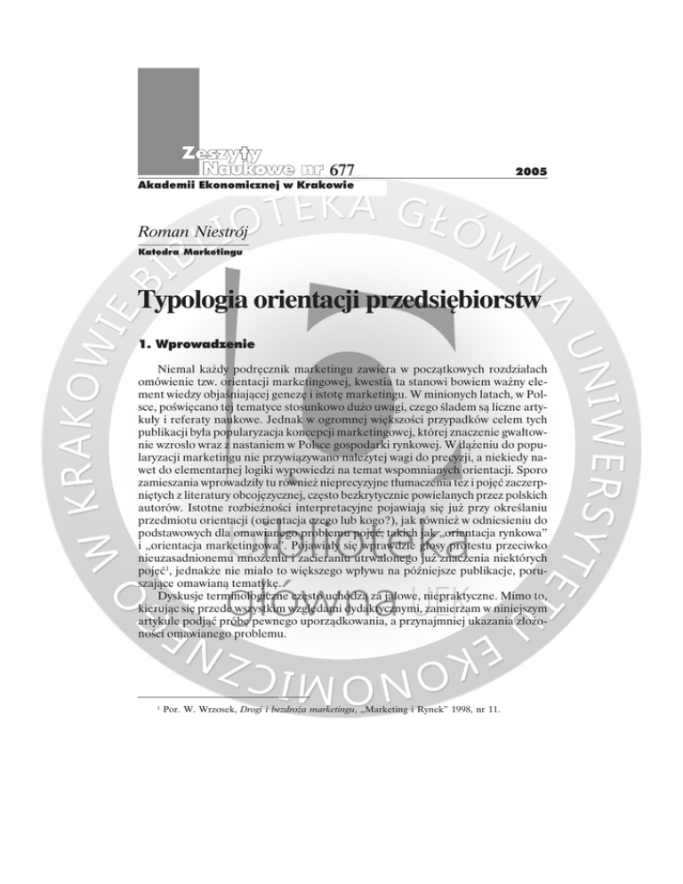 677 2005 Akademii Ekonomicznej w Krakowie Roman Niestrój Katedra Marketingua Typologia orientacji przedsiębiorstw 1. Wprowadzenie Niemal każdy podręcznik marketingu zawiera w początkowych rozdziałach omówienie tzw. orientacji marketingowej, kwestia ta stanowi bowiem ważny element wiedzy objaśniającej genezę i istotę marketingu. W minionych latach, w Polsce, poświęcano tej tematyce stosunkowo dużo uwagi, czego śladem są liczne artykuły i referaty naukowe. Jednak w ogromnej większości przypadków celem tych publikacji była popularyzacja koncepcji marketingowej, której znaczenie gwałtownie wzrosło wraz z nastaniem w Polsce gospodarki rynkowej. W dążeniu do popularyzacji marketingu nie przywiązywano należytej wagi do precyzji, a niekiedy nawet do elementarnej logiki wypowiedzi na temat wspomnianych orientacji. Sporo zamieszania wprowadziły tu również nieprecyzyjne tłumaczenia tez i pojęć zaczerpniętych z literatury obcojęzycznej, często bezkrytycznie powielanych przez polskich autorów. Istotne rozbieżności interpretacyjne pojawiają się już przy określaniu przedmiotu orientacji (orientacja czego lub kogo?), jak również w odniesieniu do podstawowych dla omawianego problemu pojęć, takich jak „orientacja rynkowa” i „orientacja marketingowa”. Pojawiały się wprawdzie głosy protestu przeciwko nieuzasadnionemu mnożeniu i zacieraniu utrwalonego już znaczenia niektórych pojęć1, jednakże nie miało to większego wpływu na późniejsze publikacje, poruszające omawianą tematykę. Dyskusje terminologiczne często uchodzą za jałowe, niepraktyczne. Mimo to, kierując się przede wszystkim względami dydaktycznymi, zamierzam w niniejszym artykule podjąć próbę pewnego uporządkowania, a przynajmniej ukazania złożoności omawianego problemu. 1 Por. W. Wrzosek, Drogi i bezdroża marketingu, „Marketing i Rynek” 1998, nr 11. 8 Roman Niestrój 2. Przedmiot orientacji Możliwości funkcjonowania i rozwoju przedsiębiorstwa są określone przez szereg czynników wewnętrznych i zewnętrznych, które bezpośrednio lub pośrednio wpływają na jego pozycję rynkową i wyniki finansowe. Znaczenie poszczególnych czynników, zarówno ze względu na siłę, jak i długotrwałość ich oddziaływania, może być różne. Zarządy skupiają więc uwagę przede wszystkim na tych czynnikach, które w największym stopniu oddziałują na egzystencję i rozwój danej jednostki gospodarczej. Uznanie określonego czynnika za wiodący pociąga za sobą odpowiednie ogólne ukierunkowanie przedsiębiorstwa. Każdorazowa ocena (prognoza) stanu tego czynnika stanowi punkt wyjścia do określenia celów, strategii działania i wszelkich dalszych decyzji gospodarczych. W źródłach literaturowych, opisujących proces ewolucji orientacji przedsiębiorstw, najczęściej wymienia się cztery fazy tego procesu, określane jako: orientacja produkcyjna, orientacja sprzedażowa (dystrybucyjna), orientacja na klienta (marketingowa) oraz orientacja społeczna lub strategiczna. W określeniach tych słowo „orientacja” oznacza to samo co „ukierunkowanie” lub „ogólne nastawienie”. Natychmiast jednak pojawia się pytanie, czego lub kogo owo ukierunkowanie dotyczy. Według F. Misiąga określenie „orientacja marketingowa” odnosi się do wewnętrznych warunków firmy i obejmuje głównie postawy, predyspozycje i umiejętności personelu. „Kluczowym składnikiem tej orientacji są postawy pracowników, które można określić jako trwały, a zarazem pozytywny stosunek do marketingu jako koncepcji działań rynkowych”2. Najczęściej jednak autorzy nie wyjaśniają tej kwestii. Z kontekstu wypowiedzi można wnioskować, że zdecydowana większość autorów odnosi omawiane określenia do przedsiębiorstwa (firmy) lub zarządzania rozumianego zarówno jako proces, jak i system organizacyjny3. Zdarzają się jednak również inne odniesienia, np. w podręczniku europejskim Ph. Kotlera wskazuje się, że poszczególne typy orientacji stanowią „pogląd”, „filozofię”, „koncepcję” odnoszące się do zarządzania4. Z kolei w innym popularnym podręczniku mówi się nie o zmieniających się orientacjach przedsiębiorstw, lecz o „erach” wyróżnionych w procesie ewolucji orientacji rynkowej. Prowadzi to do zaskakującej konkluzji wskazującej na orientację rynkową jako najwyższy etap ewolucji … orientacji rynkowej5. 2 F. Misiąg, Bariery procesu kształtowania orientacji marketingowej, „Handel Wewnętrzny” 2003, nr 2. 3 Por. m.in.: L. Garbarski, I. Rutkowski, W. Wrzosek, Marketing. Punkt zwrotny nowoczesnej firmy, PWE, Warszawa 2000; J. Lambin, Strategiczne zarządzanie marketingowe, Wydawnictwo Naukowe PWN, Warszawa 2001; F. Misiąg, Metodyczne problemy badania orientacji marketingowej, „Marketing i Rynek” 2001, nr 10; K. Przybyłowski, S. Hartley, R. Kerin, W. Rudelius, Marketing, Dom Wydawniczy ABC, Warszawa 1998. 4 Ph. Kotler, G. Armstrong, J. Saunders, V. Wong, Marketing. Podręcznik europejski, PWE, Warszawa 2002, s. 49. Typologia orientacji przedsiębiorstw 9 Podobne do wyżej wskazanego nieporozumienia, spotykane również w innych źródłach, wynikają najczęściej z podwójnego znaczenia terminu „marketing”, który oznacza zarówno określoną sferę działań przedsiębiorczych (funkcję), odnoszącą się do rynku zbytu każdego przedsiębiorstwa, jak i tzw. koncepcję marketingową (marketing concept), stanowiącą ukształtowany w latach sześćdziesiątych minionego stulecia zbiór zasad i reguł określających sposób działania i miejsce marketingu w przedsiębiorstwie. Mając więc na myśli marketing w rozumieniu funkcjonalnym, można oczywiście mówić o jego ewolucji, zarówno jak idzie o zakres czynnościowy, jak i znaczenie decyzji i działań marketingowych w zarządzaniu przedsiębiorstwem. W tym rozumieniu marketing podlegał ewolucji również w czasach poprzedzających pojawienie się koncepc